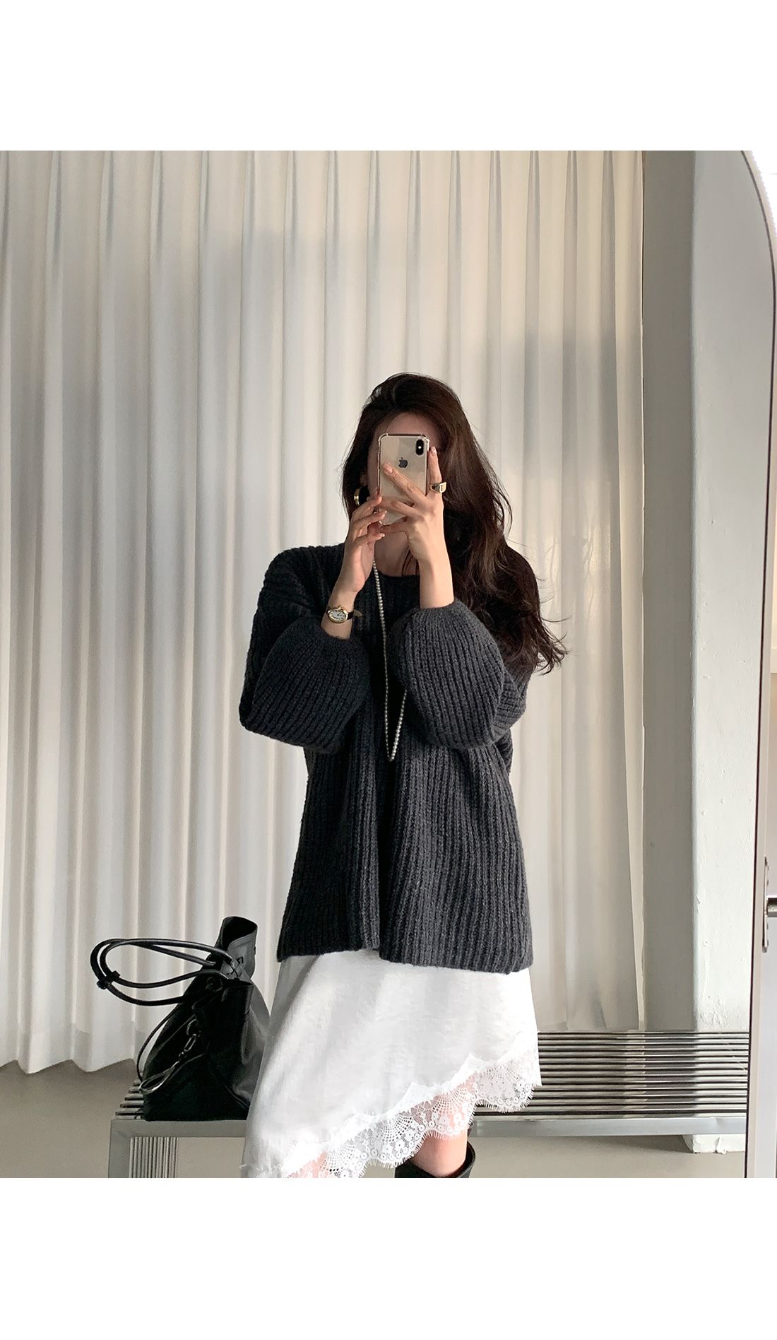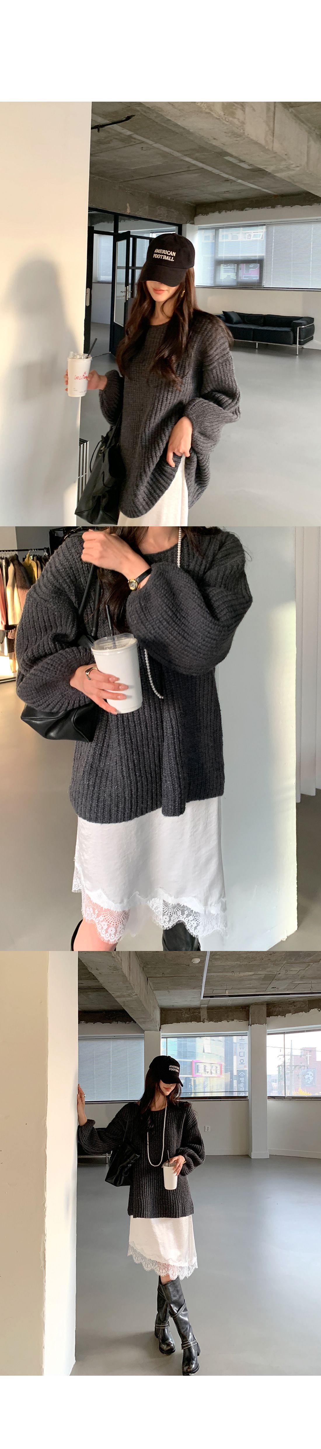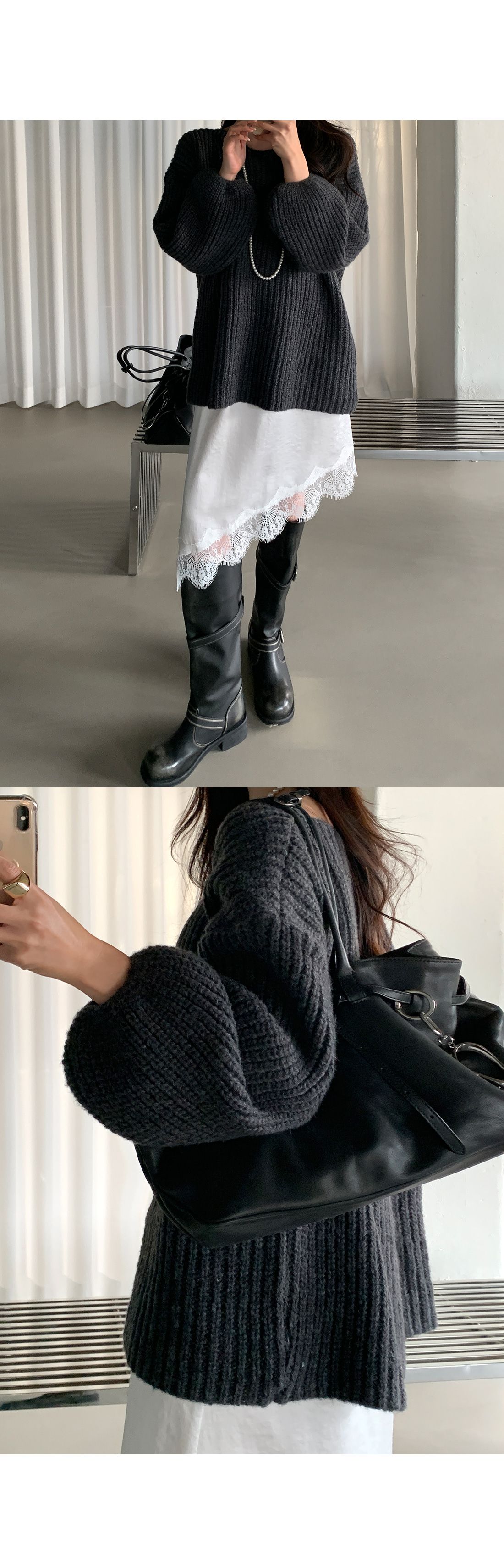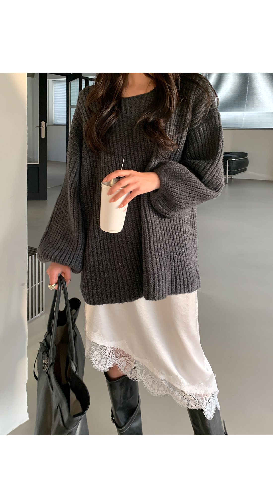 粗鉤針編織/U領/落肩寬袖/寬鬆長版 - 休閒居家渡假簡約百搭素面泡泡袖長版上衣長袖針織衫針織上衣長袖上衣短洋裝寬鬆大尺碼上衣長版上衣奶油色黑色深灰色