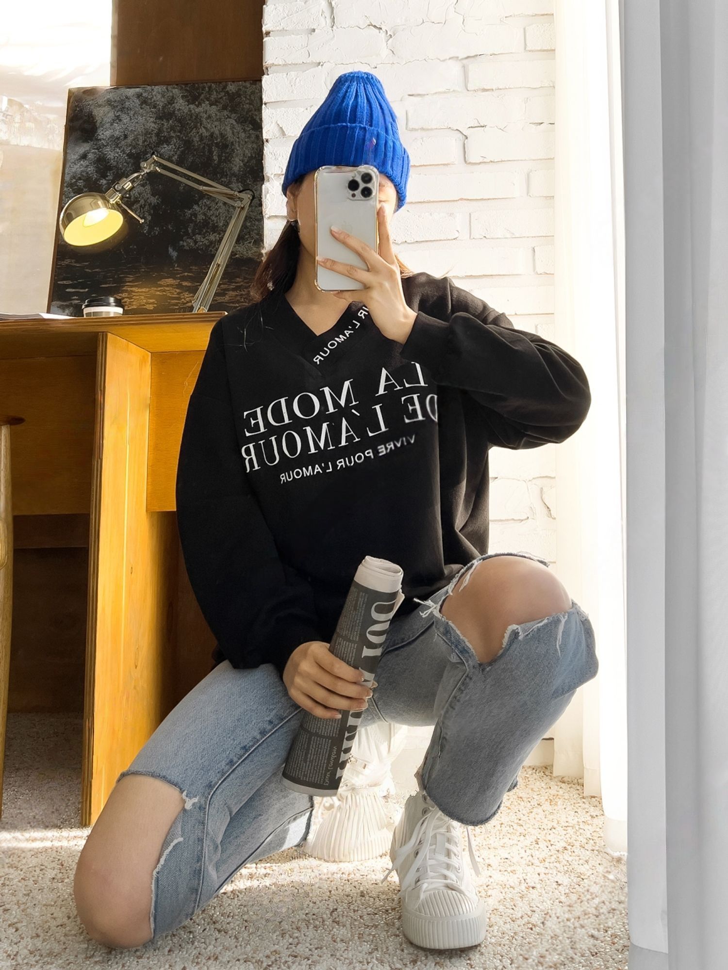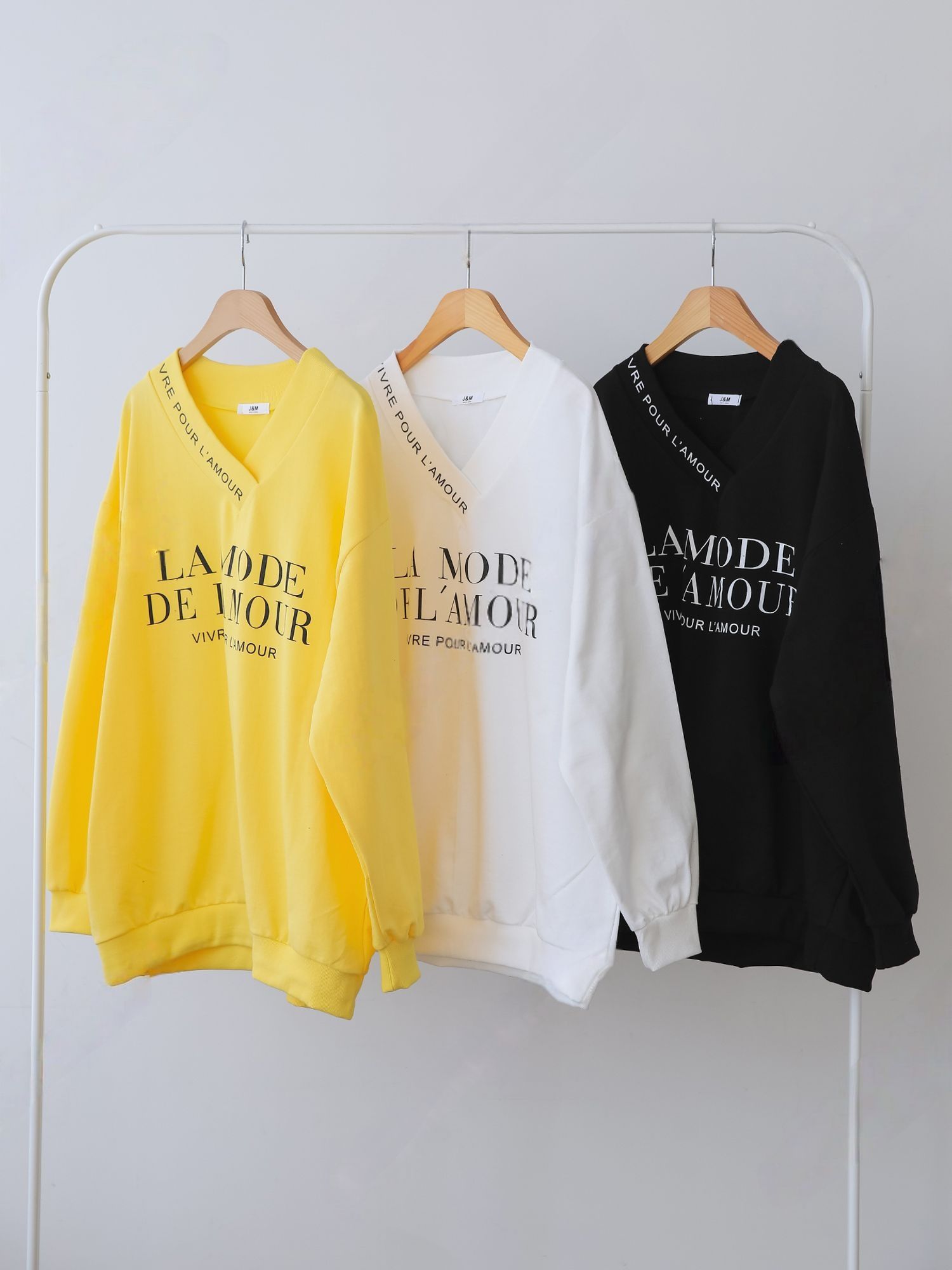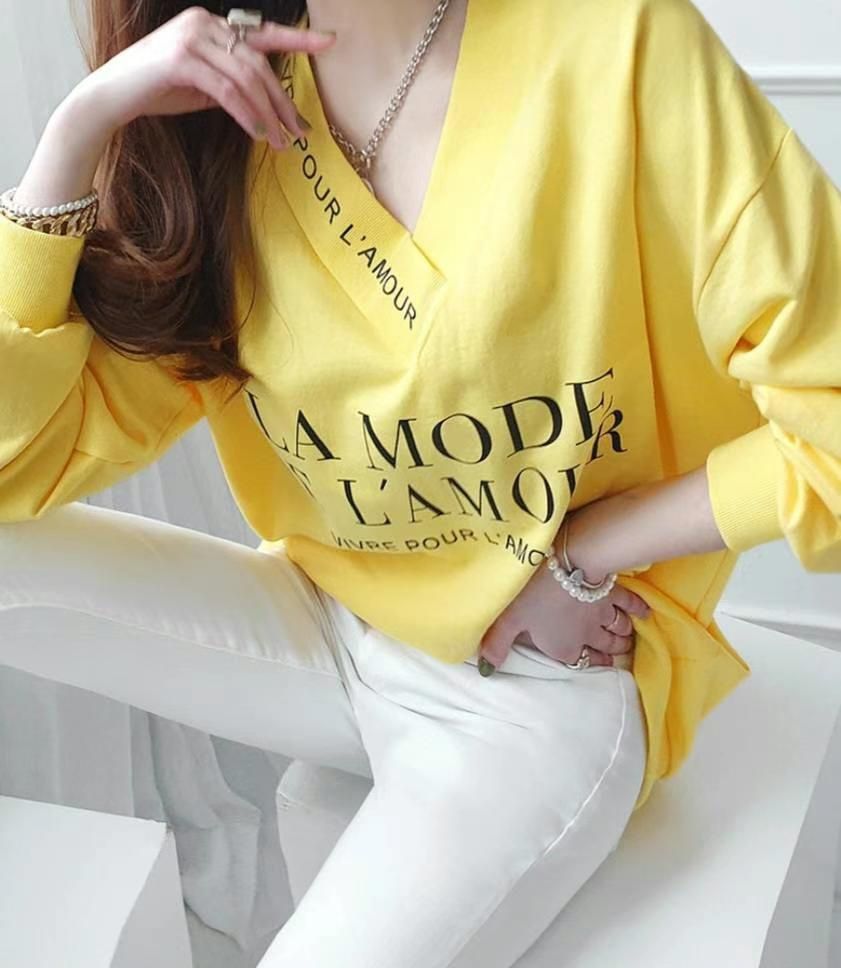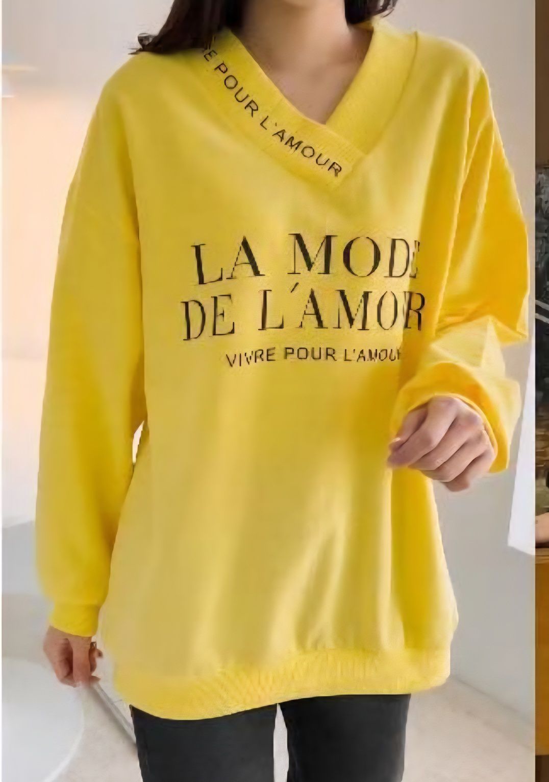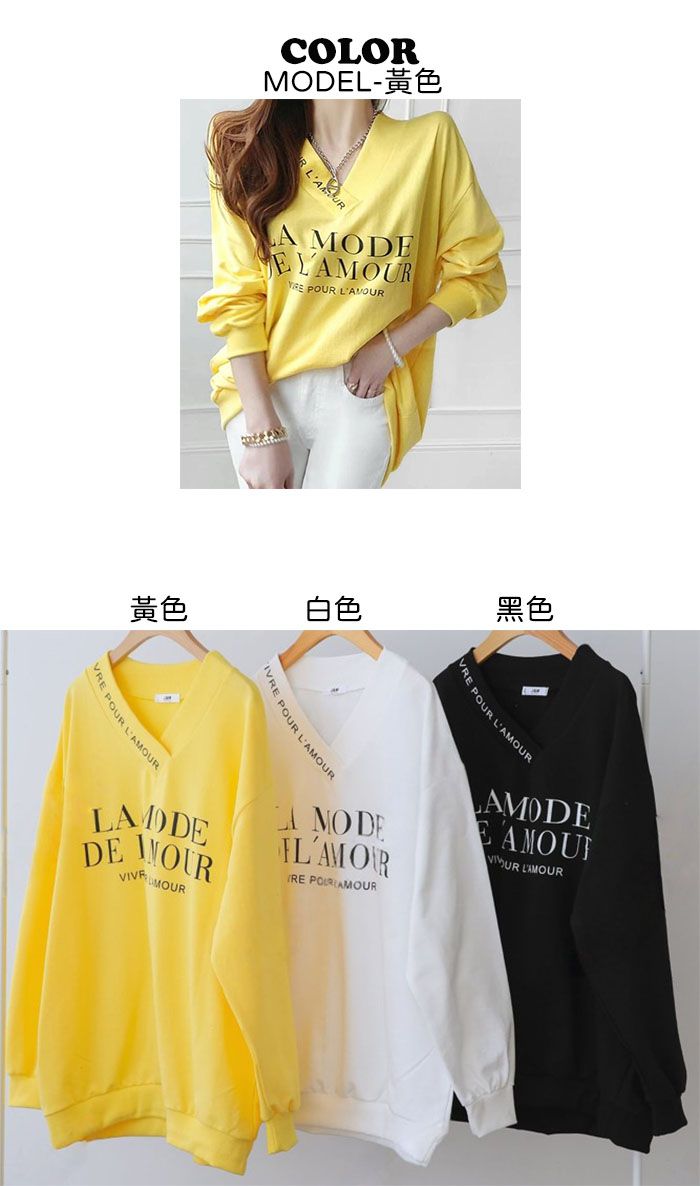 膠印字母/好氣色/交叉V領/寬鬆/落肩長袖/毛圈棉 - 休閒居家英文字母T恤深V領字母上衣長袖上衣T恤黃色黑色白色