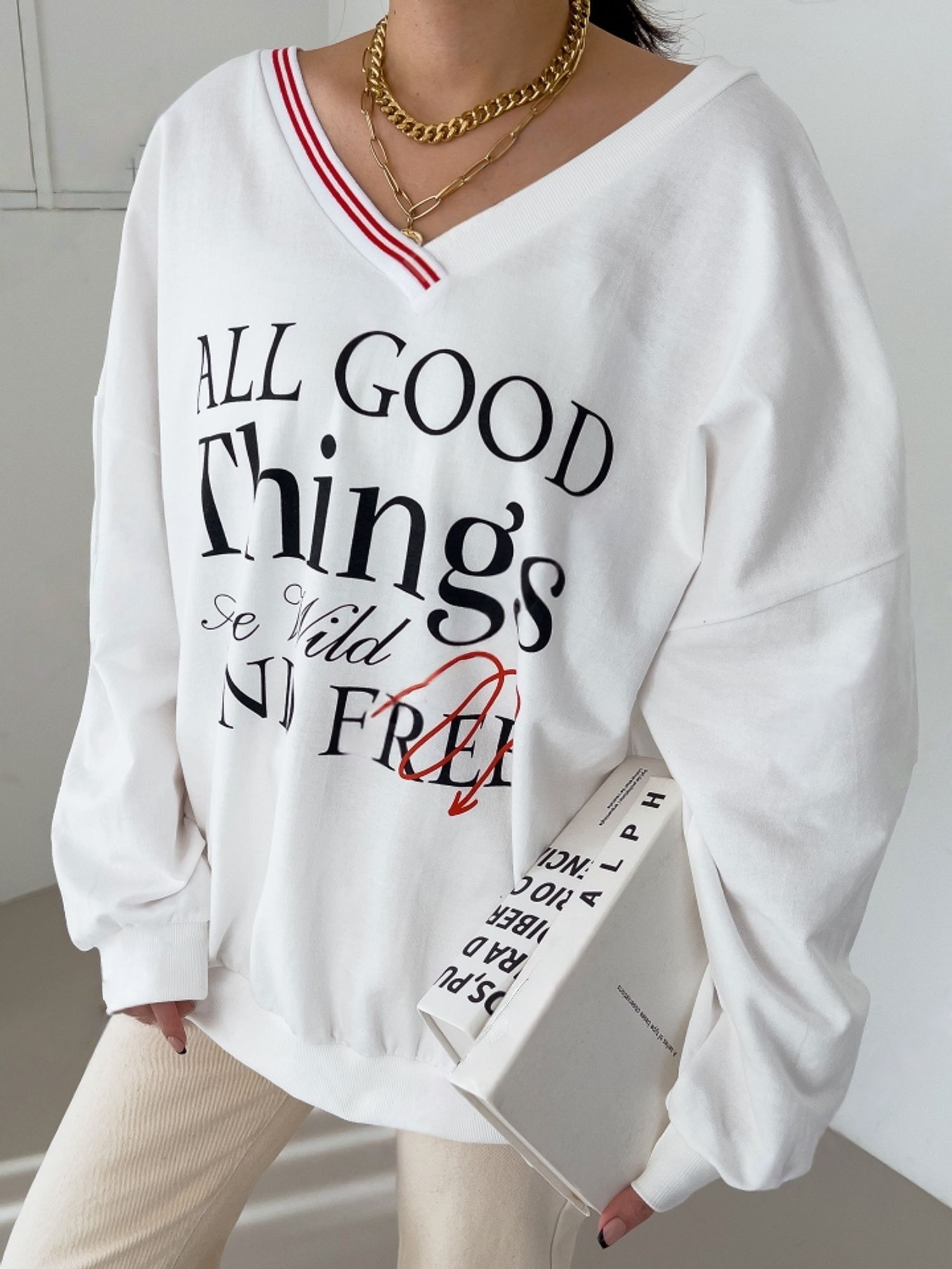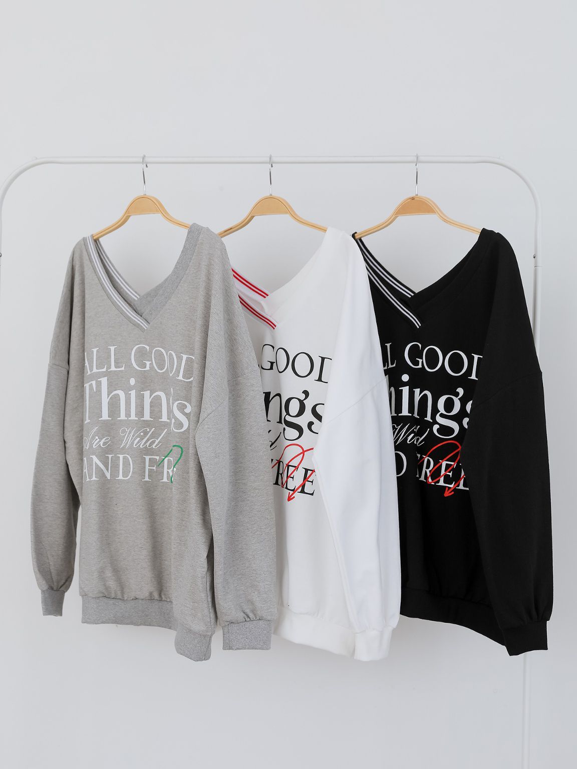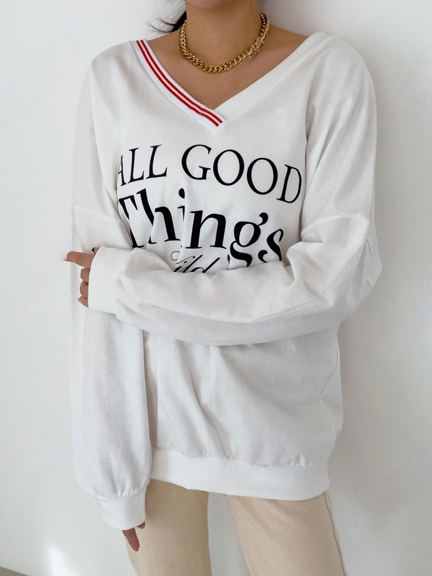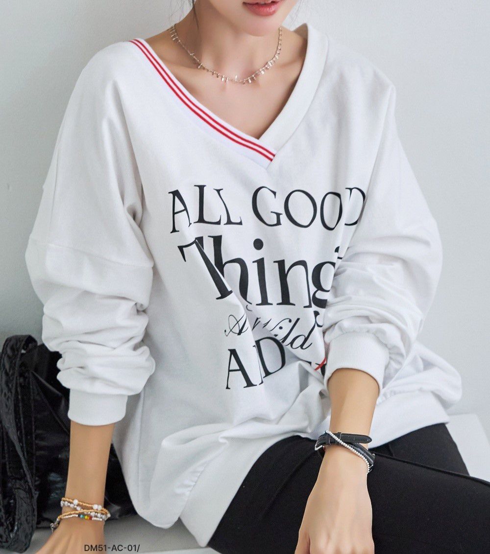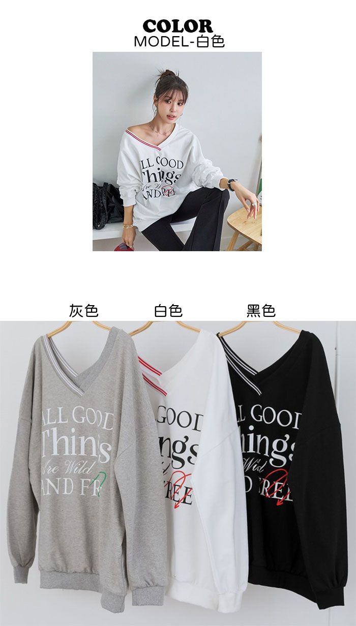 膠印字母/條紋滾邊V領/斜肩/寬鬆長版/內裏毛圈棉 - 休閒居家英文字母上衣字母T恤TEE條紋V領上衣長袖T恤長袖上衣寬鬆大尺碼上衣長版上衣白色灰色黑色