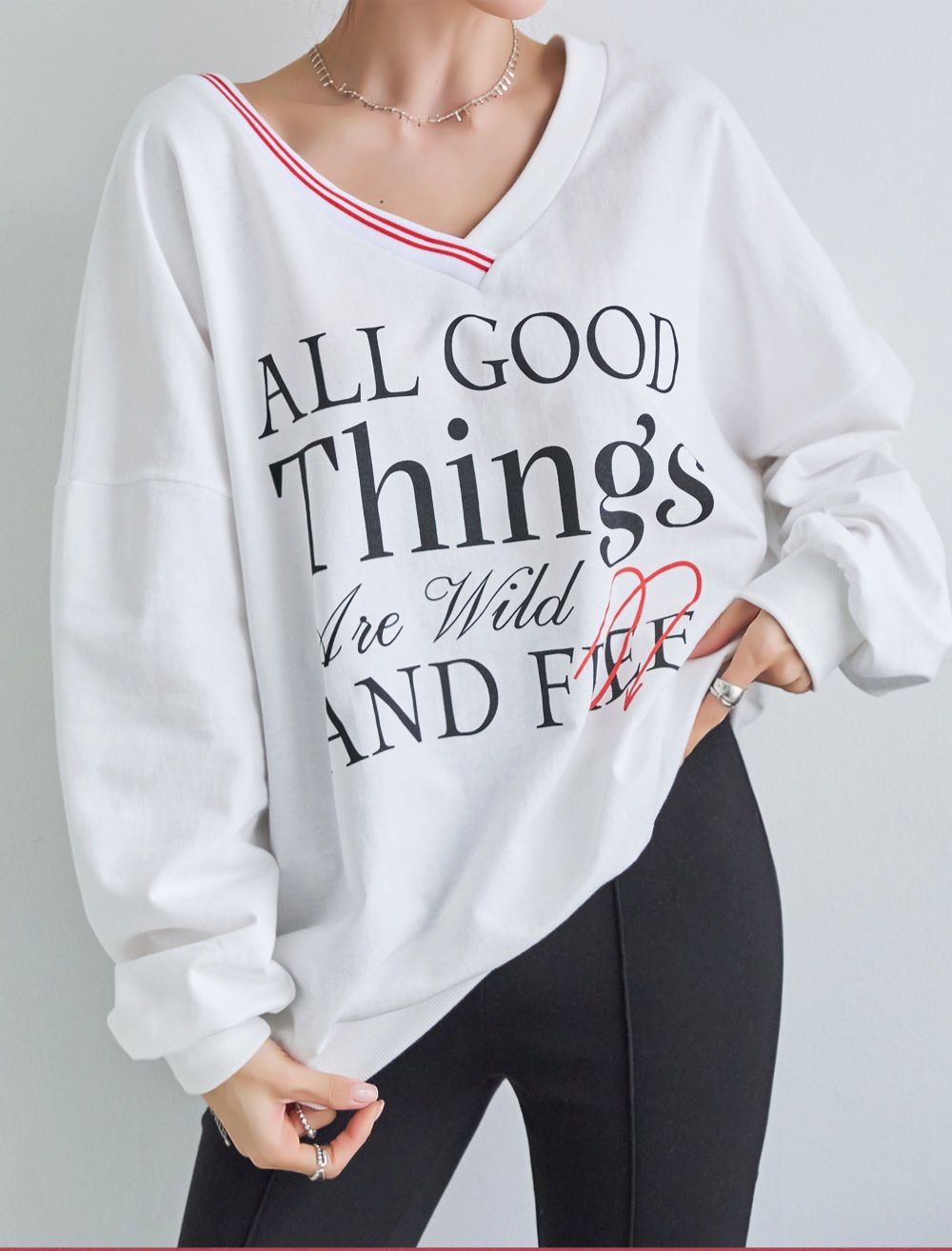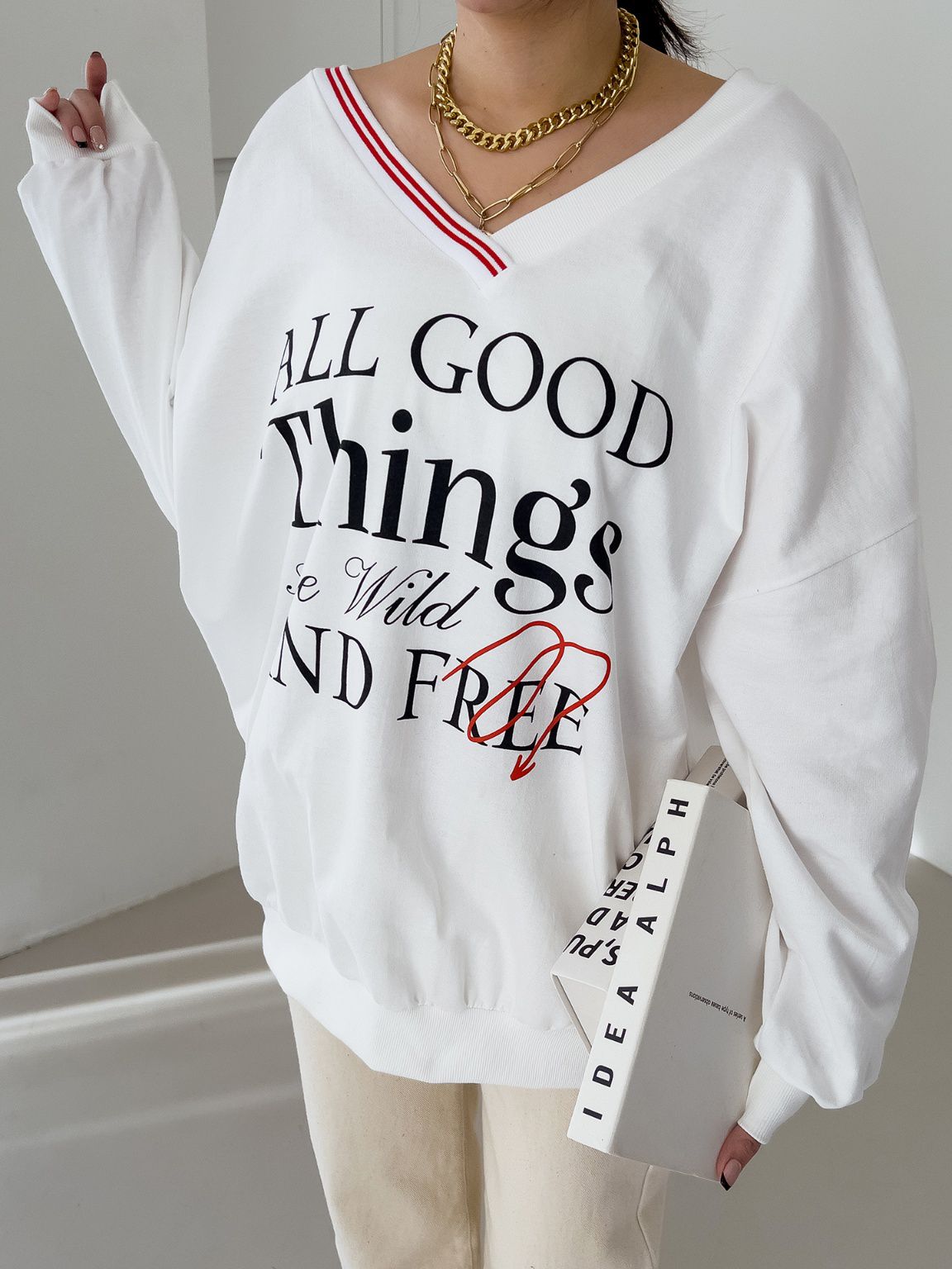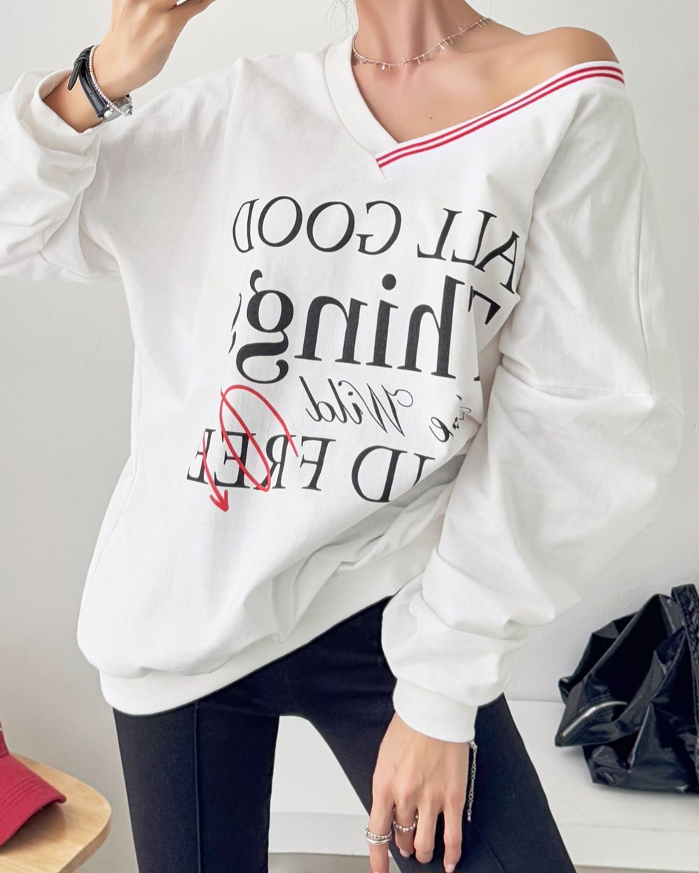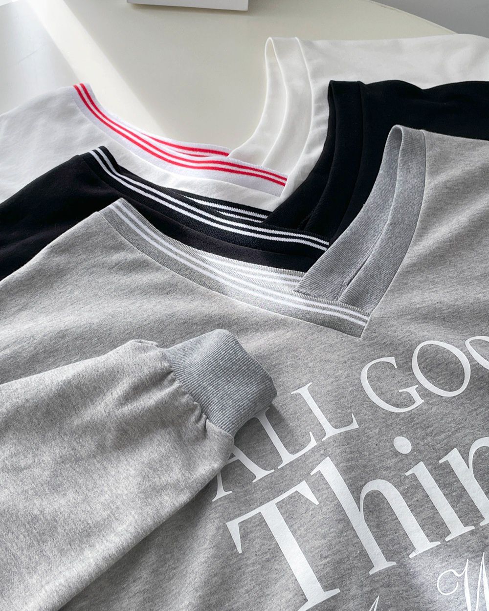 膠印字母/條紋滾邊V領/斜肩/寬鬆長版/內裏毛圈棉 - 休閒居家英文字母上衣字母T恤TEE條紋V領上衣長袖T恤長袖上衣寬鬆大尺碼上衣長版上衣白色灰色黑色