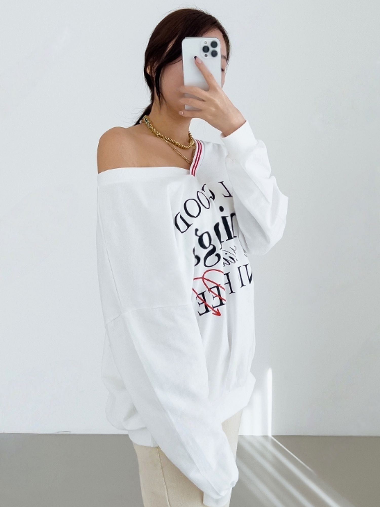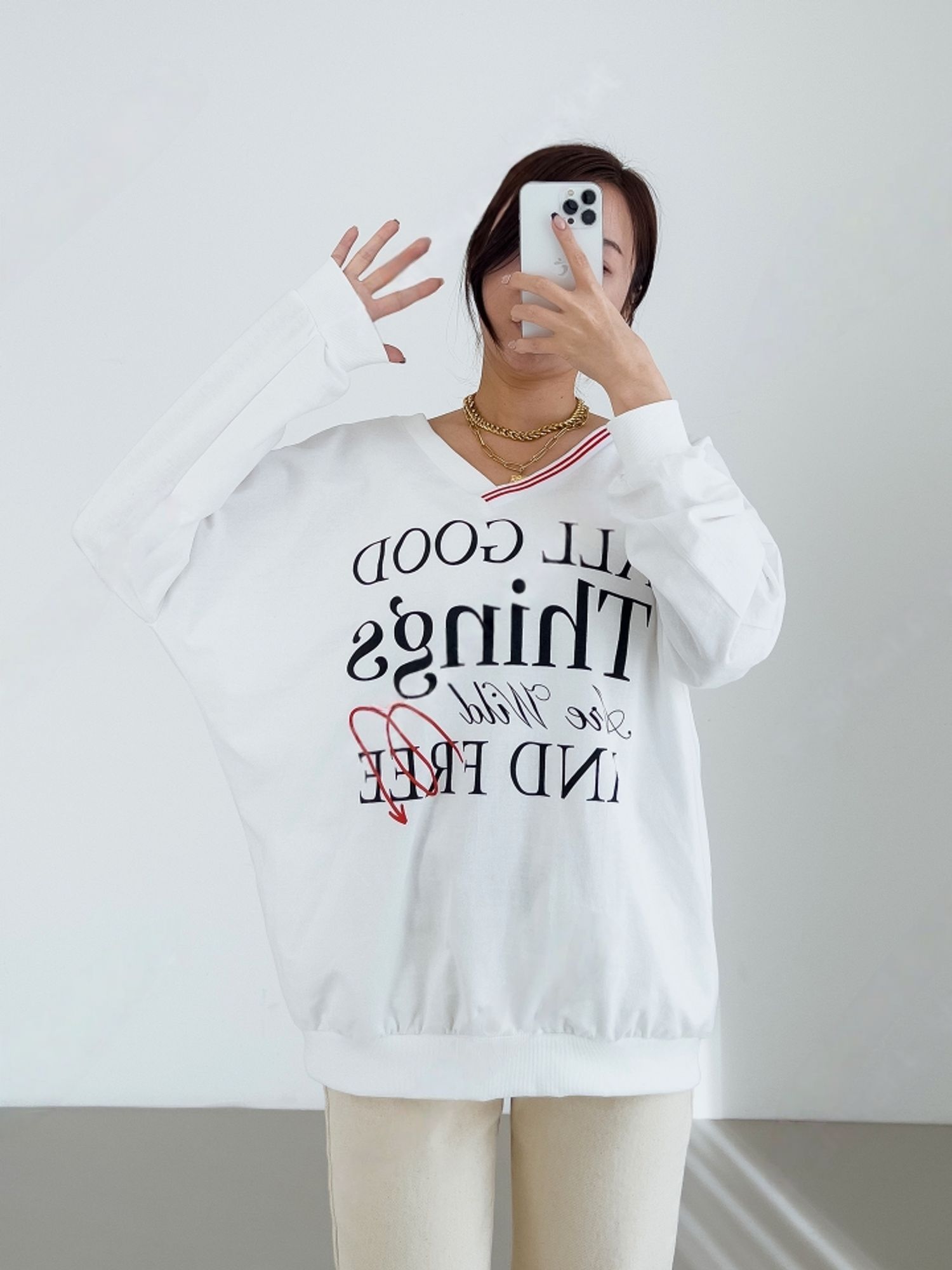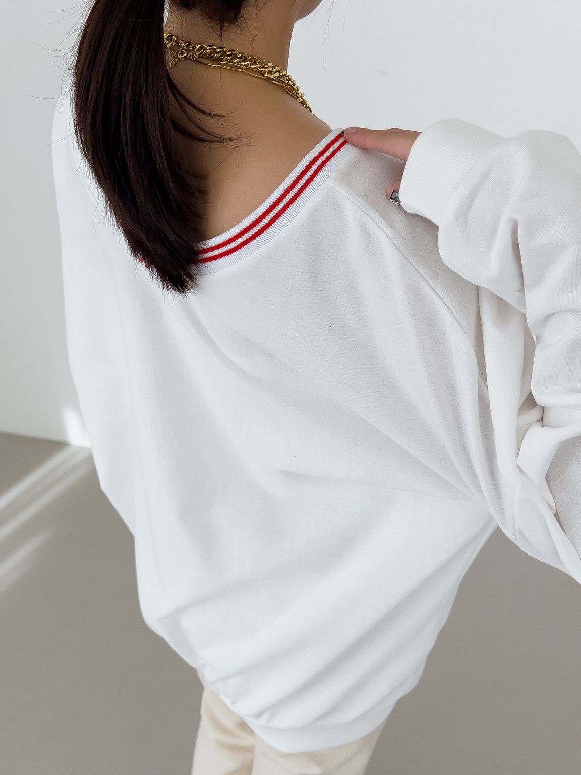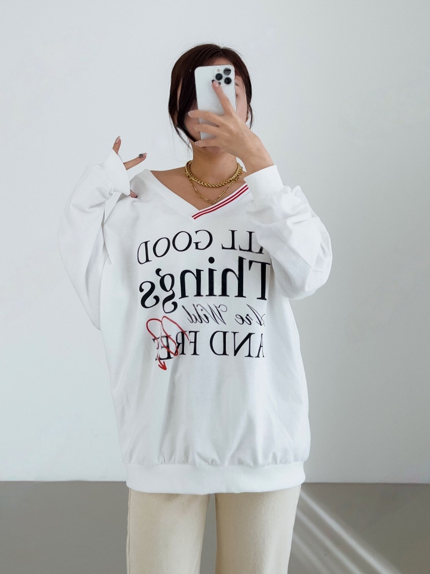 膠印字母/條紋滾邊V領/斜肩/寬鬆長版/內裏毛圈棉 - 休閒居家英文字母上衣字母T恤TEE條紋V領上衣長袖T恤長袖上衣寬鬆大尺碼上衣長版上衣白色灰色黑色