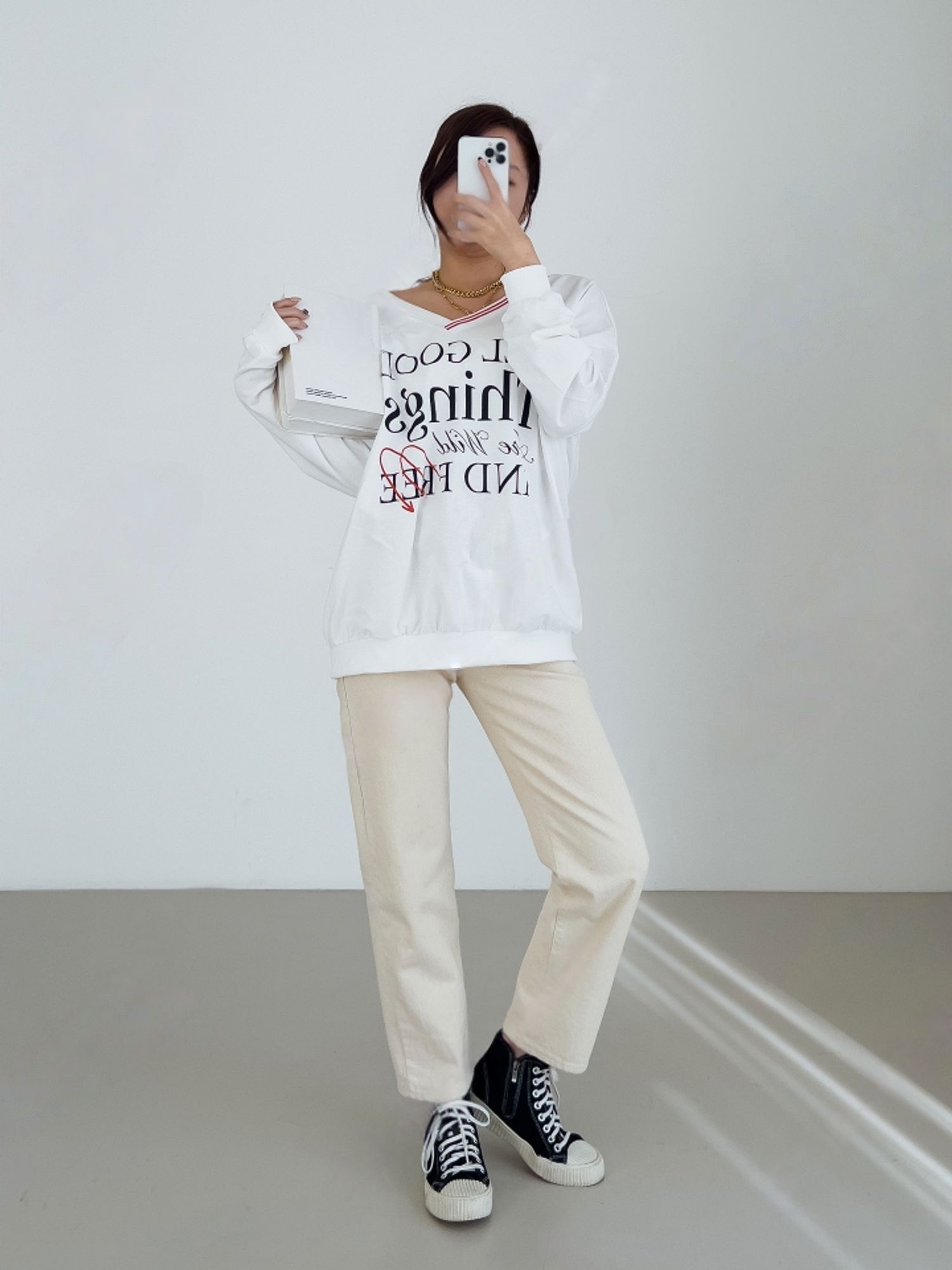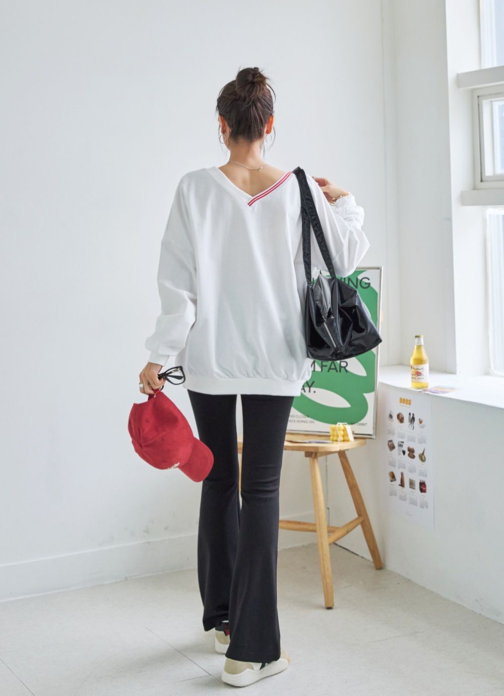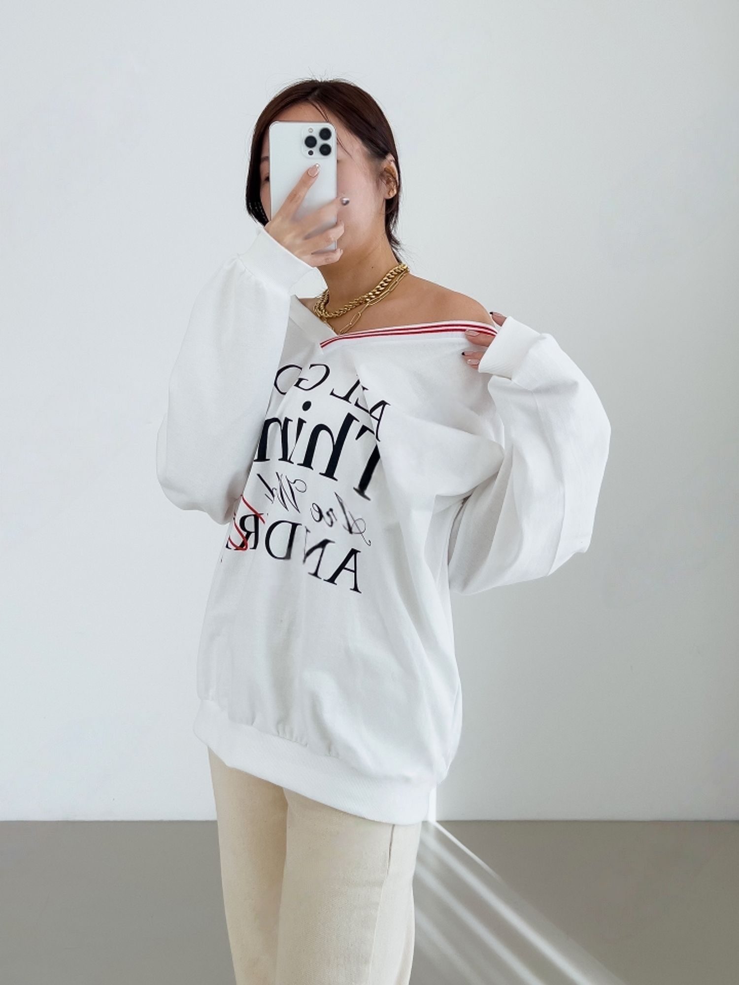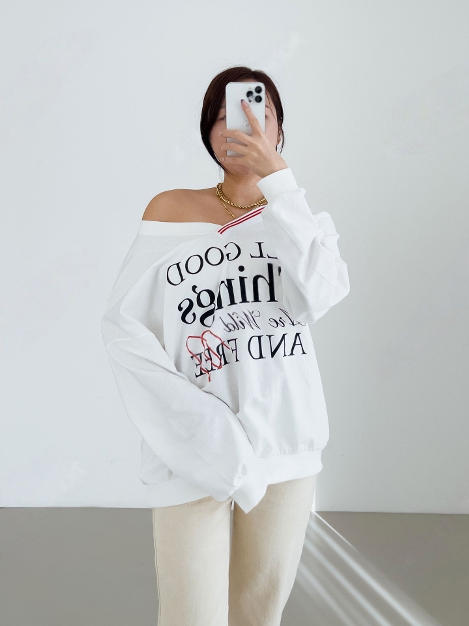 膠印字母/條紋滾邊V領/斜肩/寬鬆長版/內裏毛圈棉 - 休閒居家英文字母上衣字母T恤TEE條紋V領上衣長袖T恤長袖上衣寬鬆大尺碼上衣長版上衣白色灰色黑色