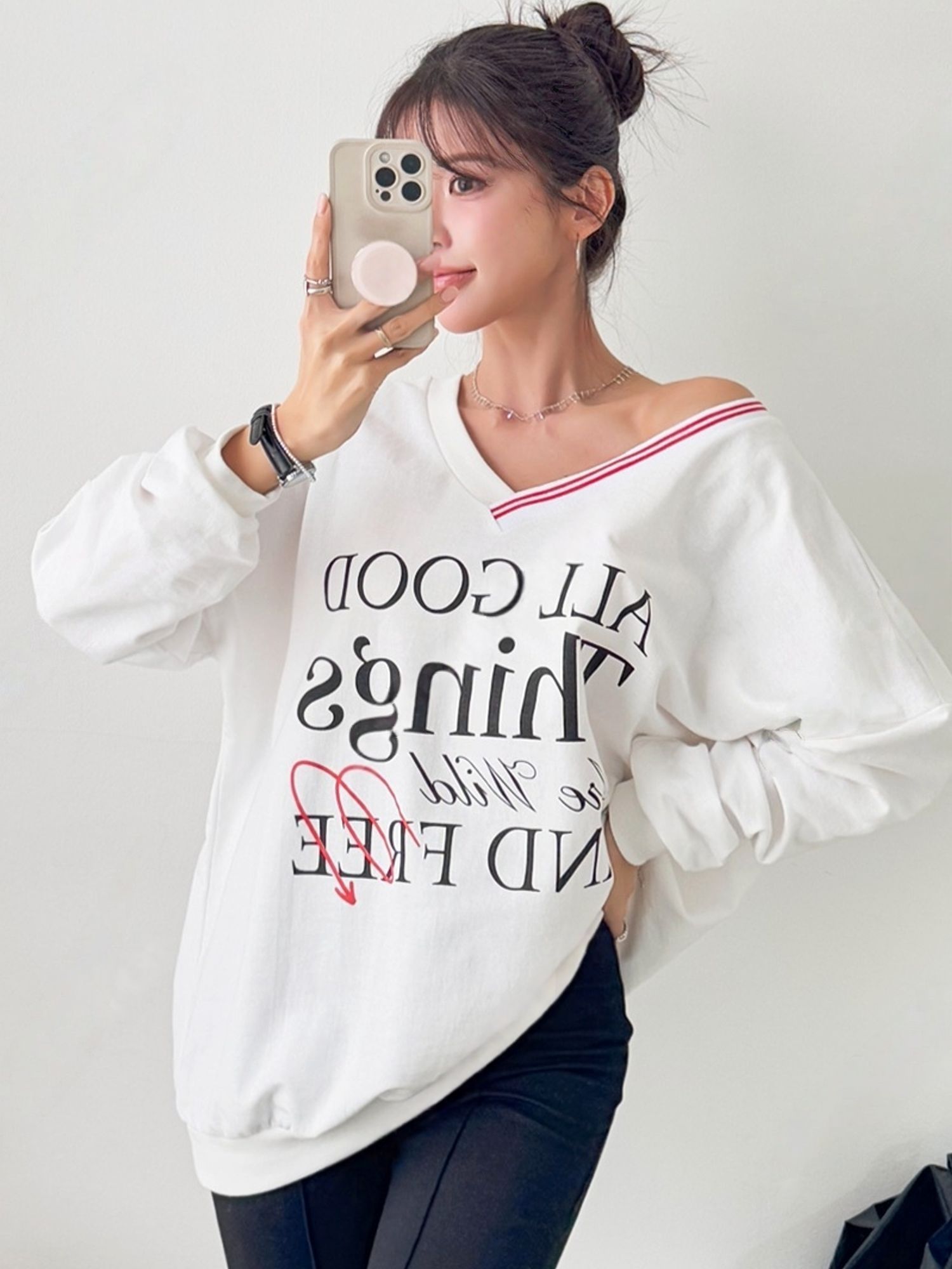 【C55830】韓國JNN 條紋V領上衣-草寫字母寬鬆斜肩長版長袖T恤
