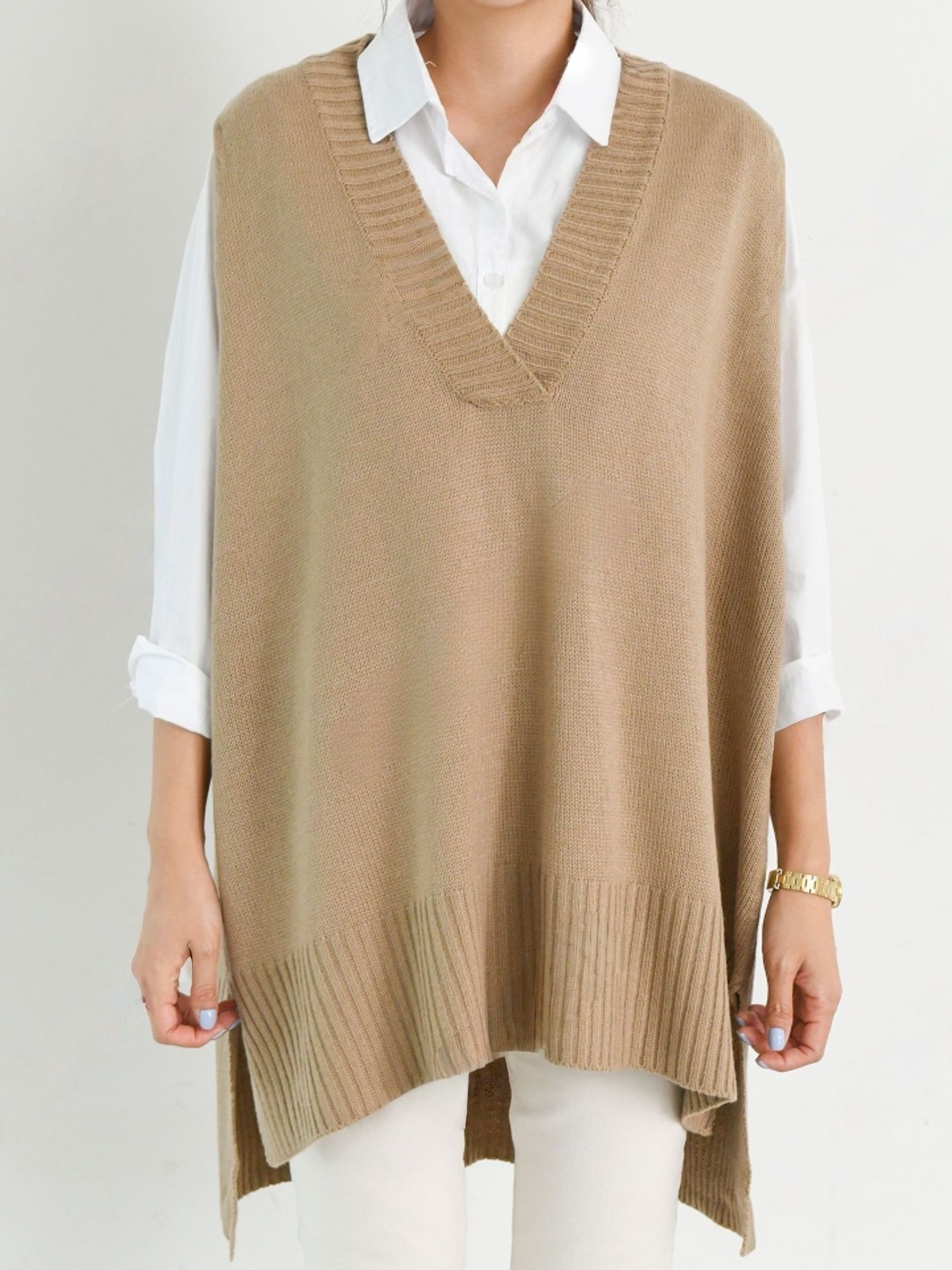 寬鬆長版/傘狀A字/深V領/側開衩/寬肩無袖 - 休閒居家簡約百搭素面長版針織背心上衣針織衫針織上衣素面無袖上衣外搭背心米色黑色棕色深灰色