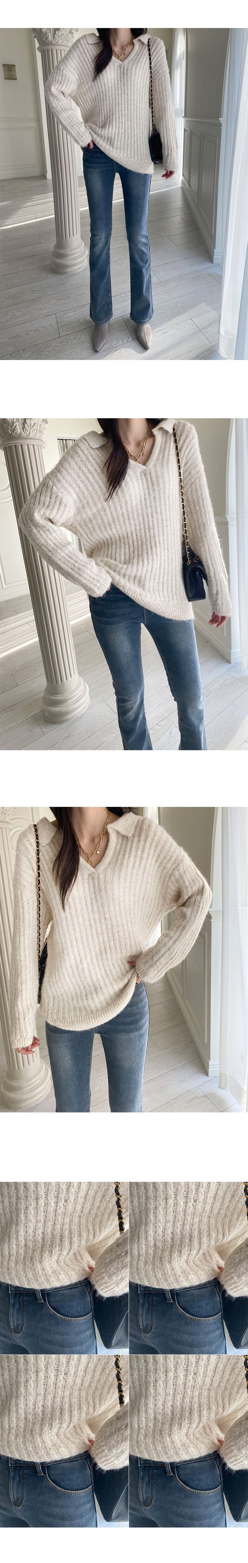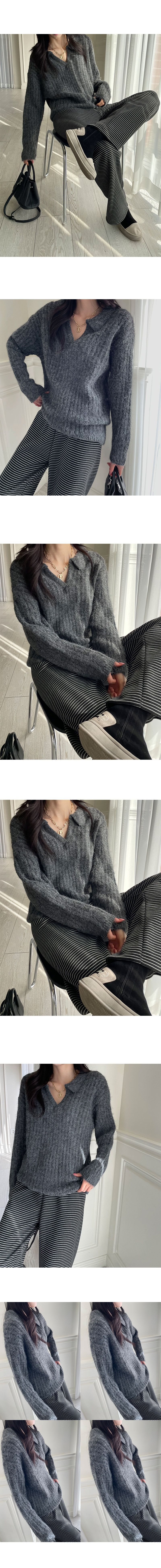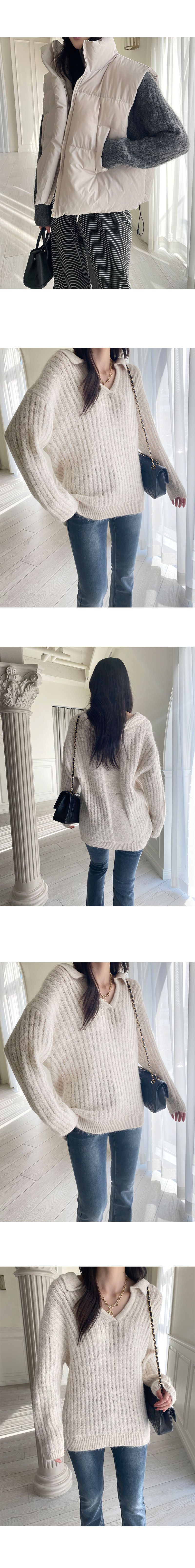 【C55834】韓國MNR 翻領羊毛針織衫-慵懶感素面坑條V領長袖上衣