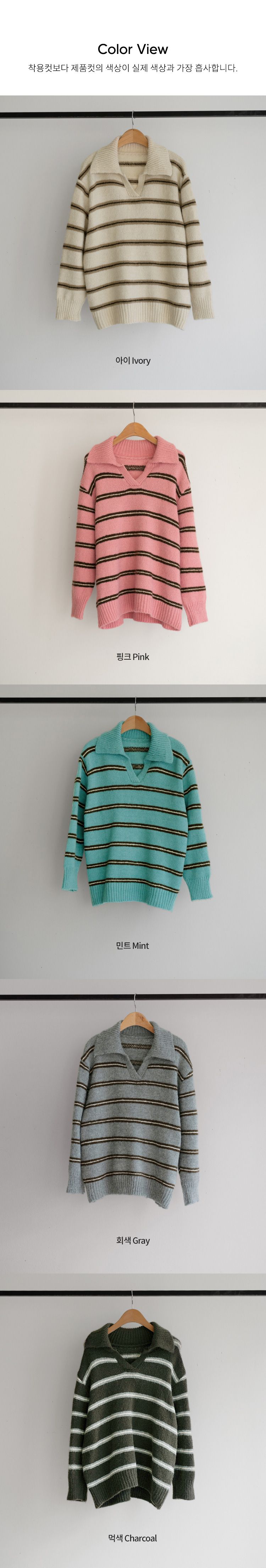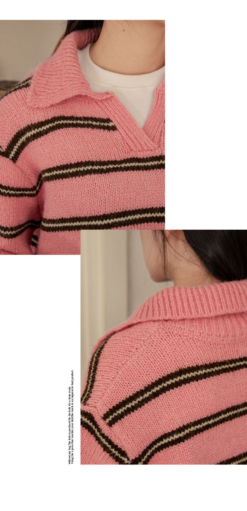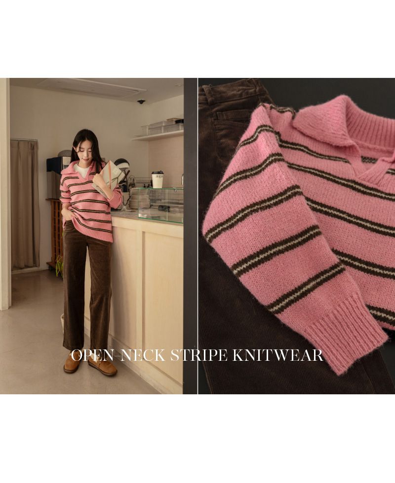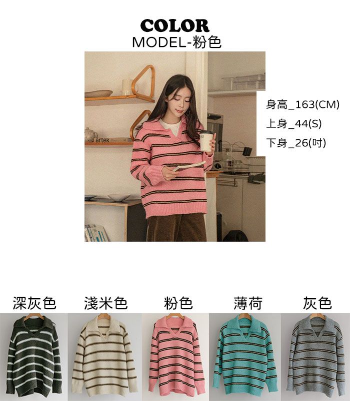 橫條紋/寬鬆/好氣色/POLO領/V領 - 休閒居家渡假配色條紋上衣翻領條紋針織衫針織上衣長袖上衣寬鬆大尺碼上衣深灰色淺米色粉色薄荷色灰色