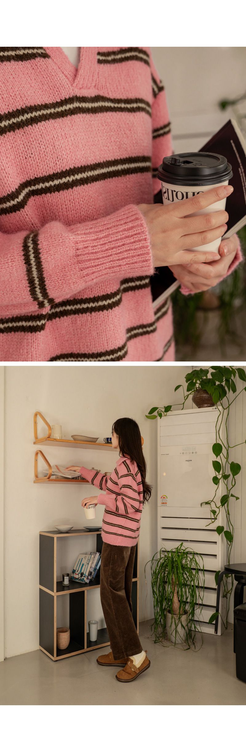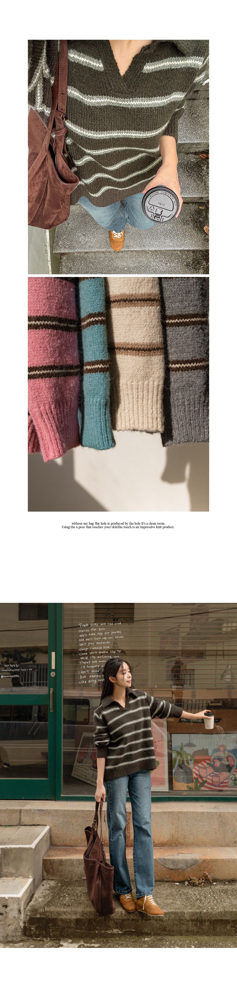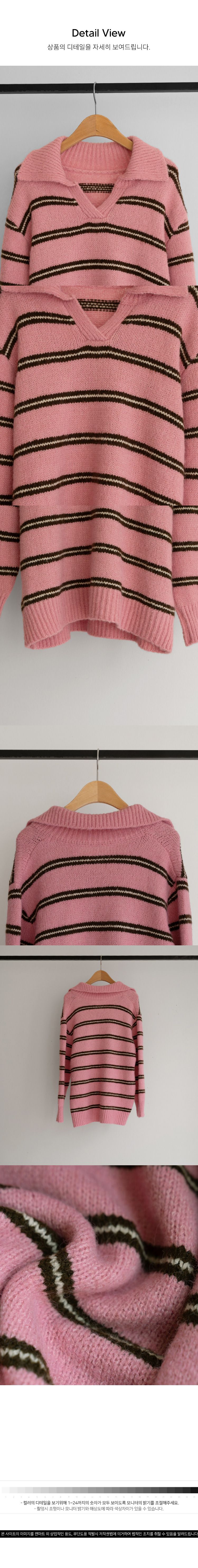 橫條紋/寬鬆/好氣色/POLO領/V領 - 休閒居家渡假配色條紋上衣翻領條紋針織衫針織上衣長袖上衣寬鬆大尺碼上衣深灰色淺米色粉色薄荷色灰色
