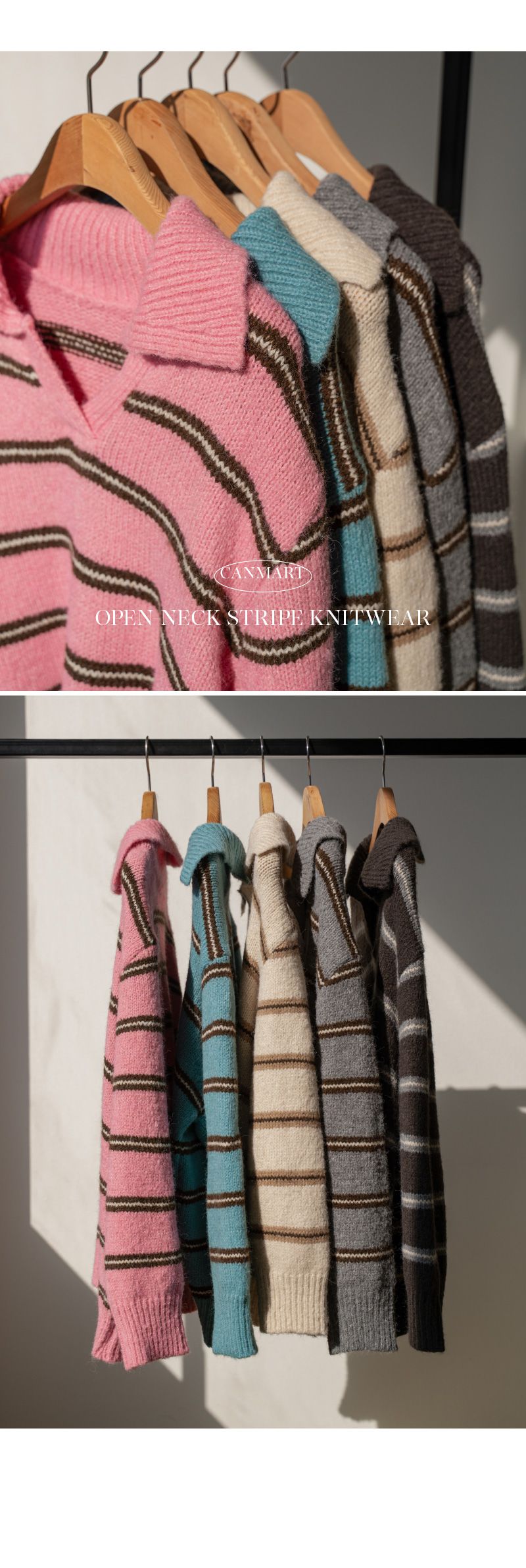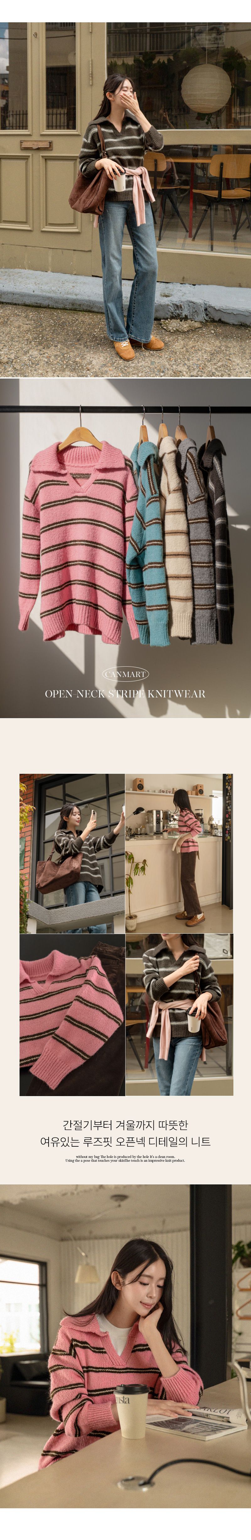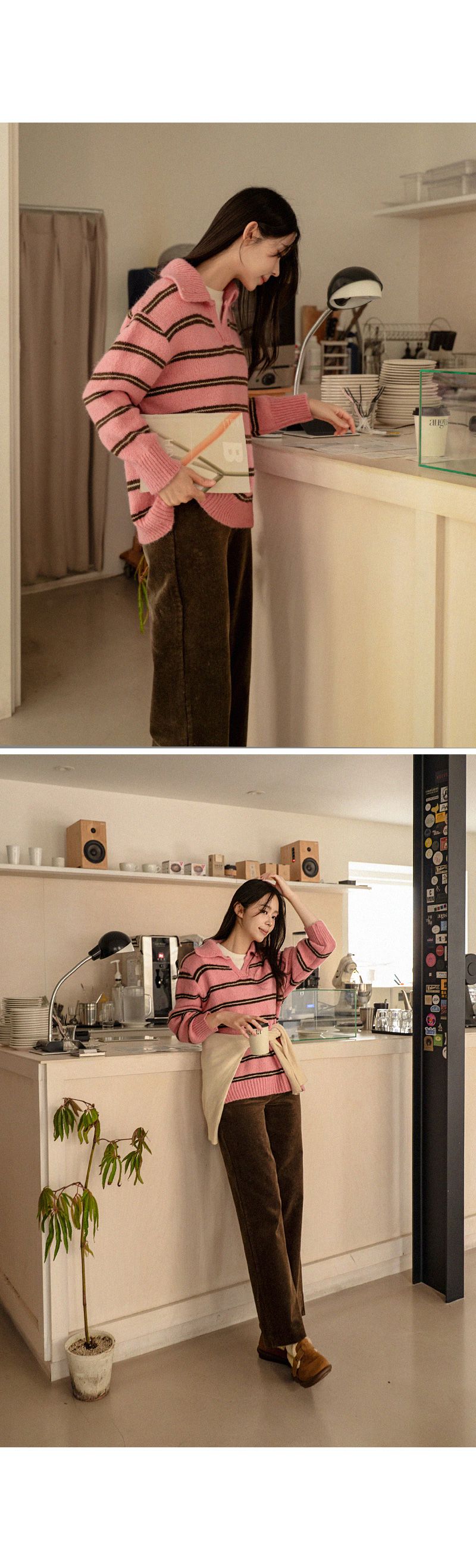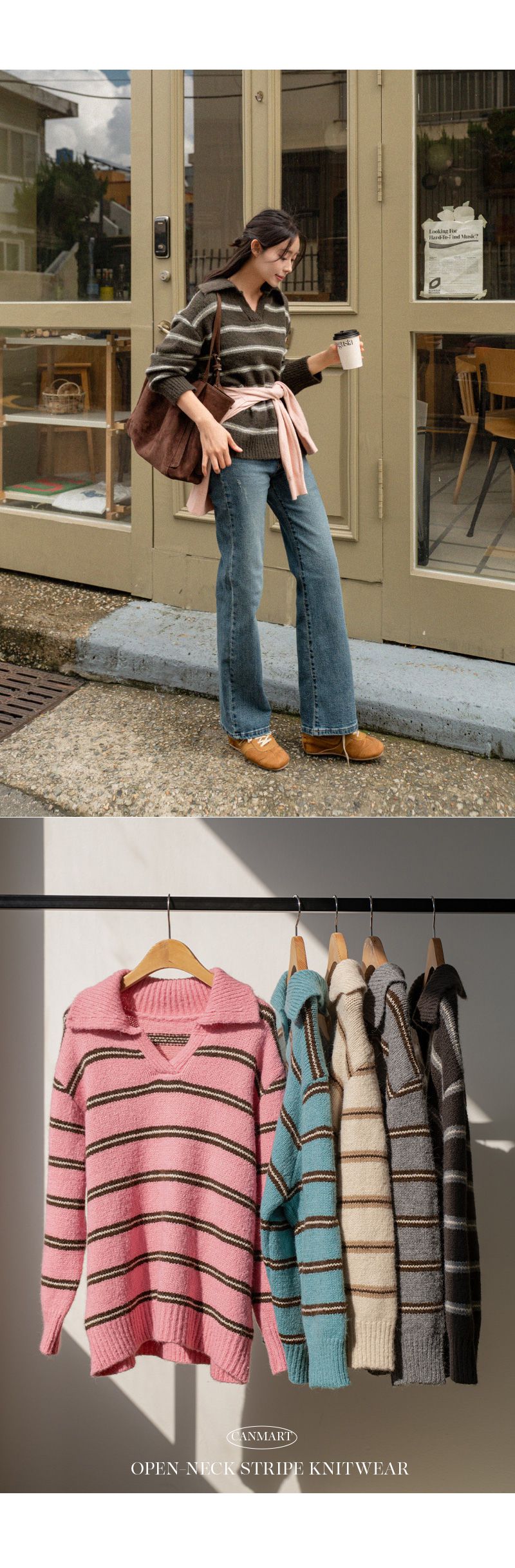 【C55836】韓國CAN 翻領條紋針織衫-寬鬆好氣色POLO領長袖上衣★★