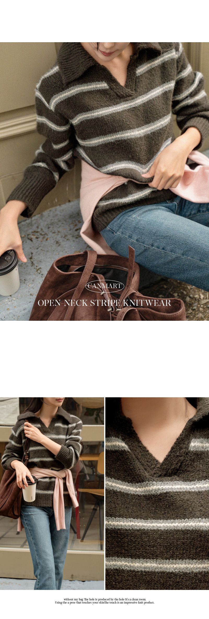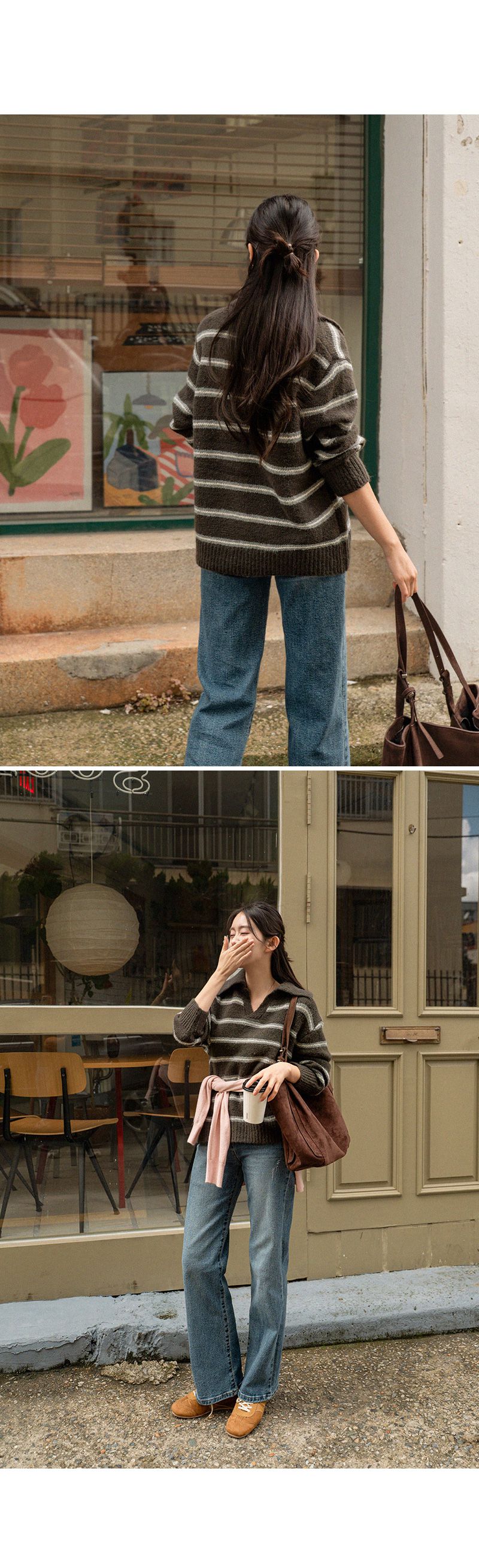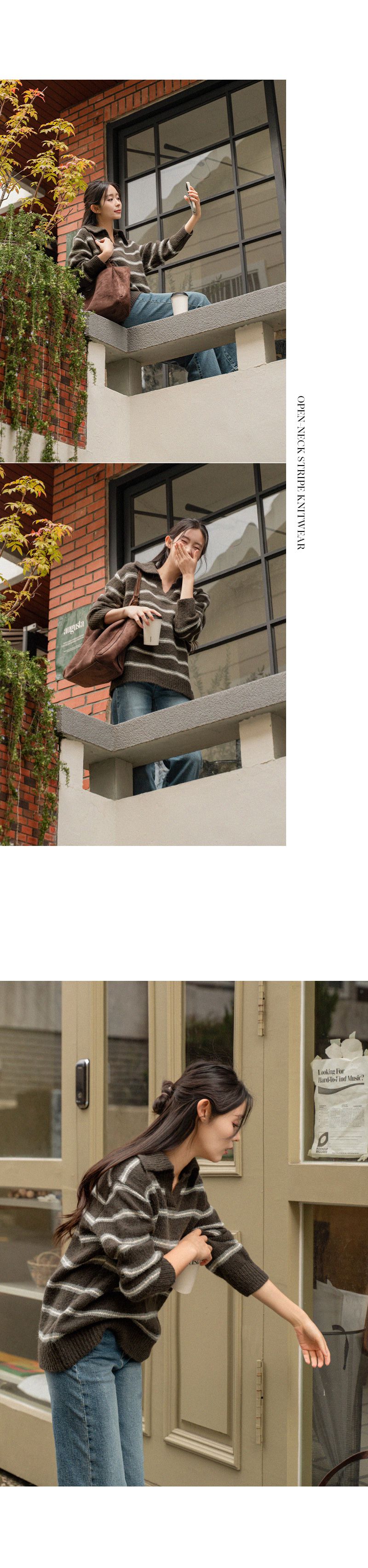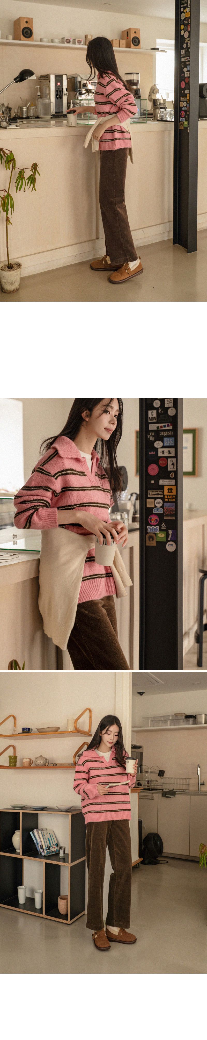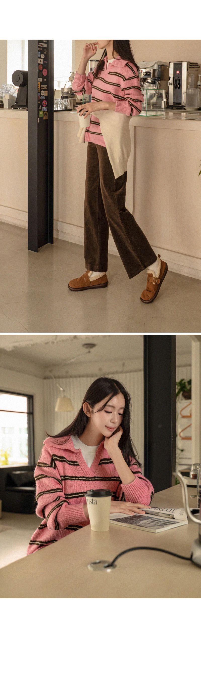 【C55836】韓國CAN 翻領條紋針織衫-寬鬆好氣色POLO領長袖上衣★★