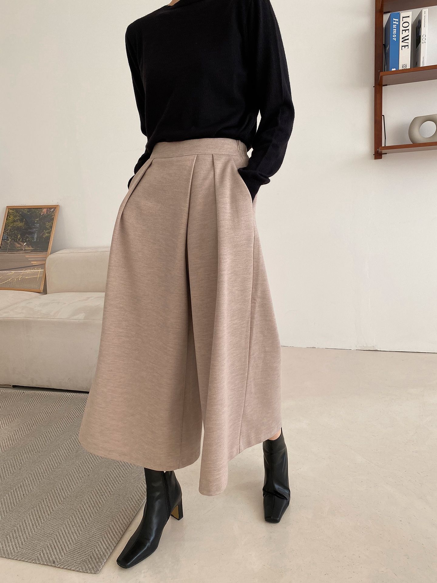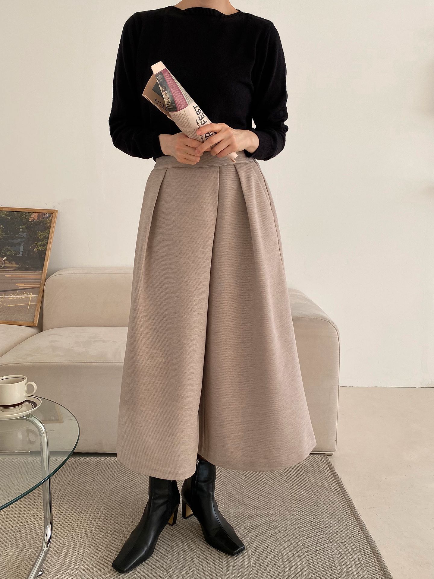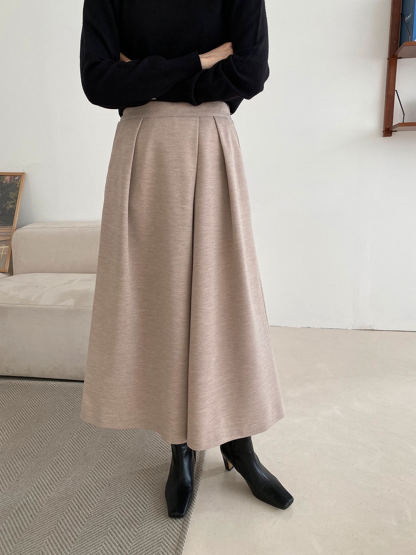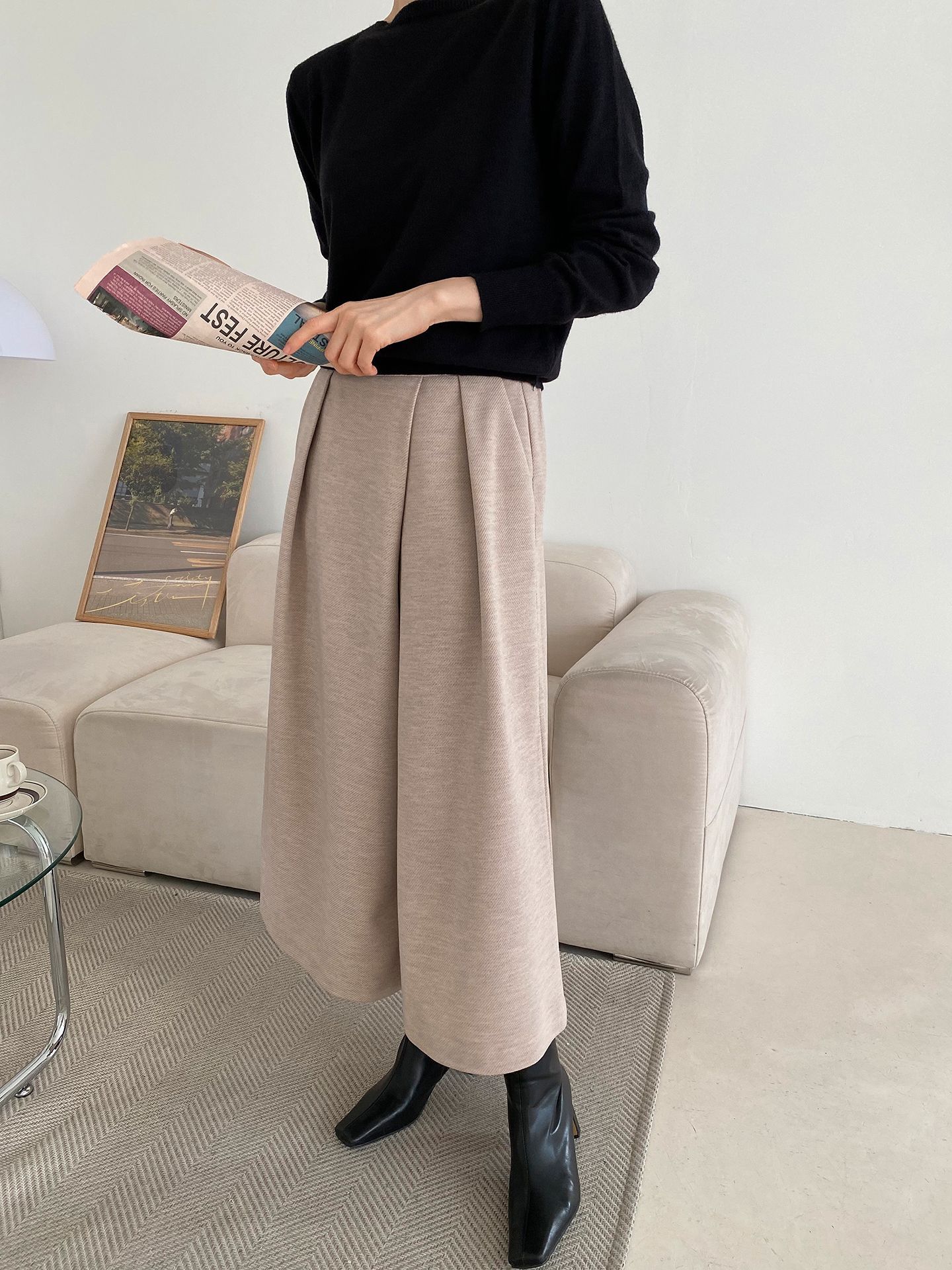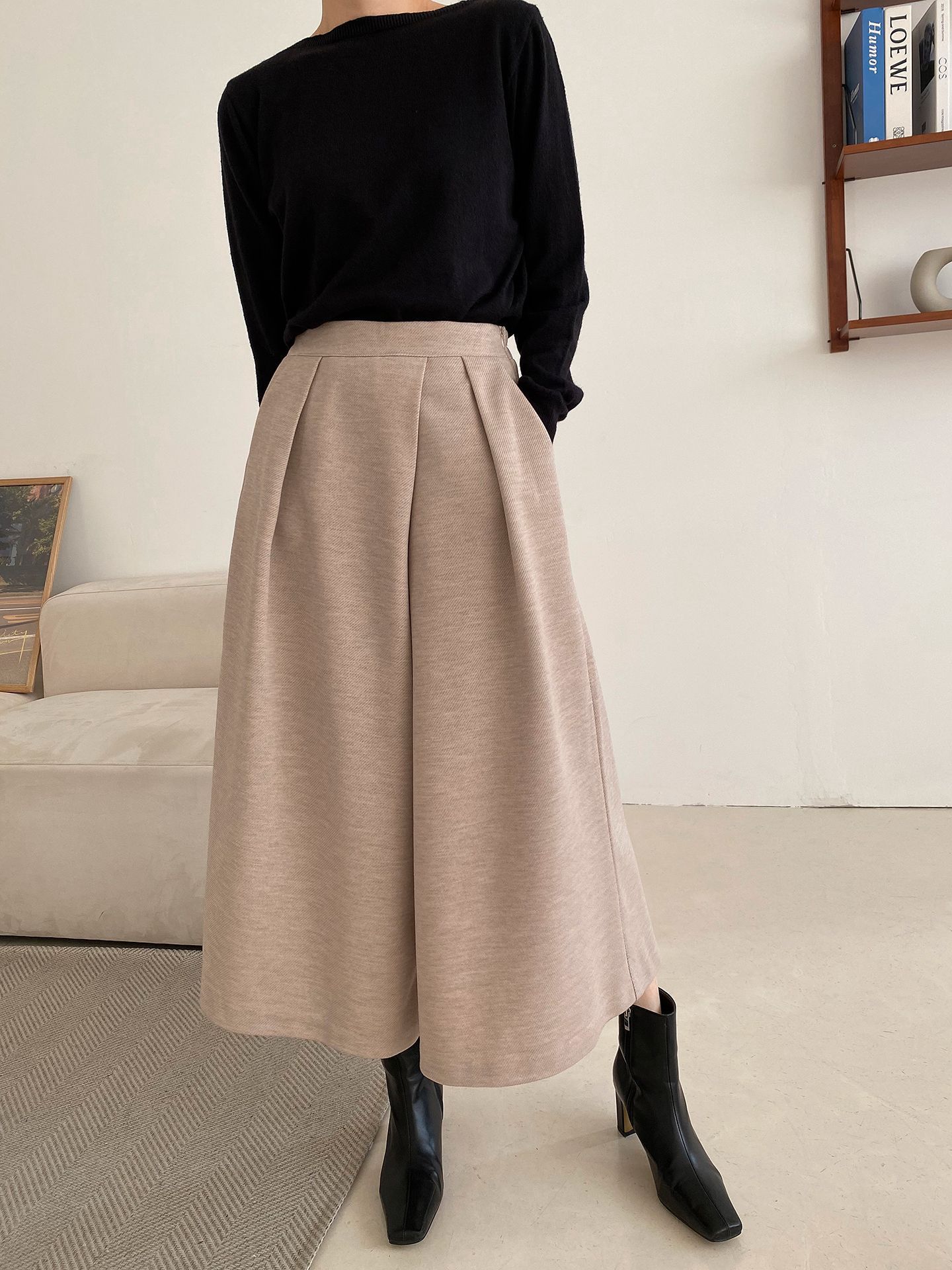三種尺寸/厚磅毛呢面料/內薄刷毛/打褶褲頭/後腰鬆緊/側邊拉鍊/雙口袋/A字傘狀寬褲裙 - 休閒婚禮OL上班族簡約百搭素面抓褶腰毛呢寬褲厚磅內磨毛九分褲裙多尺寸SML燕麥色黑色