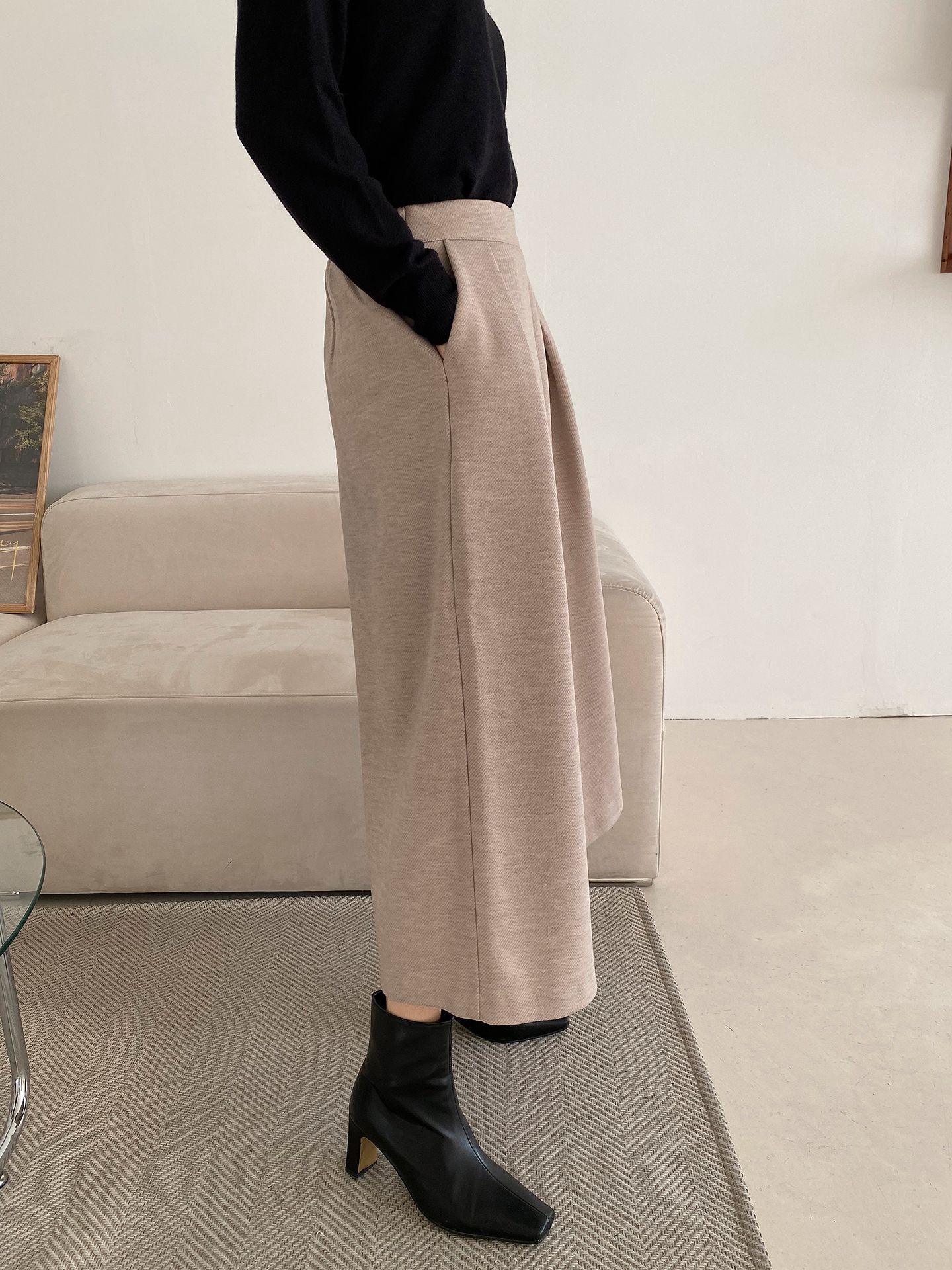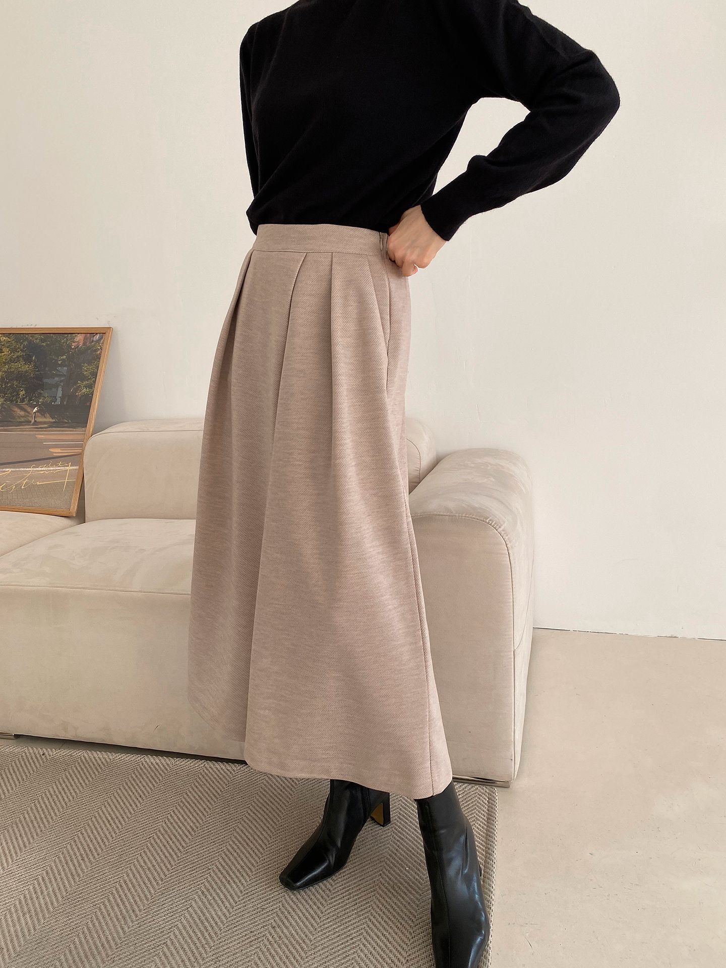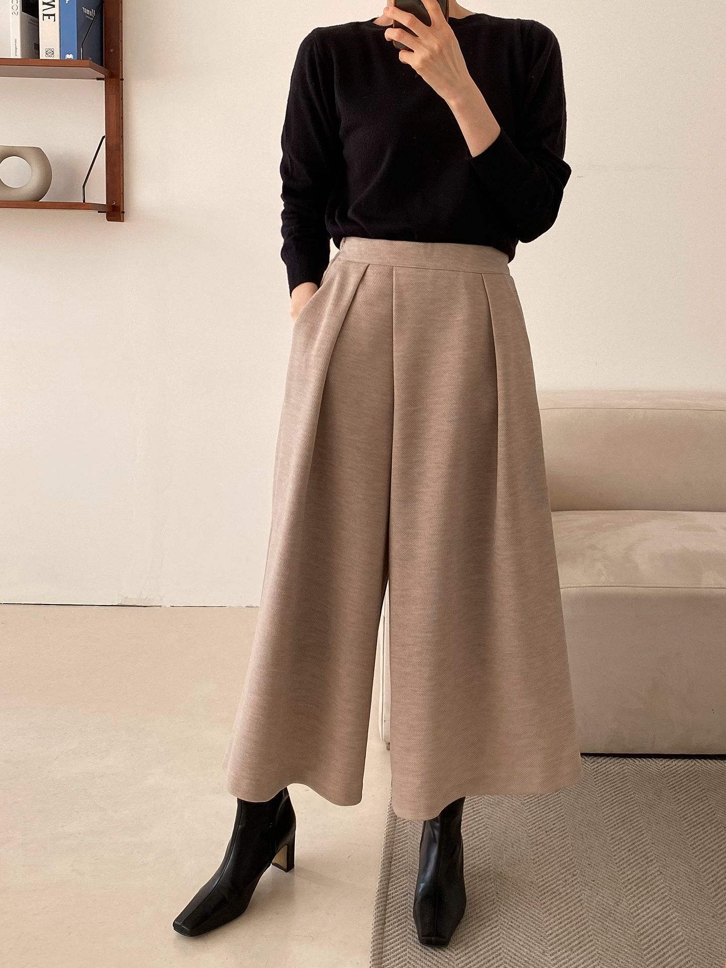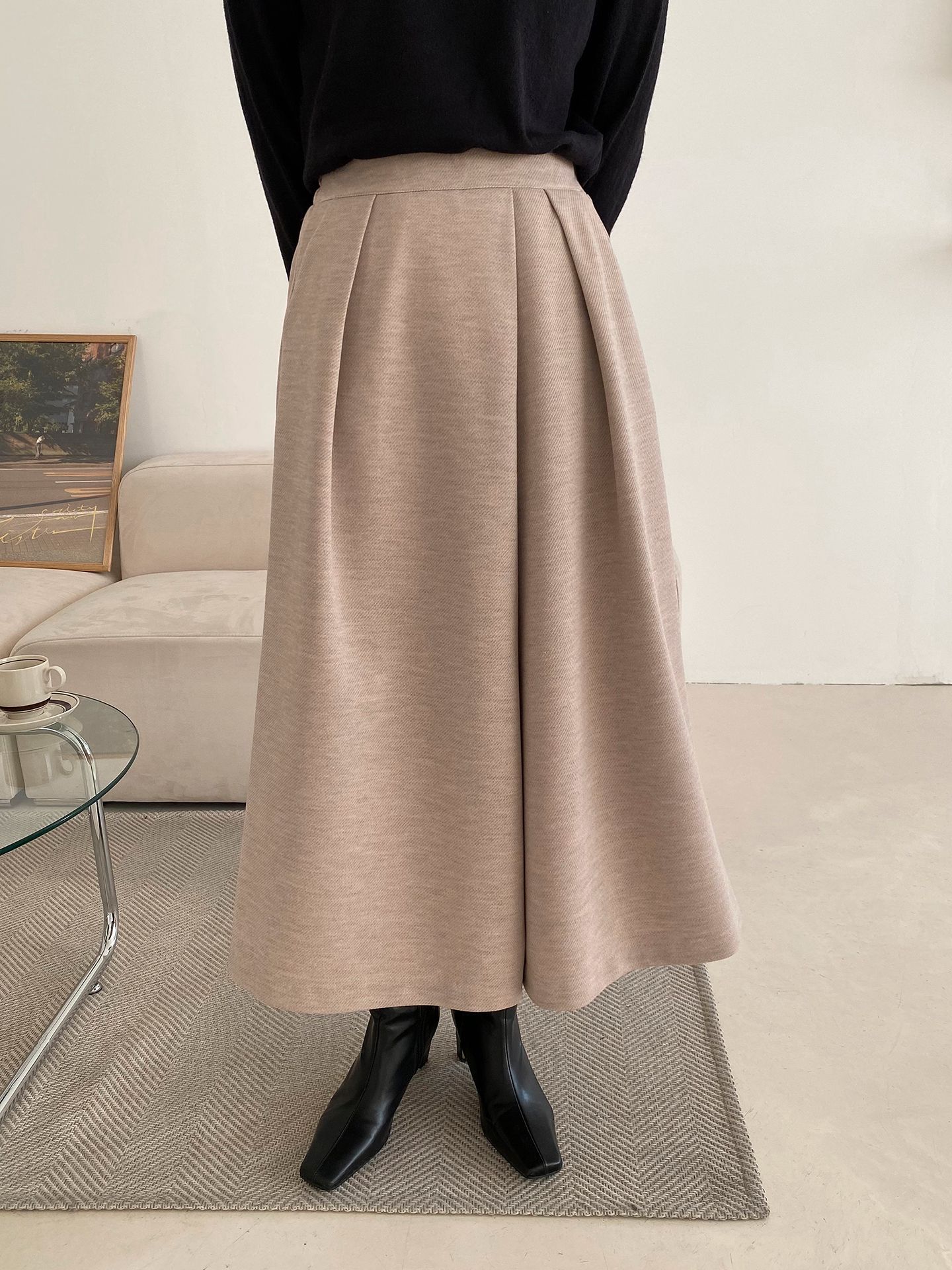 三種尺寸/厚磅毛呢面料/內薄刷毛/打褶褲頭/後腰鬆緊/側邊拉鍊/雙口袋/A字傘狀寬褲裙 - 休閒婚禮OL上班族簡約百搭素面抓褶腰毛呢寬褲厚磅內磨毛九分褲裙多尺寸SML燕麥色黑色