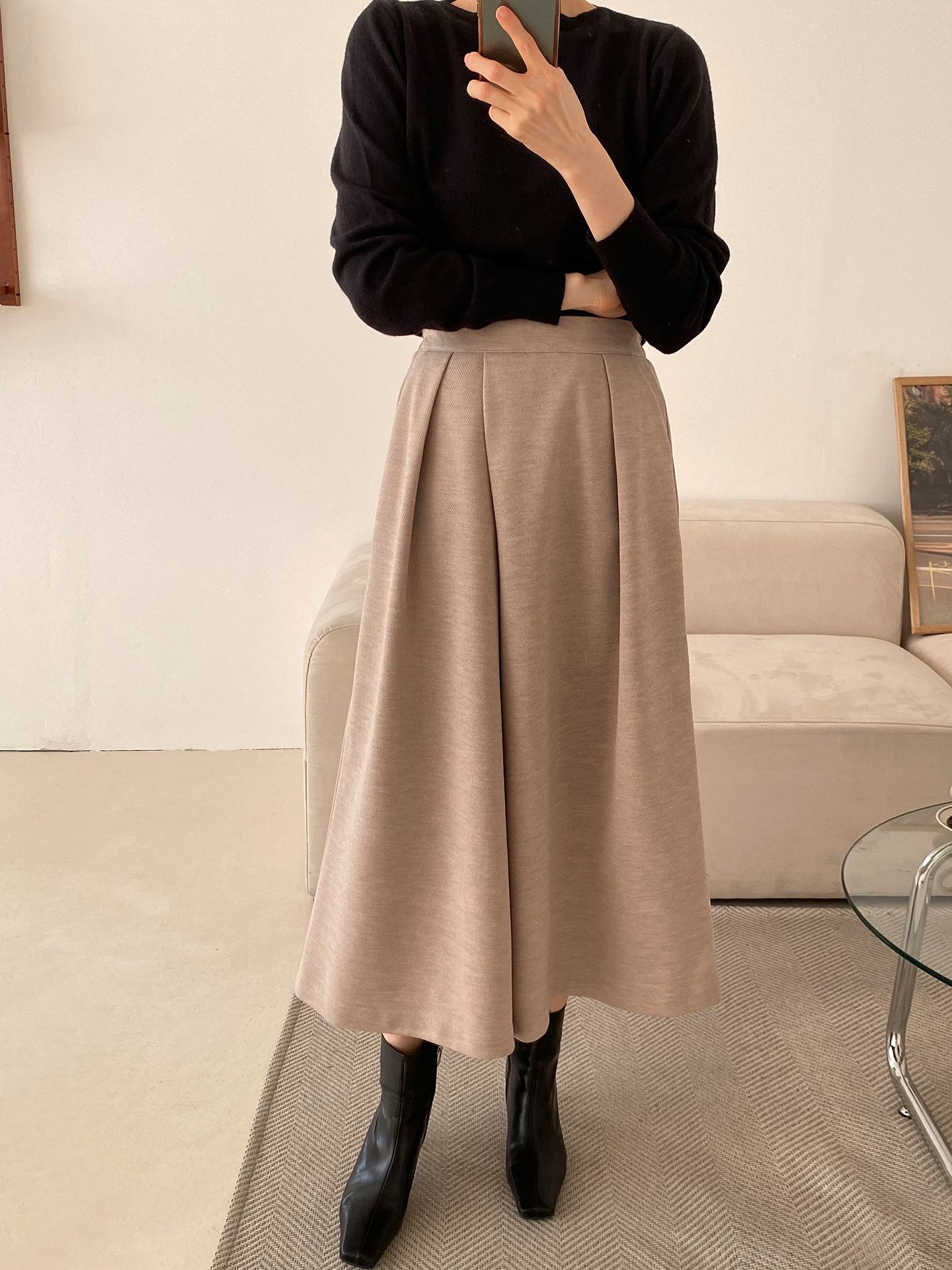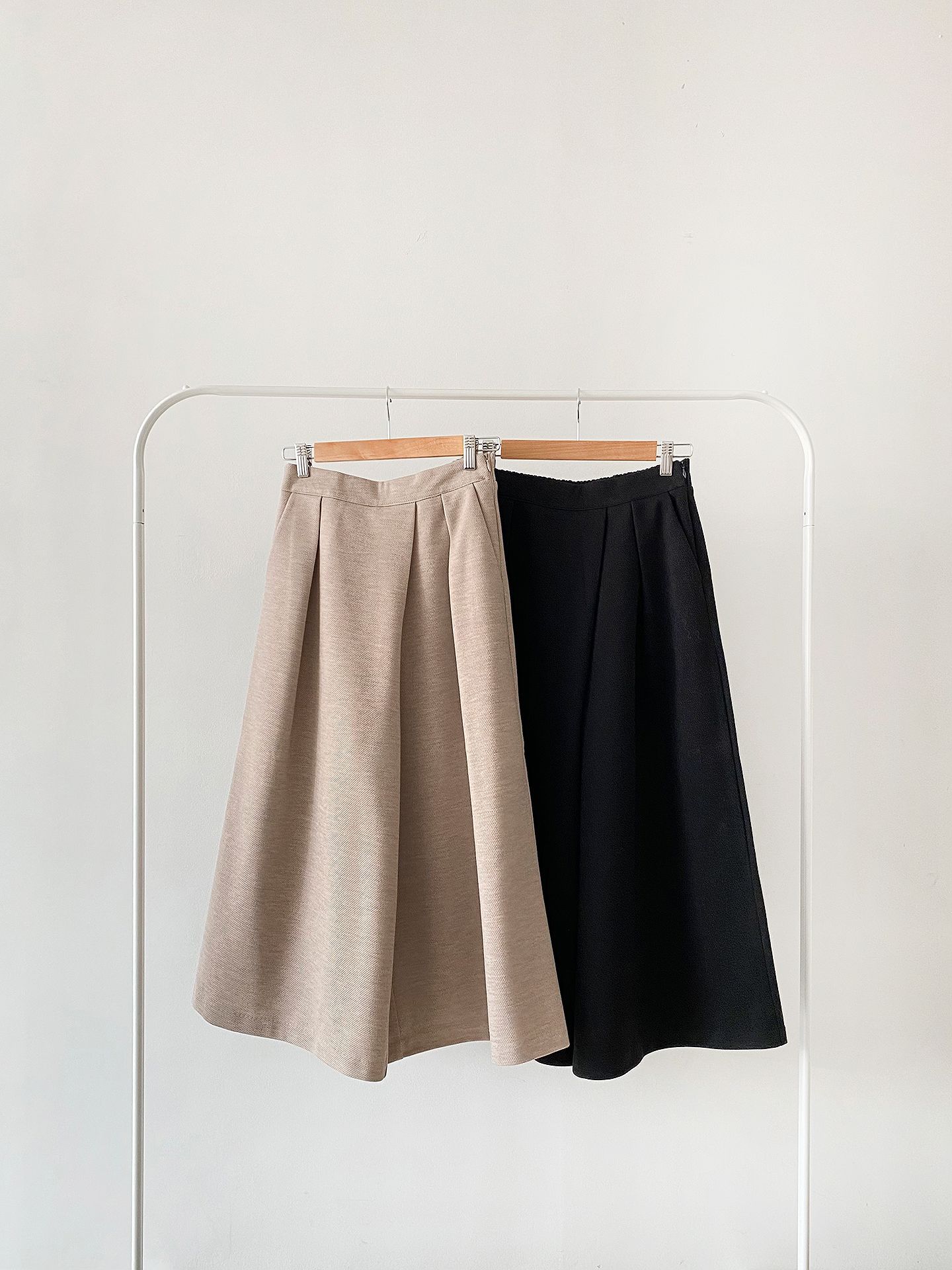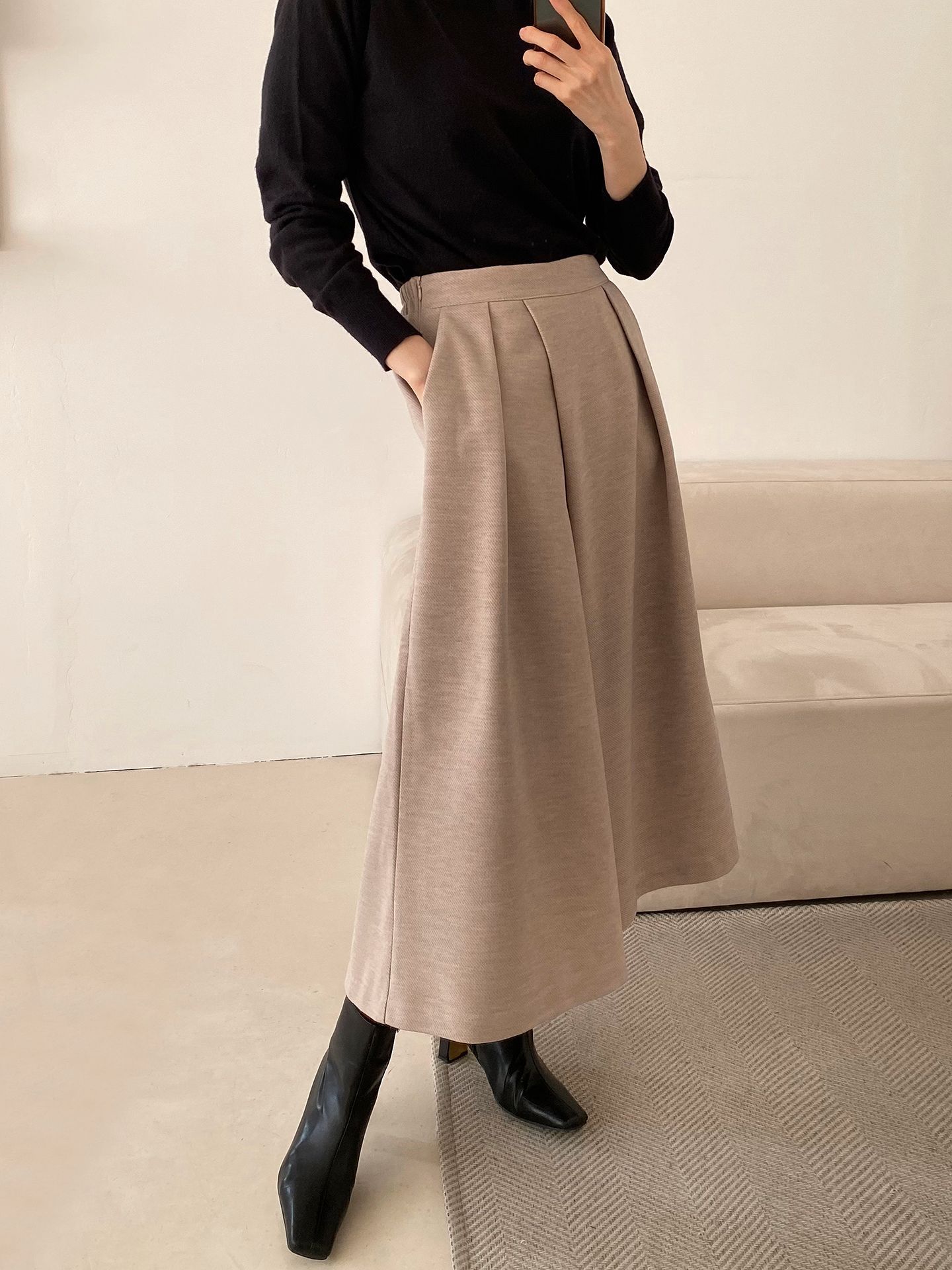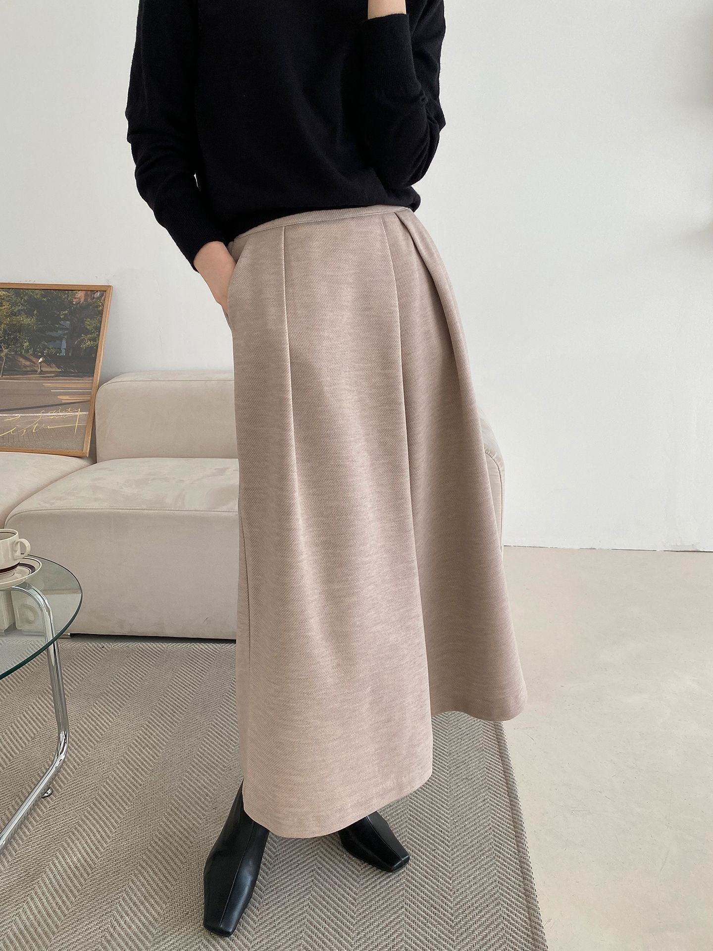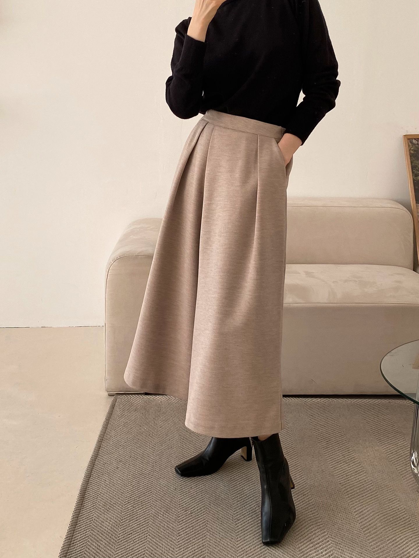 三種尺寸/厚磅毛呢面料/內薄刷毛/打褶褲頭/後腰鬆緊/側邊拉鍊/雙口袋/A字傘狀寬褲裙 - 休閒婚禮OL上班族簡約百搭素面抓褶腰毛呢寬褲厚磅內磨毛九分褲裙多尺寸SML燕麥色黑色