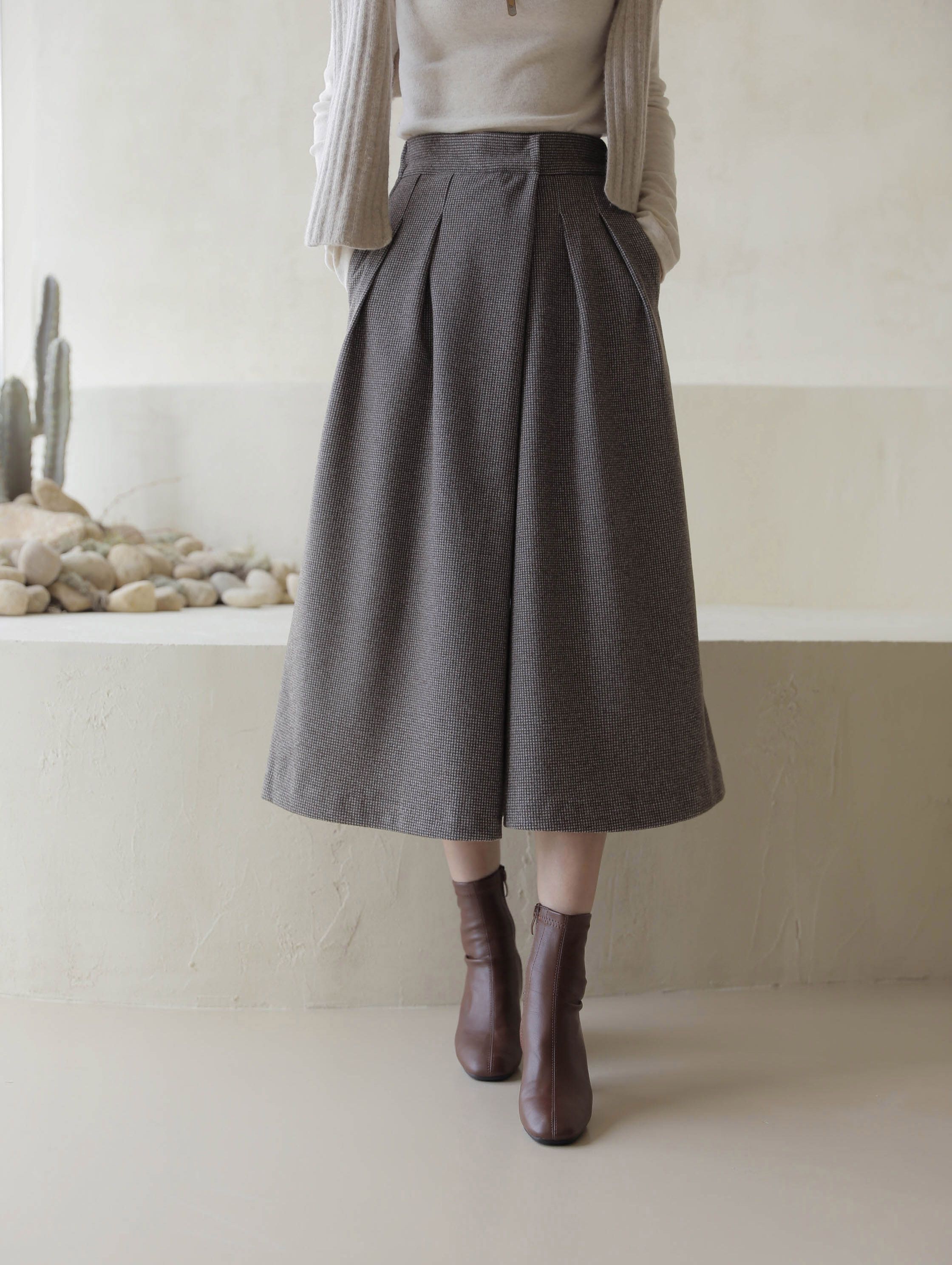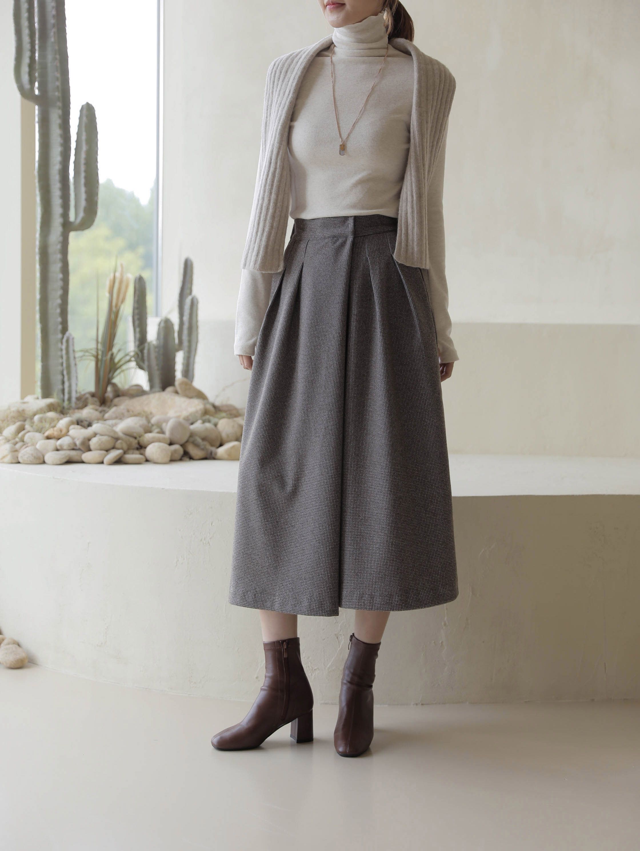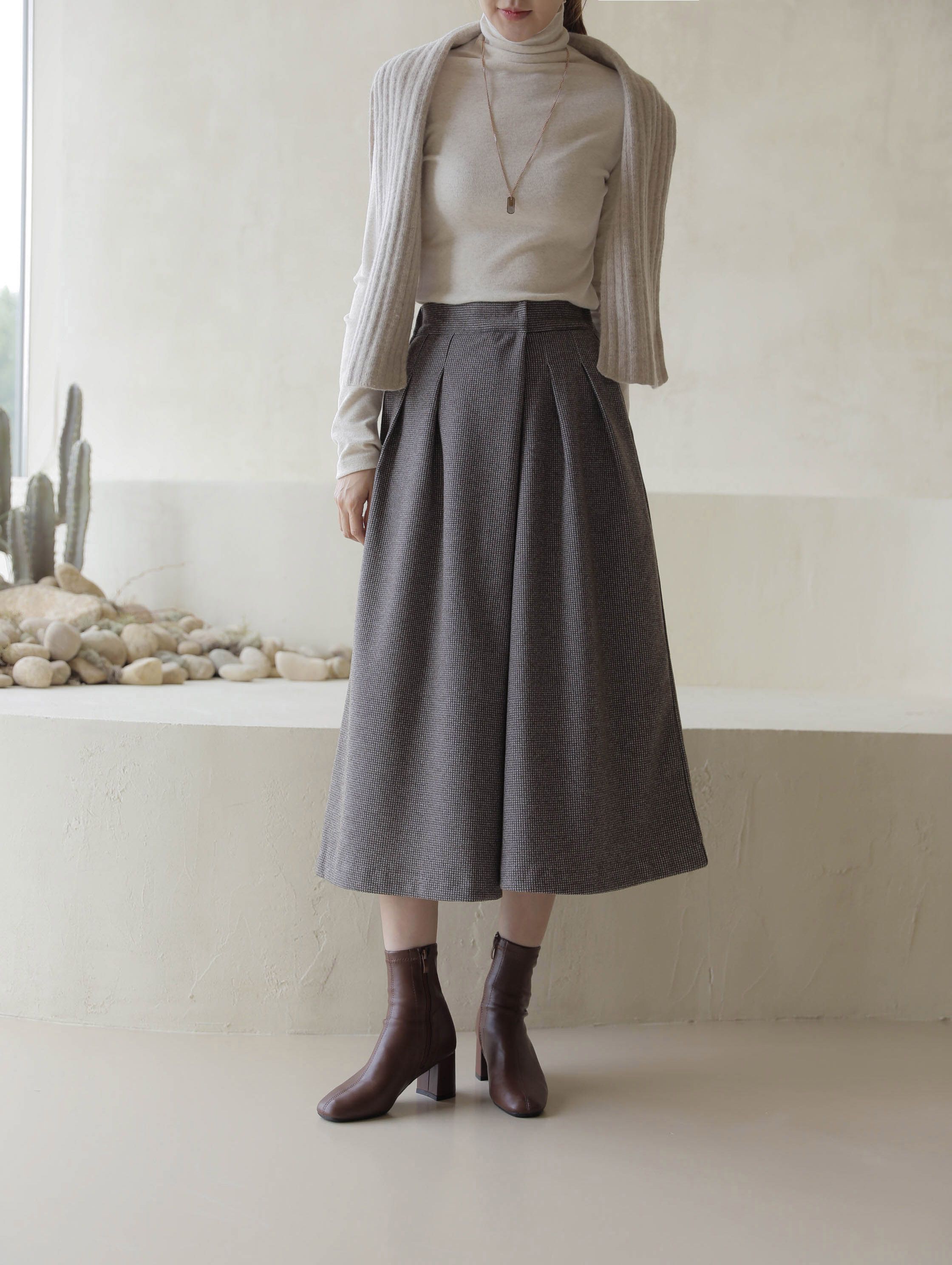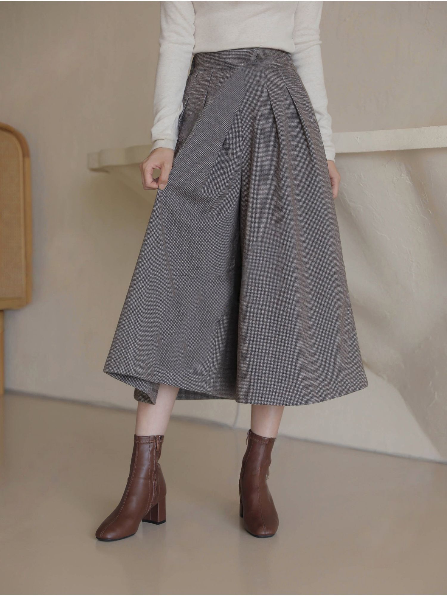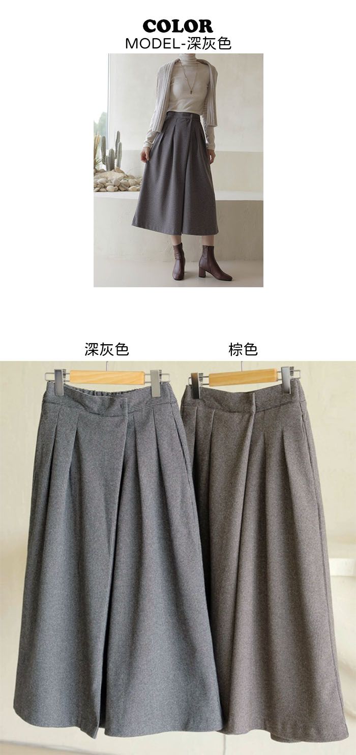 三種尺寸/厚磅毛呢面料/打褶腰/斜邊交叉褲頭/拉鍊隱形勾釦/後腰鬆緊/雙口袋/A字傘狀 - 休閒OL上班族婚禮格紋寬褲格子褲格子寬褲裙七分褲多尺寸SML棕色深灰色