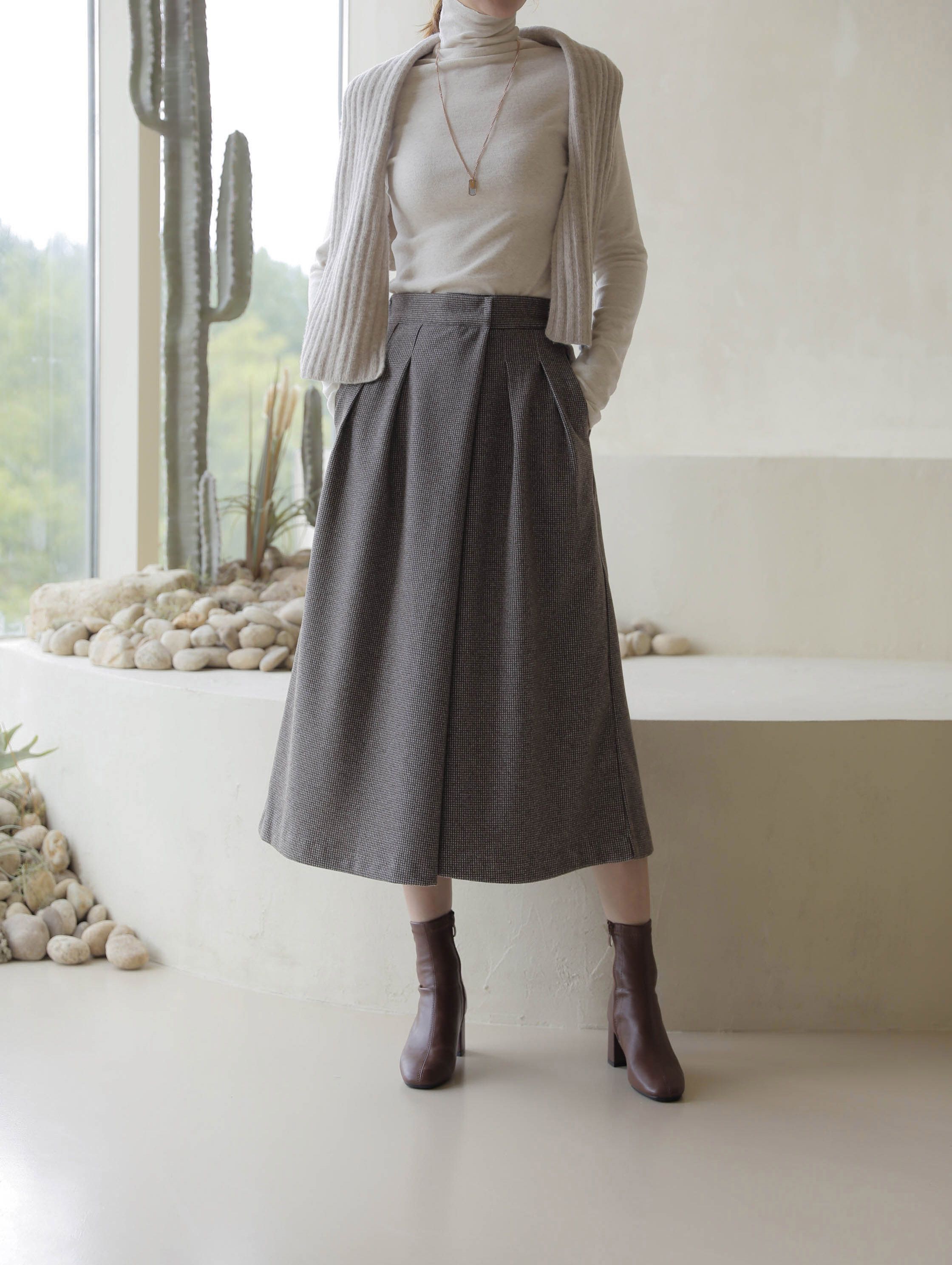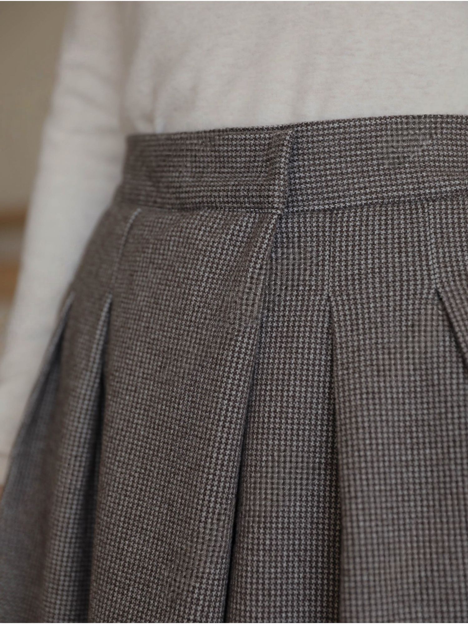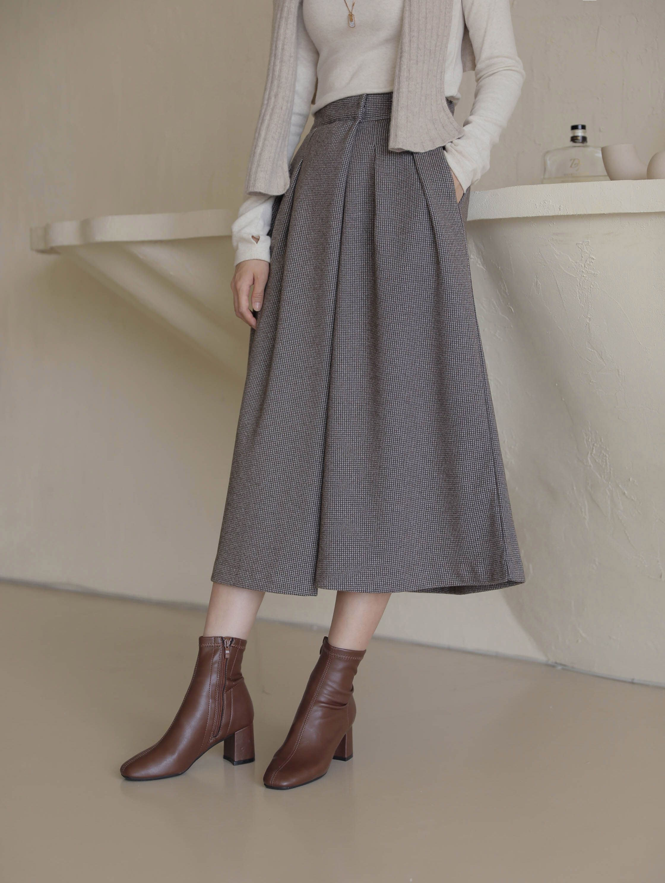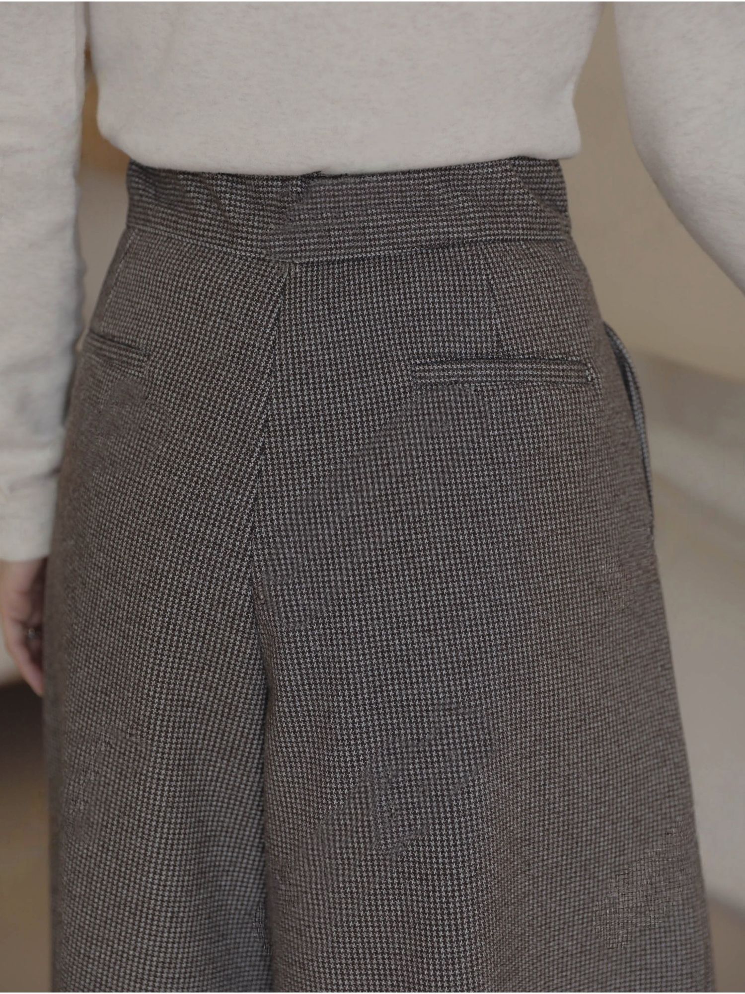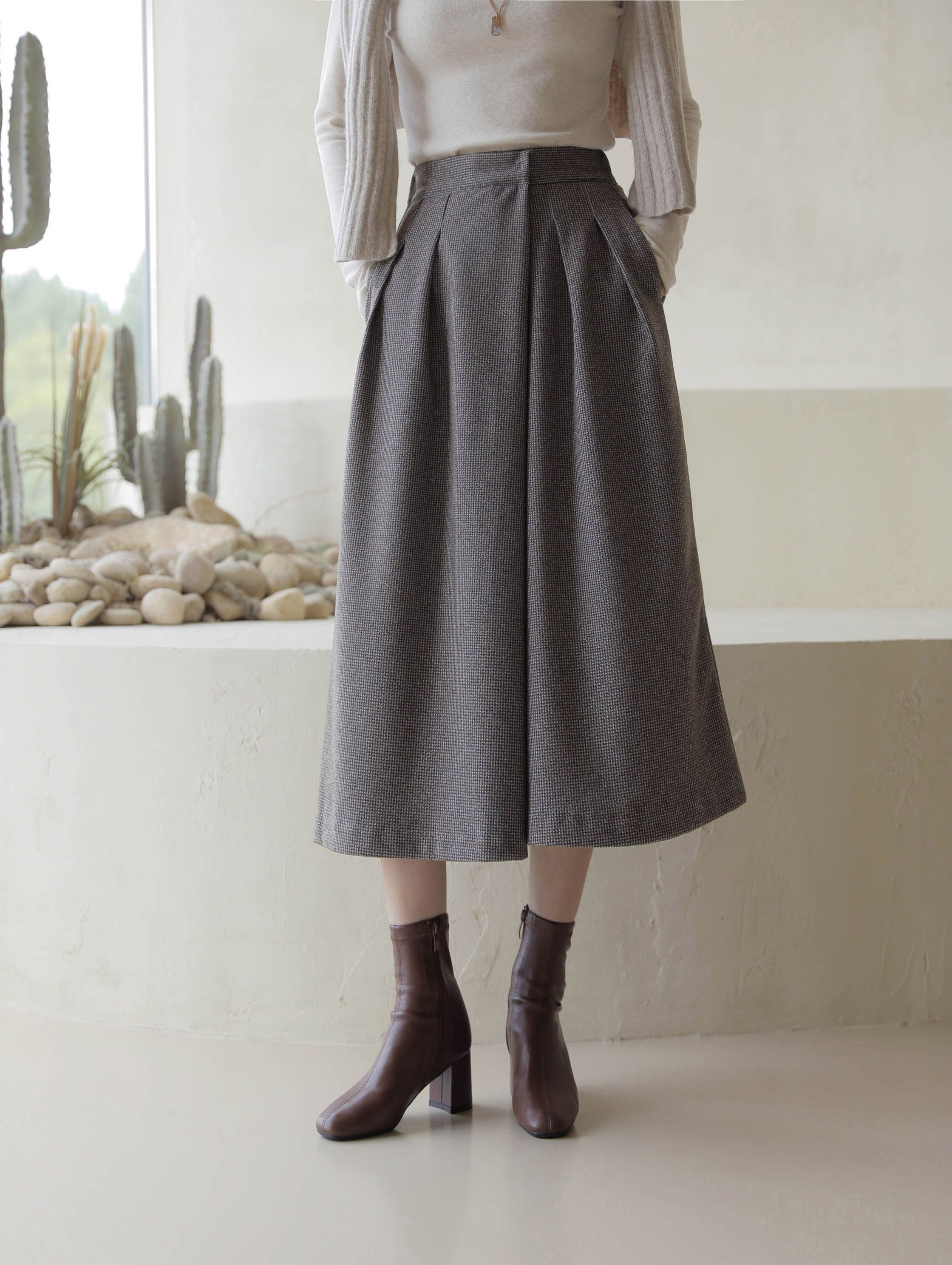 三種尺寸/厚磅毛呢面料/打褶腰/斜邊交叉褲頭/拉鍊隱形勾釦/後腰鬆緊/雙口袋/A字傘狀 - 休閒OL上班族婚禮格紋寬褲格子褲格子寬褲裙七分褲多尺寸SML棕色深灰色