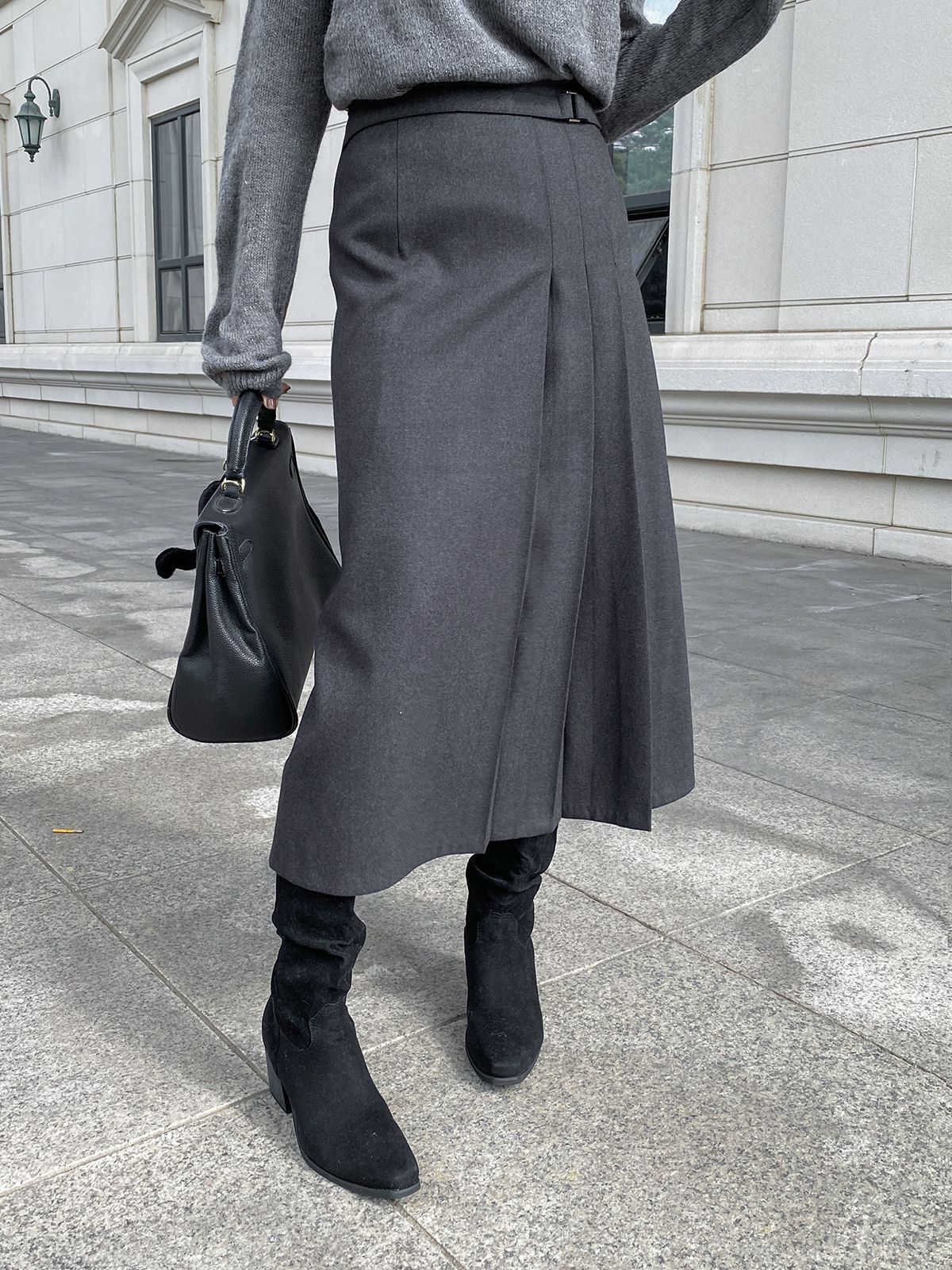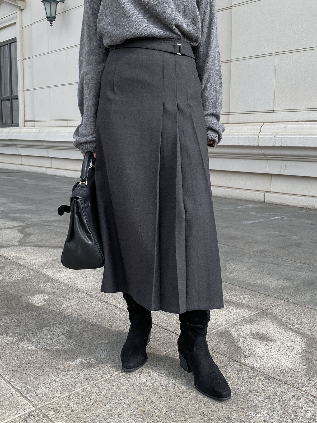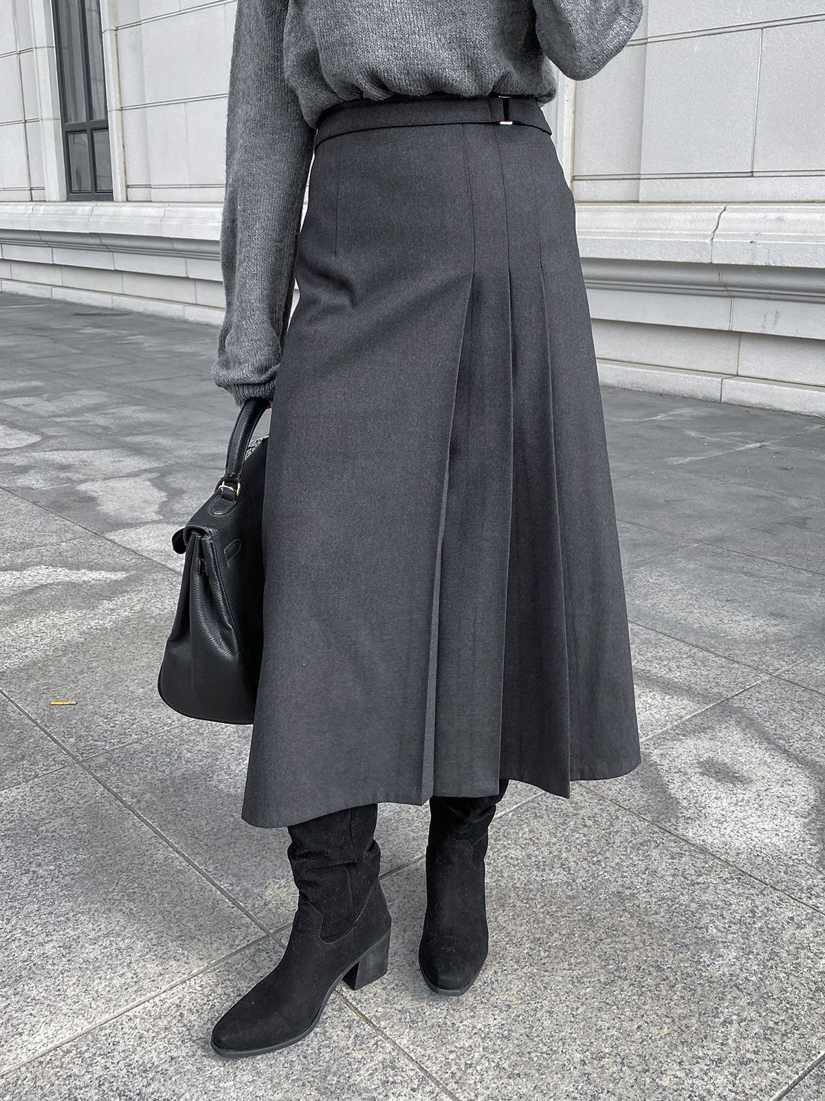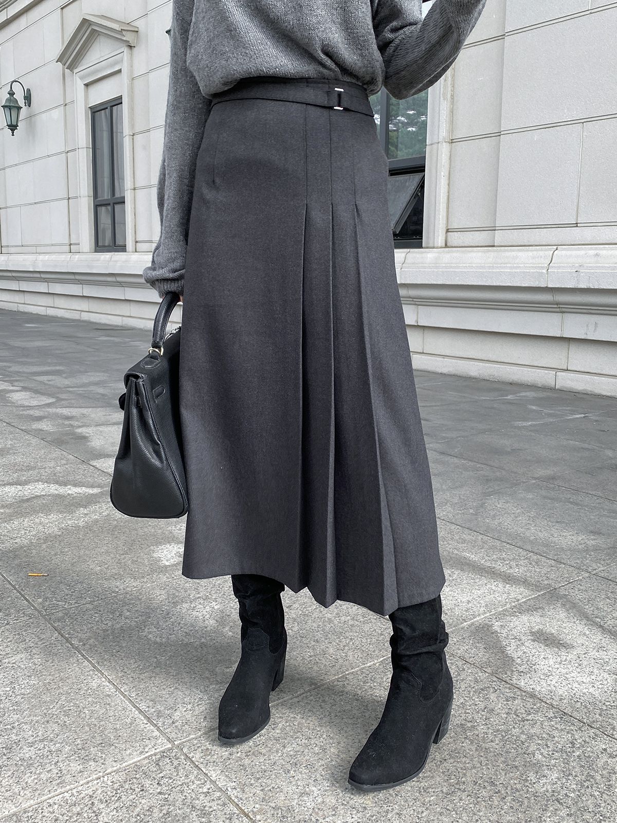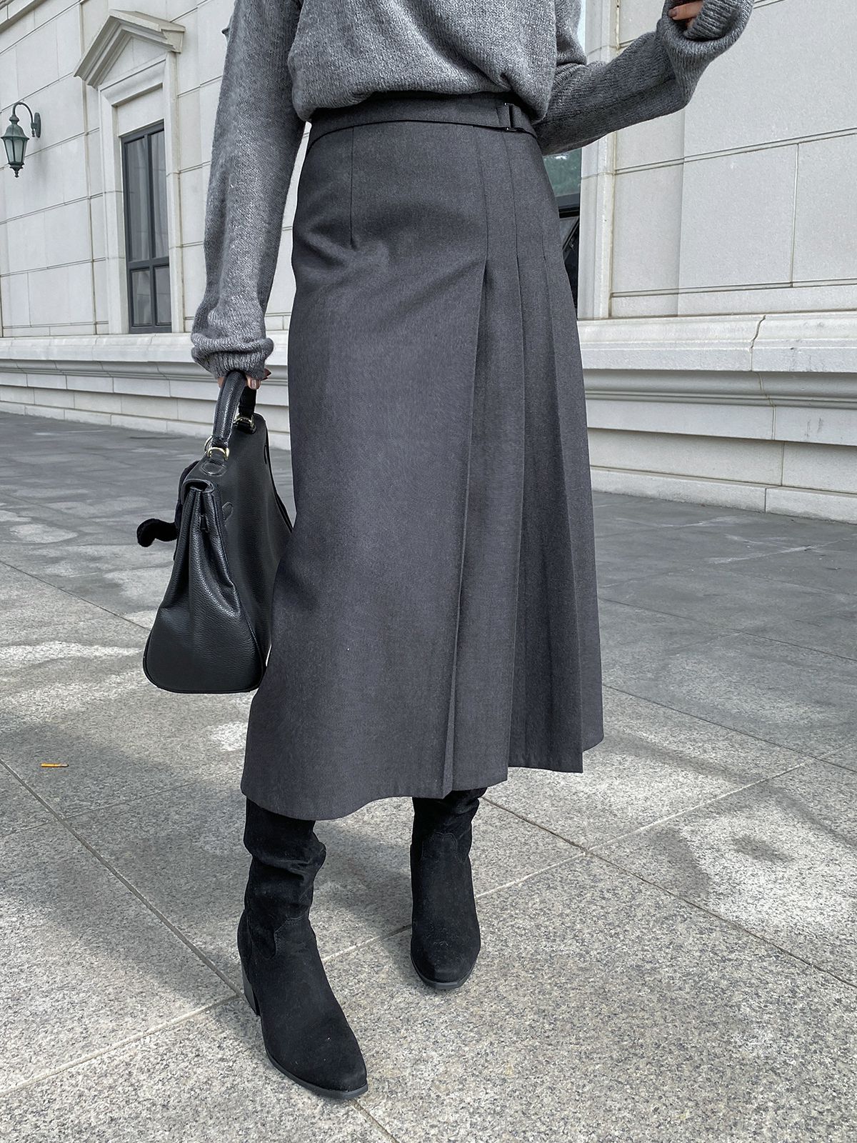 皮帶腰造型(不可調)/毛呢裙/西裝裙/百褶裙/斜邊壓褶/後腰小段鬆緊/側拉鍊 - 休閒婚禮OL上班族簡約百搭素面高腰三褶傘裙抓褶長裙深灰色黑色
