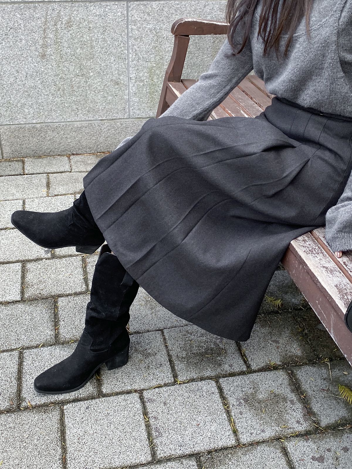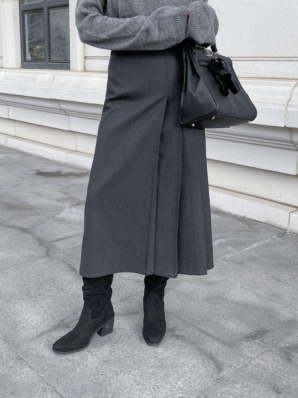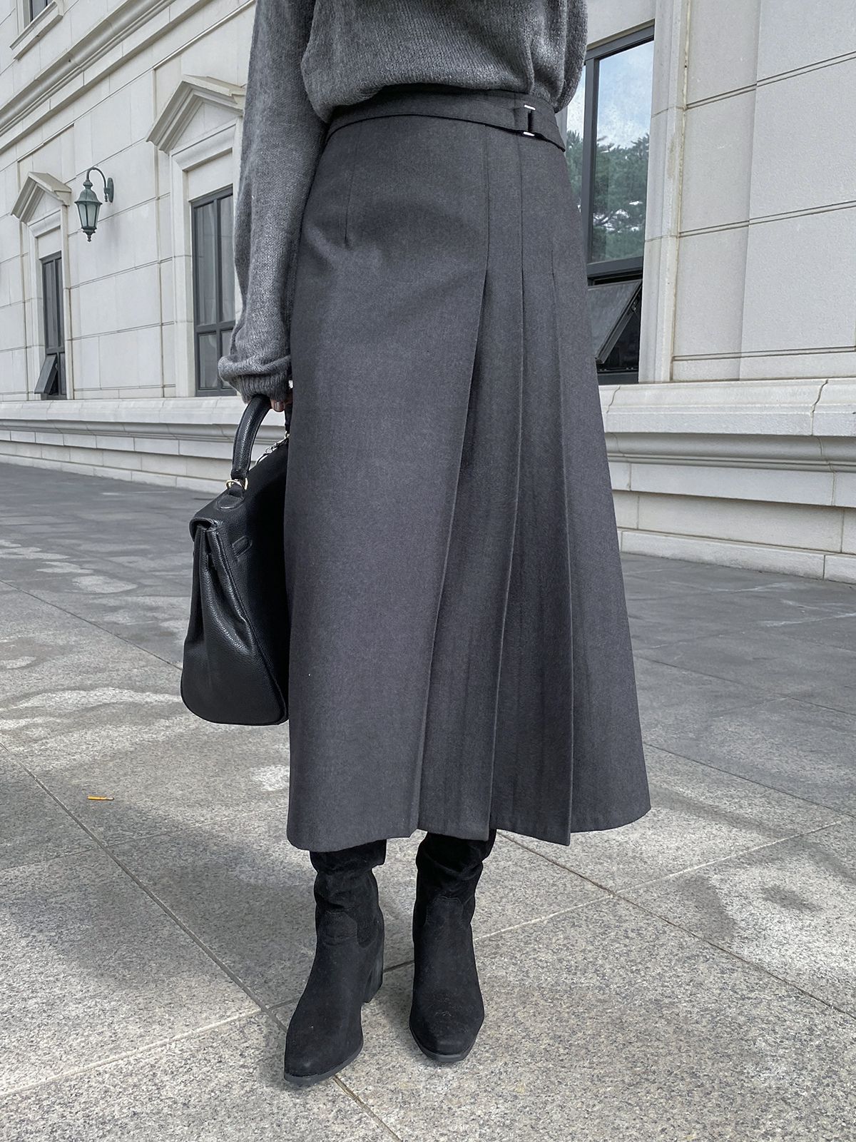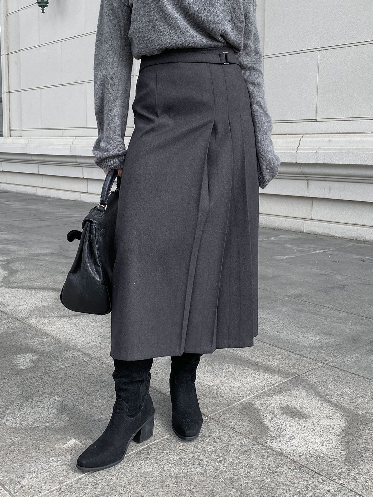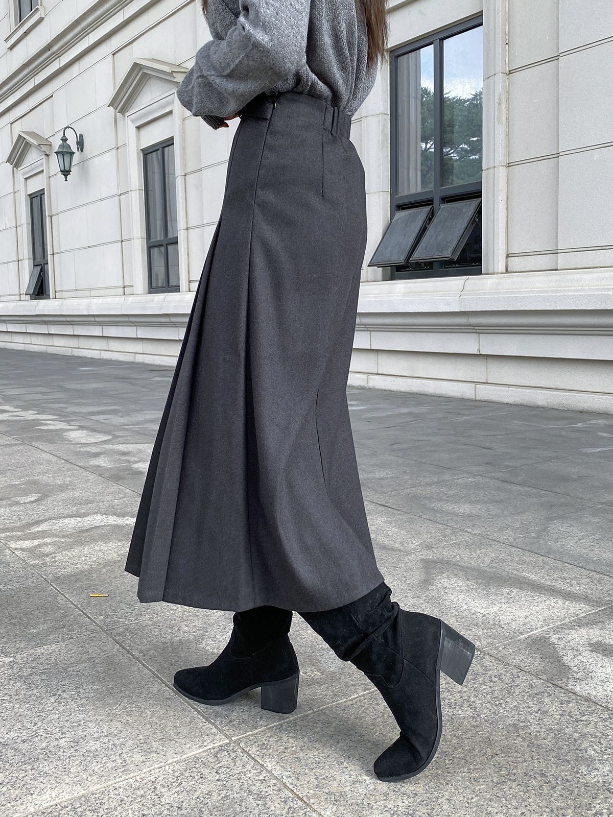 皮帶腰造型(不可調)/毛呢裙/西裝裙/百褶裙/斜邊壓褶/後腰小段鬆緊/側拉鍊 - 休閒婚禮OL上班族簡約百搭素面高腰三褶傘裙抓褶長裙深灰色黑色
