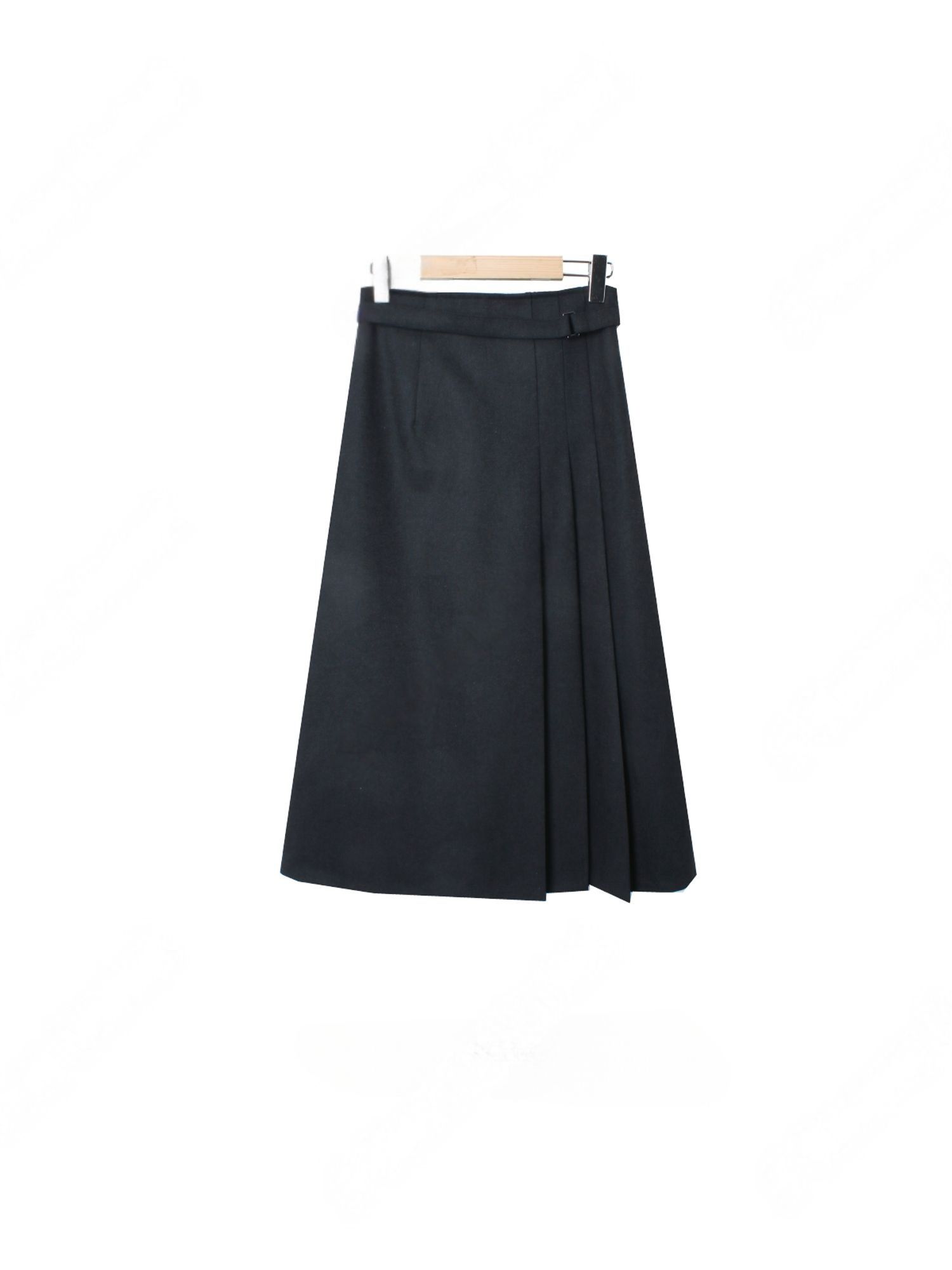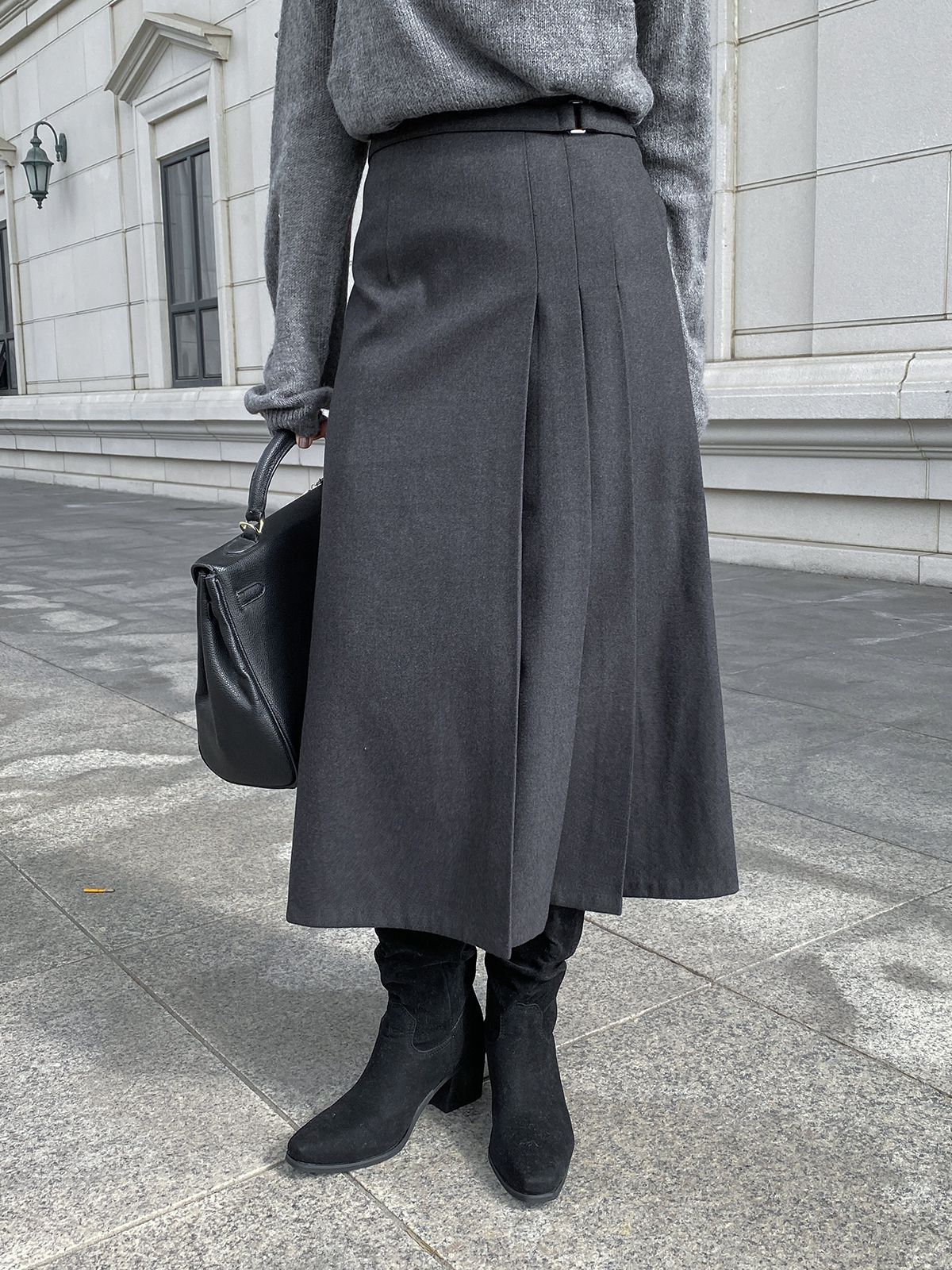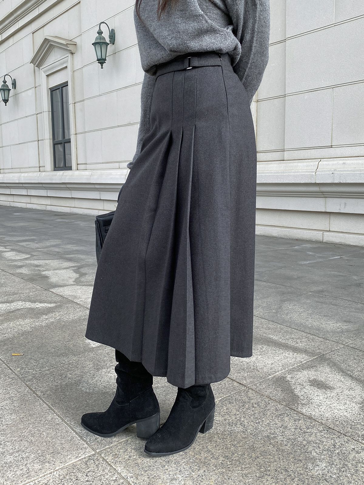 【C55854】韓國LND 高腰三褶傘裙-OL素面皮帶腰毛呢西裝抓褶長裙★★