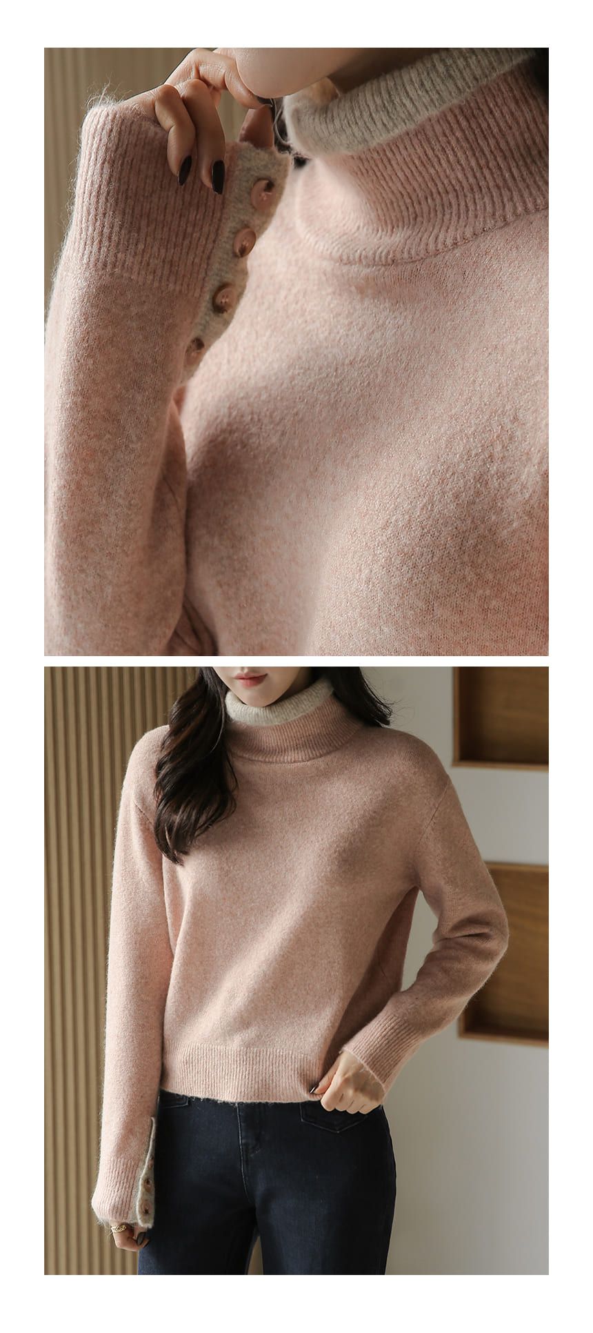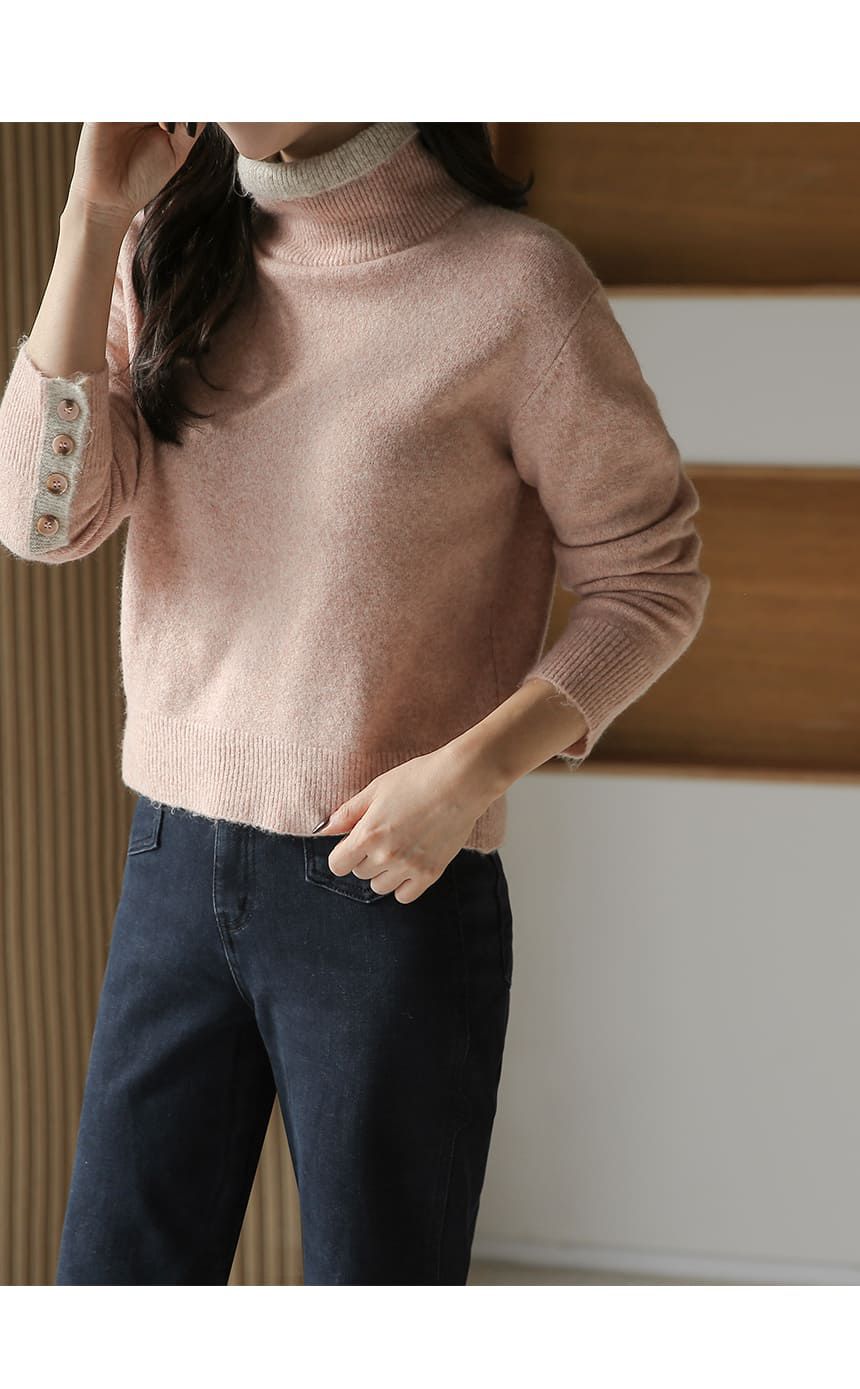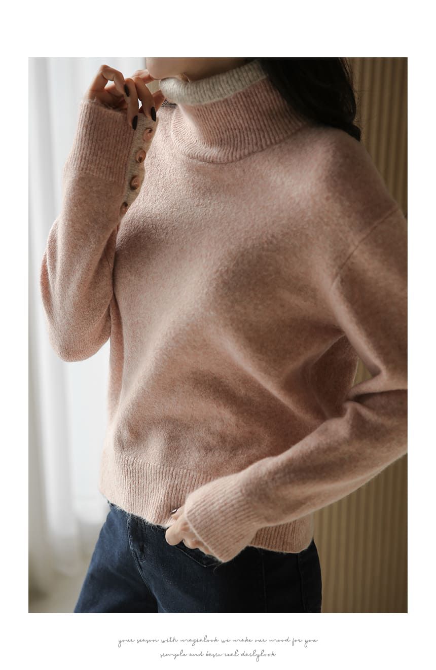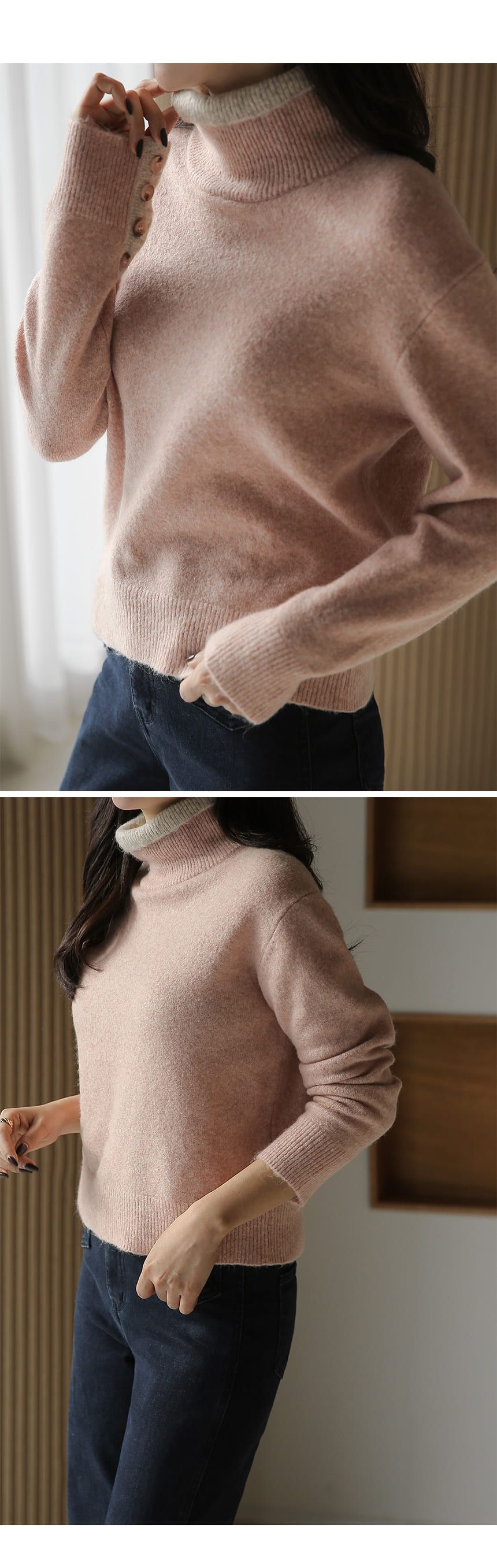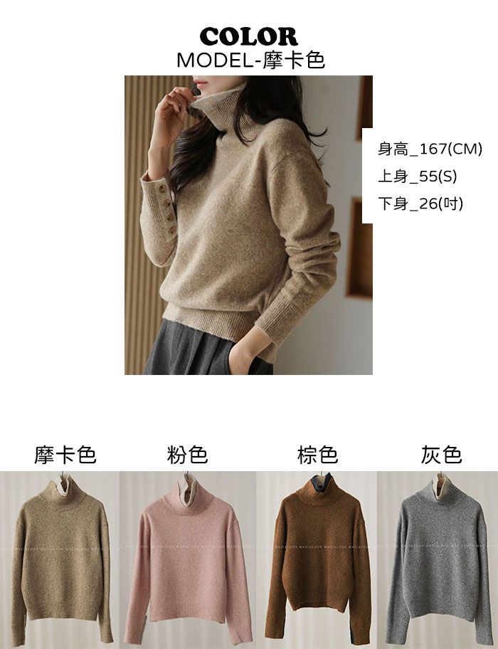 假兩件拼接/袖口排釦(可開)/立領.高領/雙層領 - 休閒居家簡約百搭素面雙層立領針織衫針織上衣長袖上衣摩卡色粉色棕色灰色