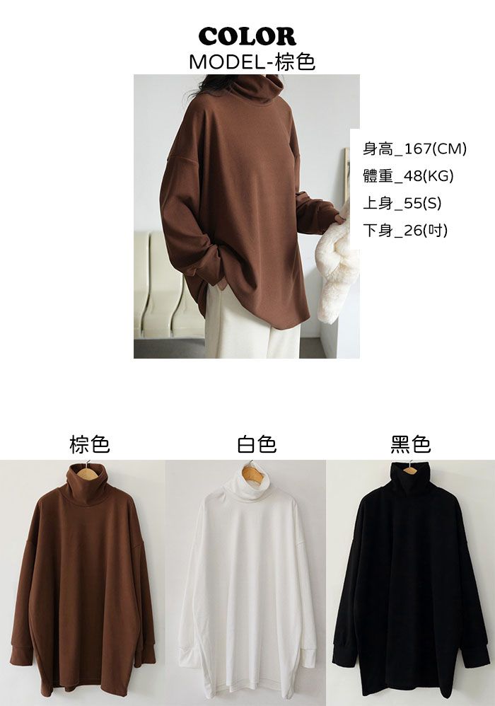 【C55882】韓國HAN 蜜桃絨高領上衣-寬鬆長版素面立領長袖T恤★★