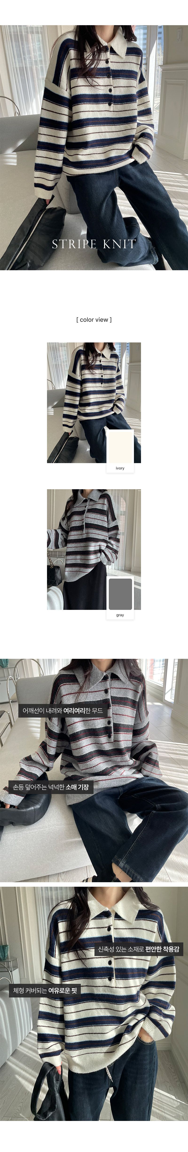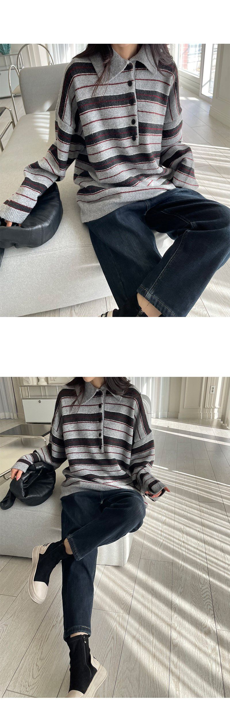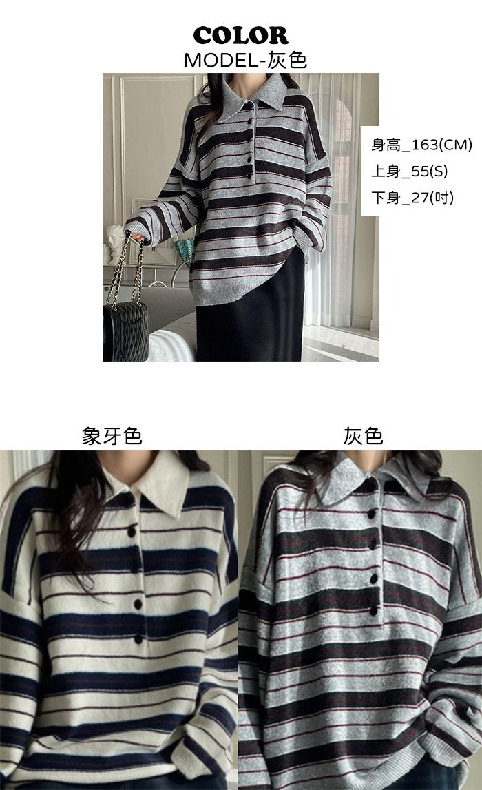 雙色.三色橫條紋/半開襟排釦領/寬鬆長版 - 休閒居家配色條紋上衣三色條紋針織衫針織上衣寬鬆大尺碼上衣長版上衣長袖上衣象牙色灰色