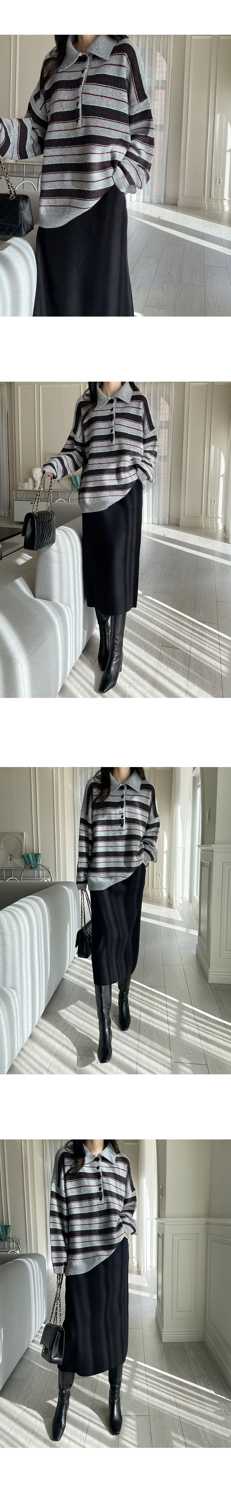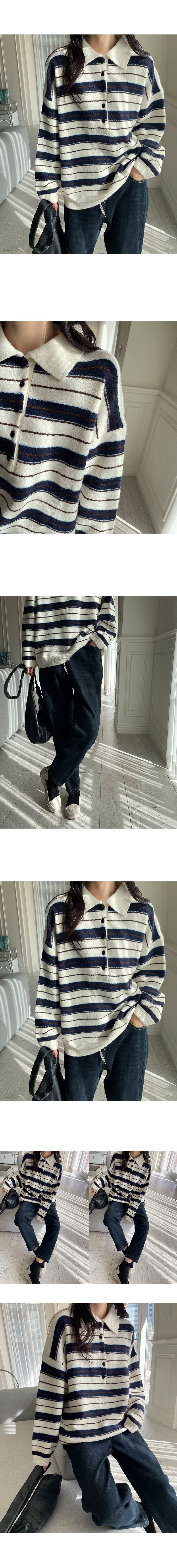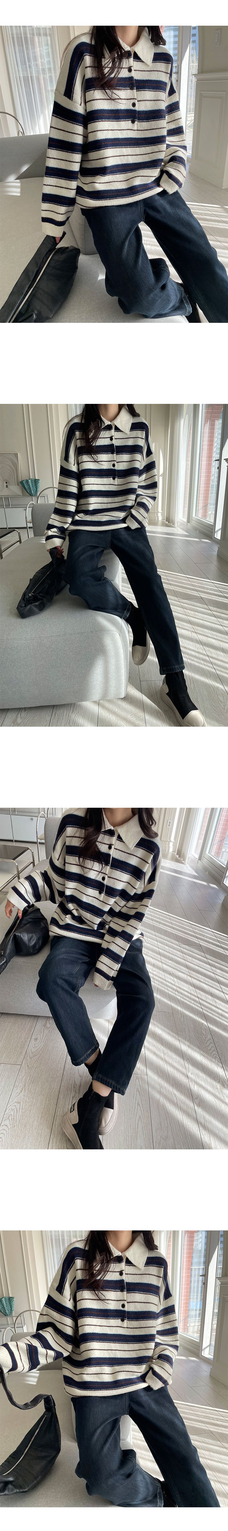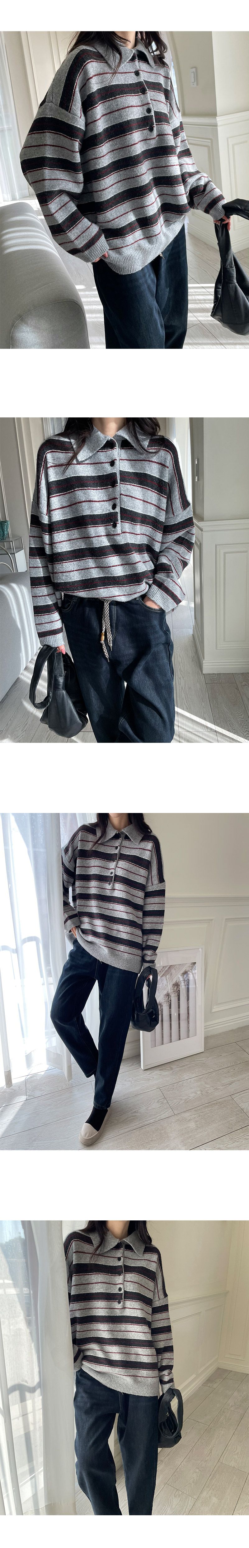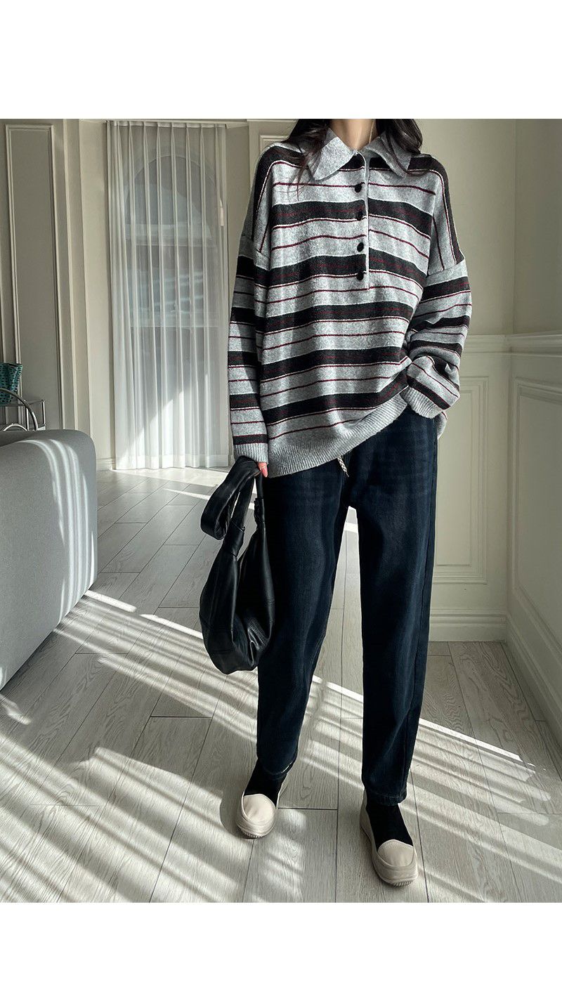 【C55883】韓國MNR 三色條紋針織衫-半開襟排釦領寬鬆長版長袖上衣★★
