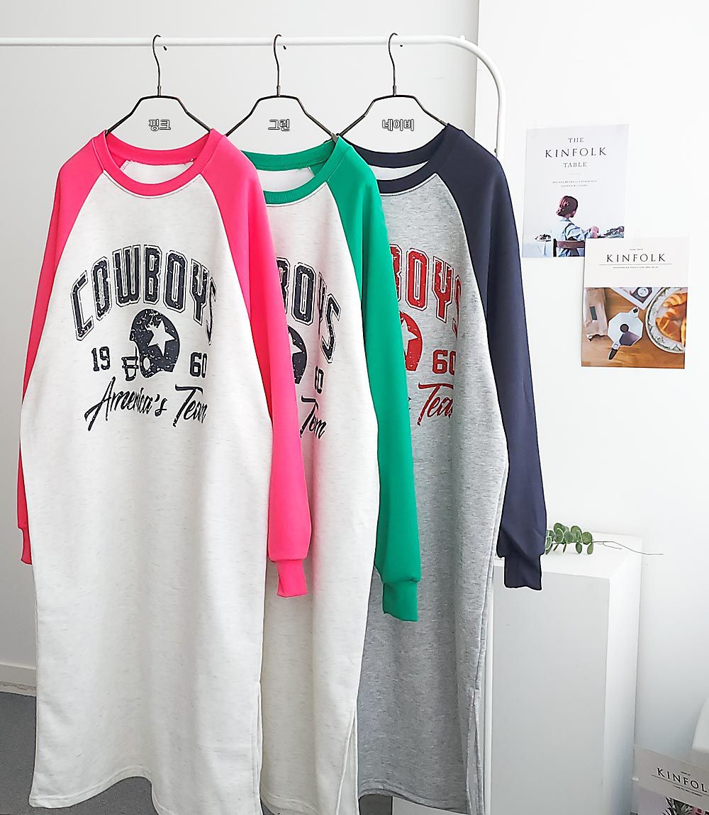 斑駁感膠印字母/圓領/撞色插肩袖/連肩袖/內刷毛洋裝/寬鬆大尺碼洋裝/側開衩 - 休閒居家英文字母洋裝一件式洋裝個性字母連身裙長袖洋裝深藍色粉色綠色