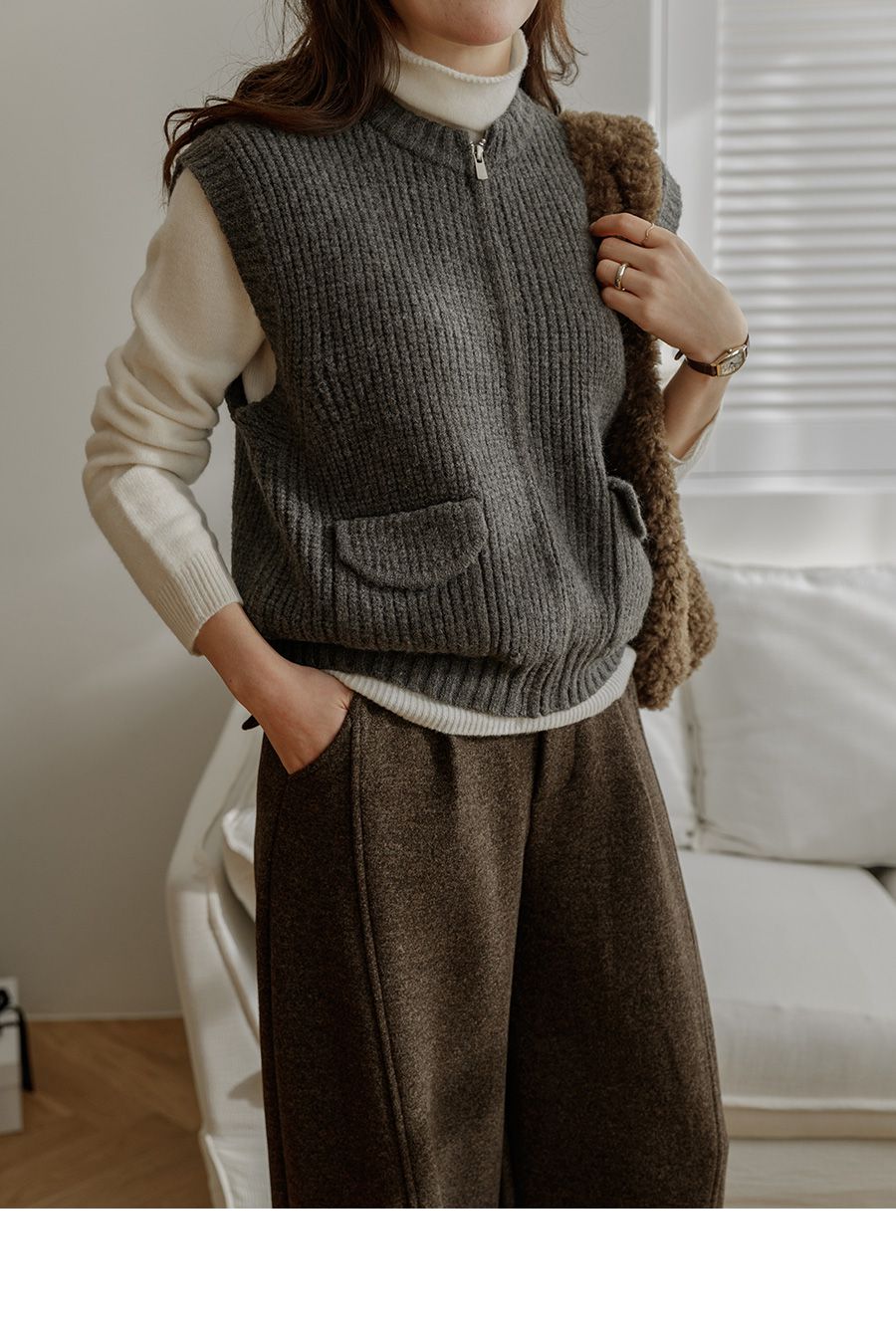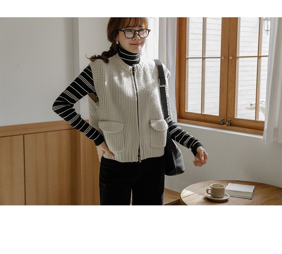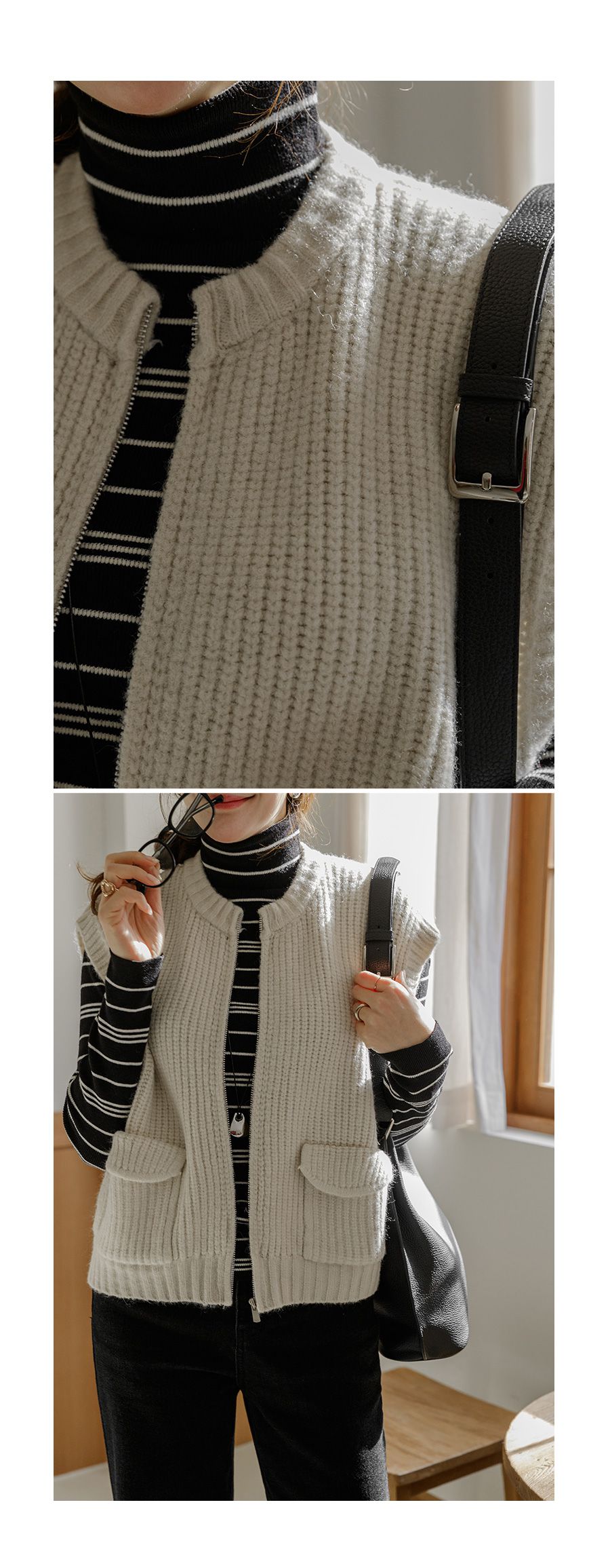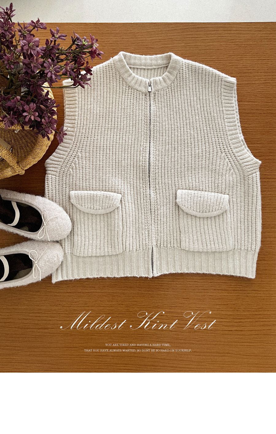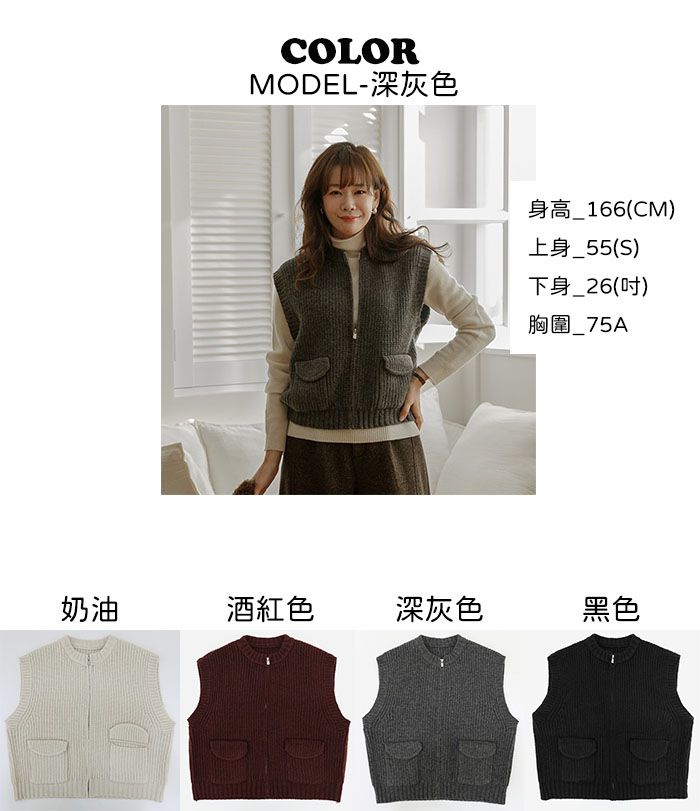 【C55889】韓國JAM 立體口袋針織衫-雙口袋圓領素面無袖拉鍊背心外套★★