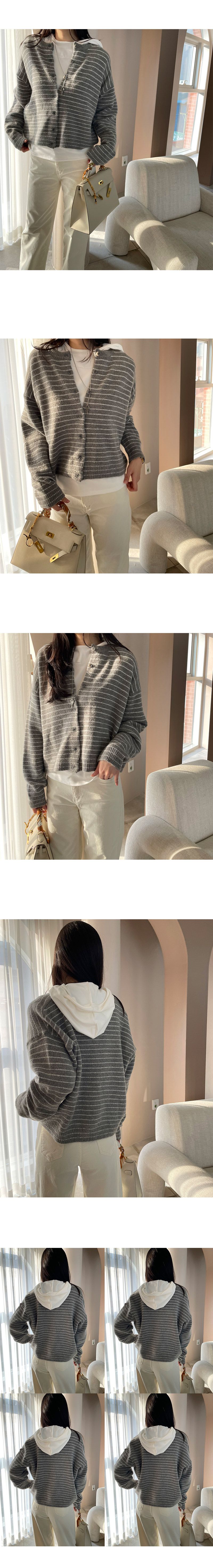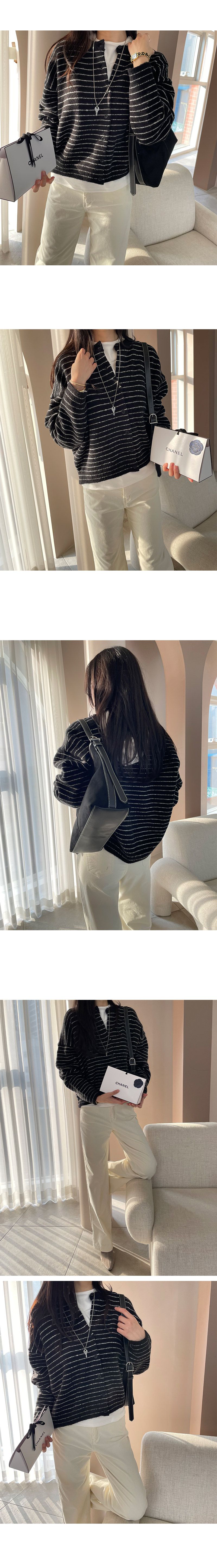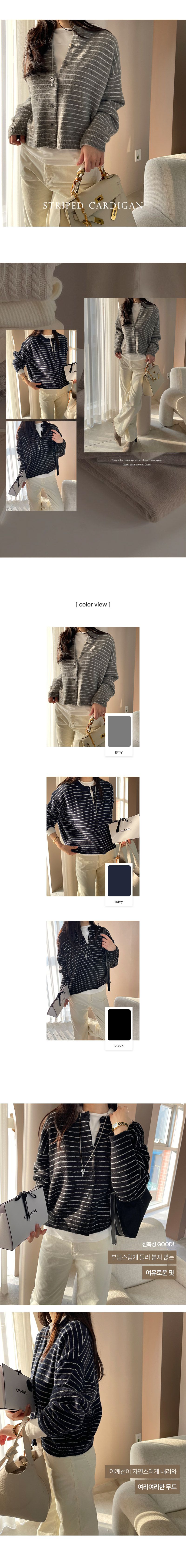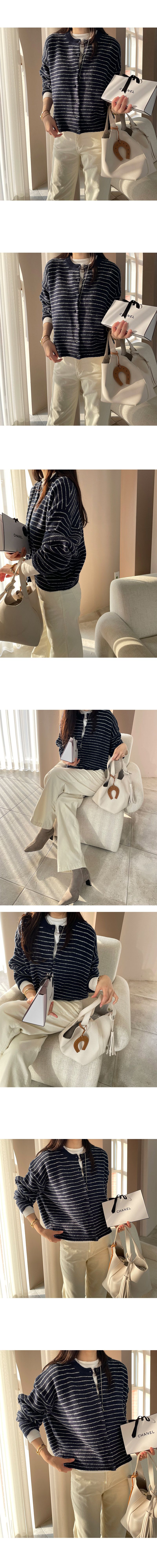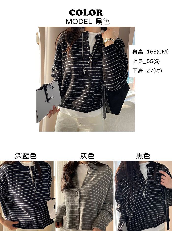 加厚滾邊圓領/開襟排釦/寬鬆短版/橫條紋 - 休閒居家渡假條紋上衣條紋外套細條紋針織衫針織上衣針織外套寬鬆大尺碼上衣大尺碼外套長袖上衣外套深藍色灰色黑色