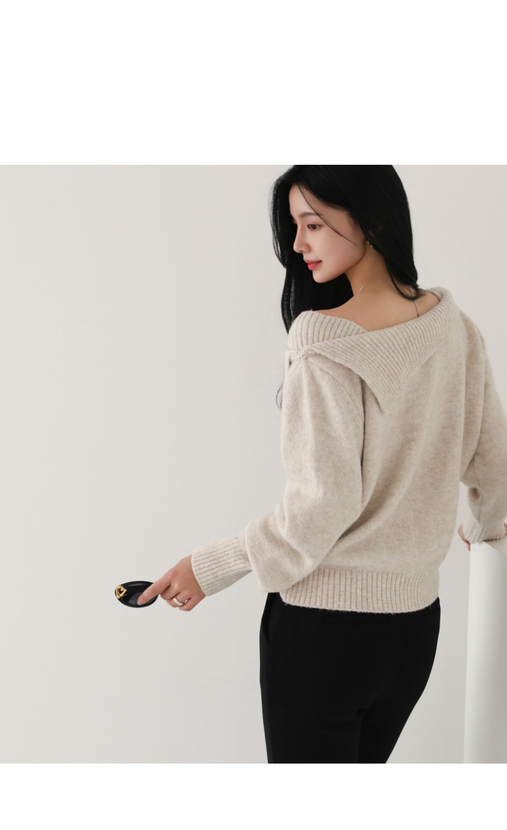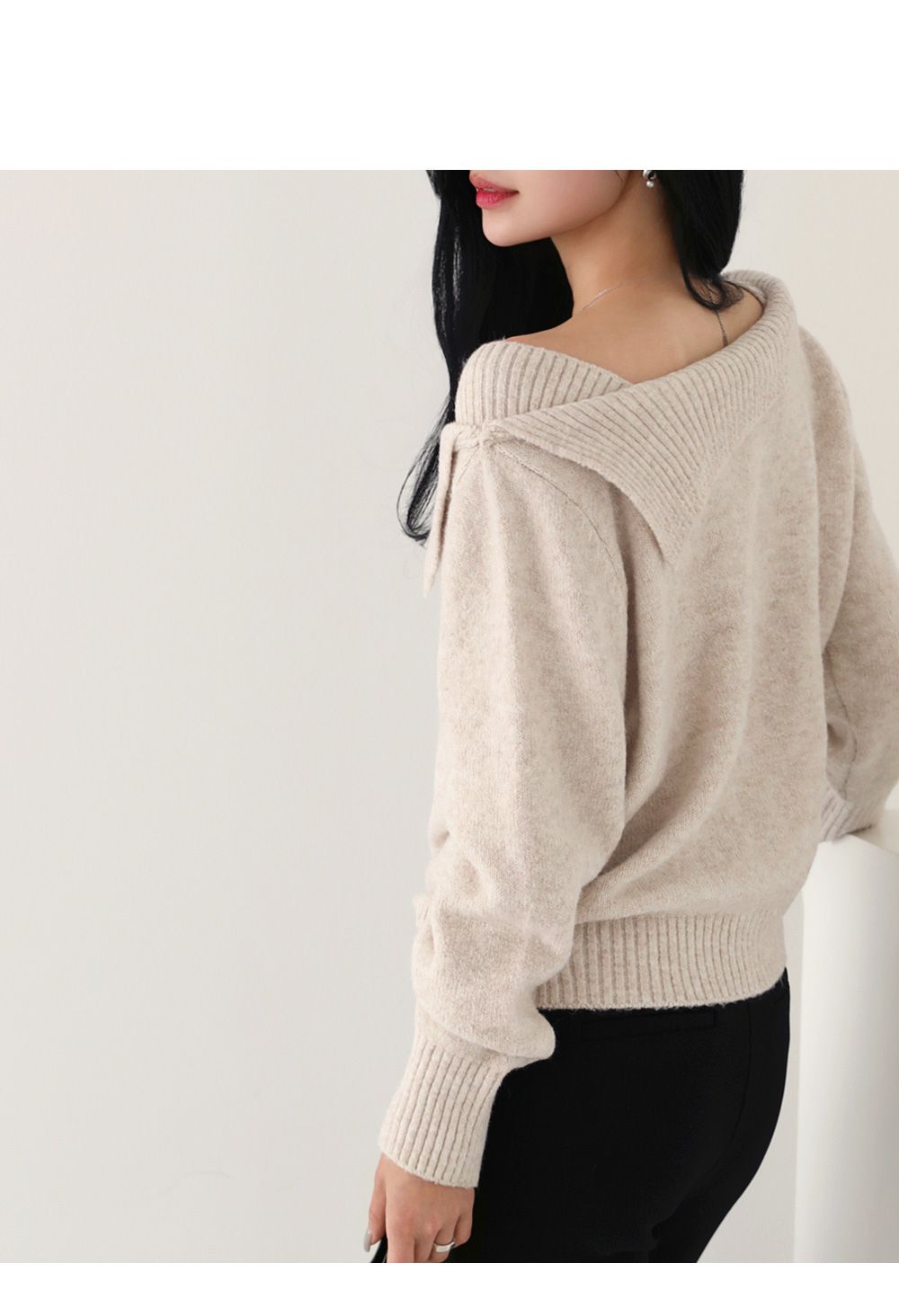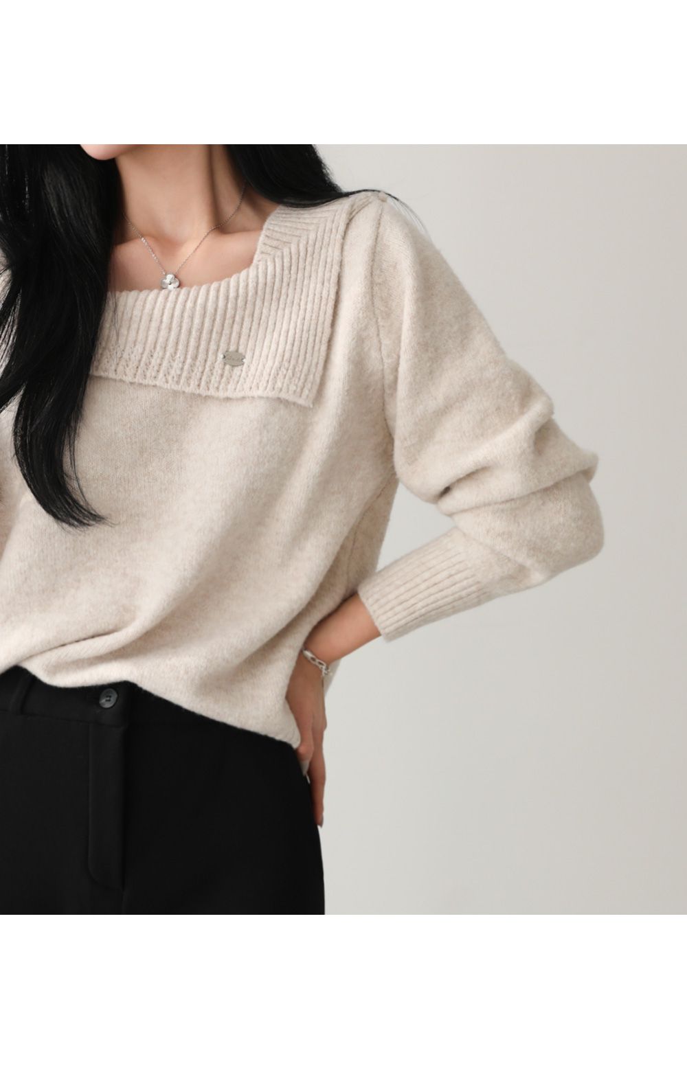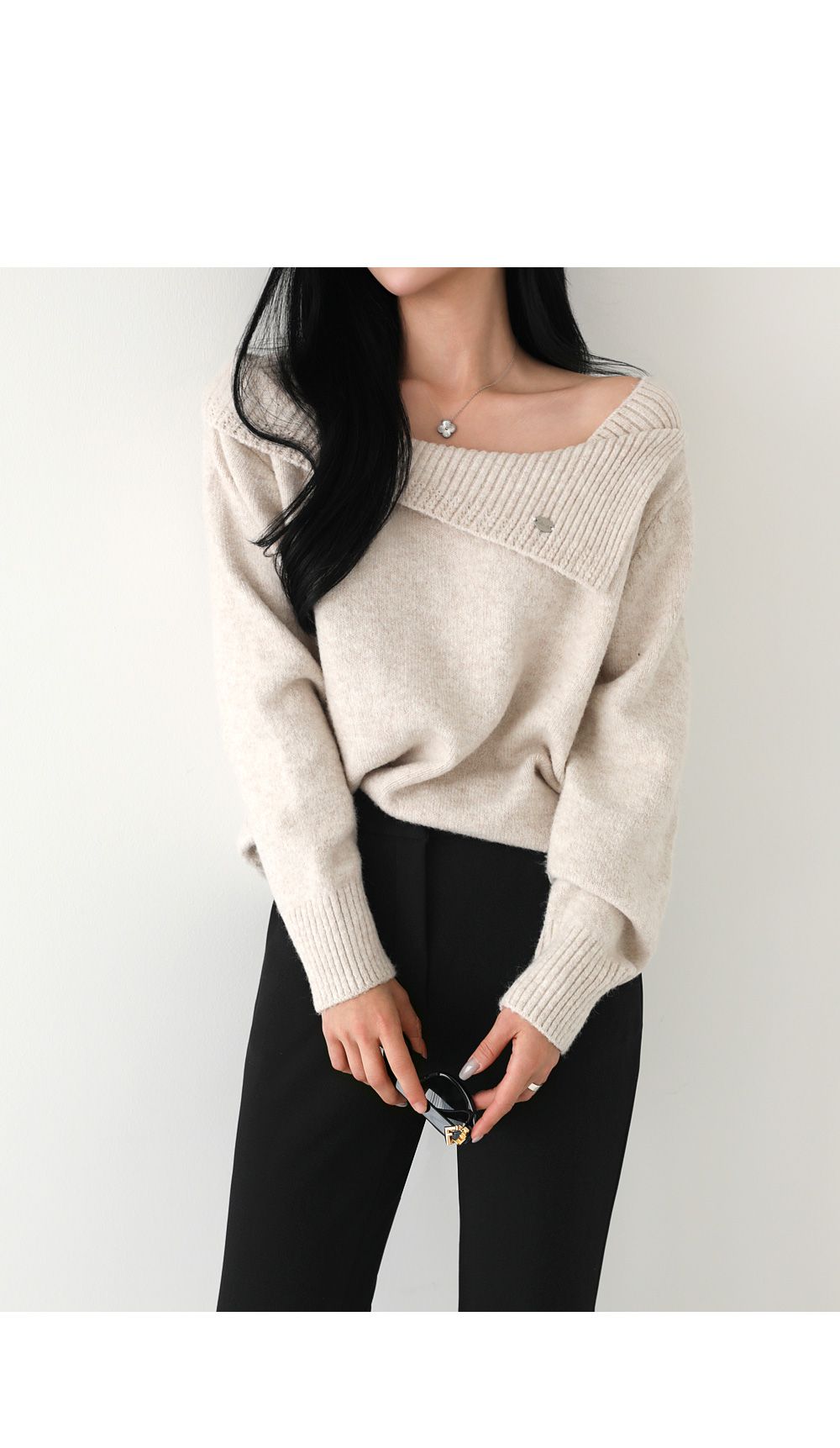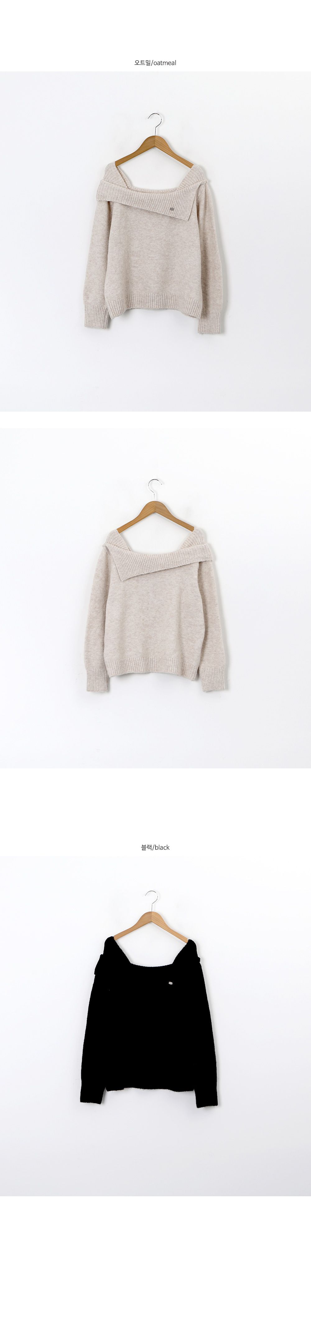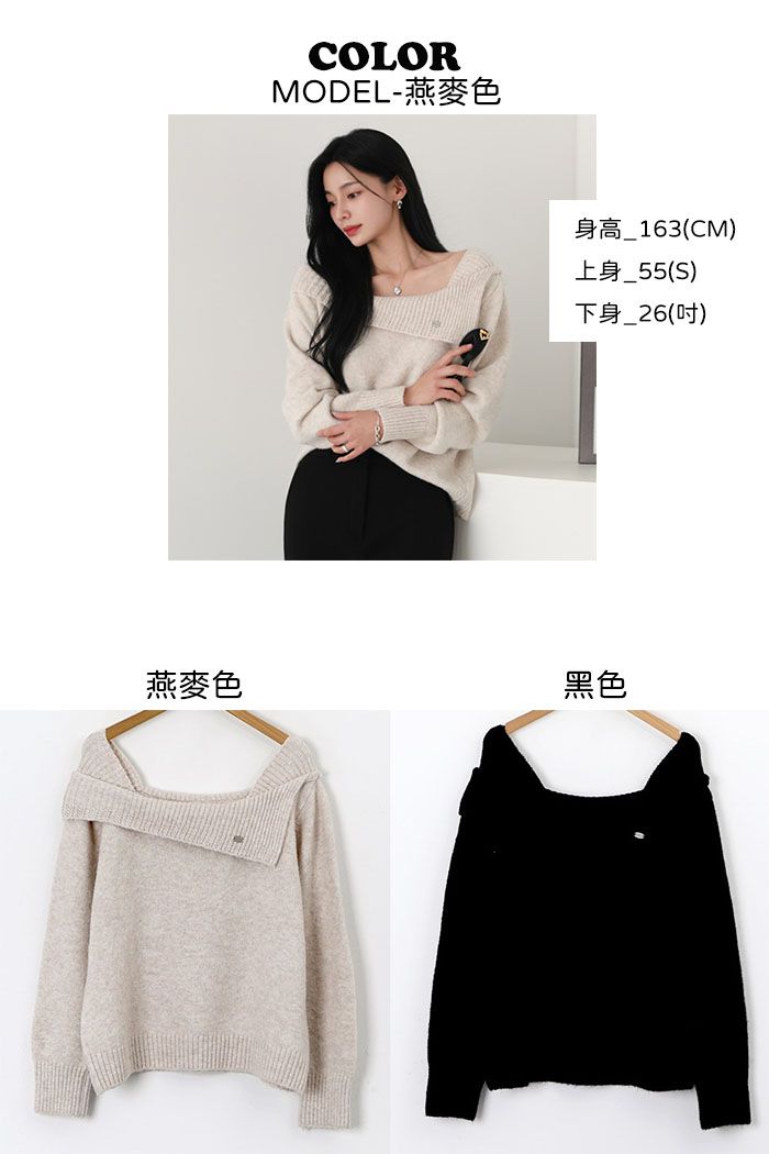 一字領.船領.斜肩.翻領/LOGO金屬標/斜切不規則 - 休閒居家婚禮簡約百搭素面斜肩翻領針織衫針織上衣長袖上衣燕麥色黑色