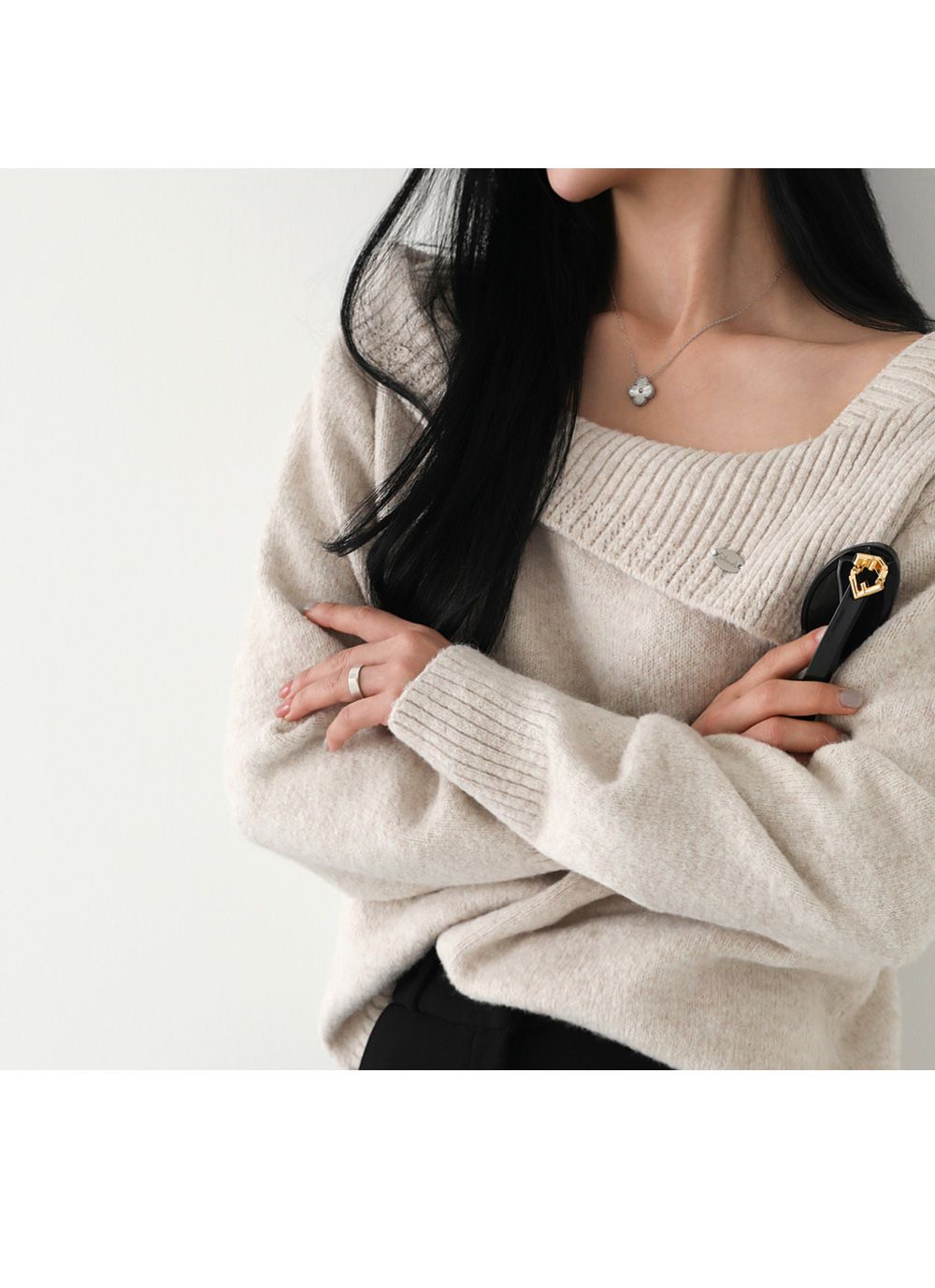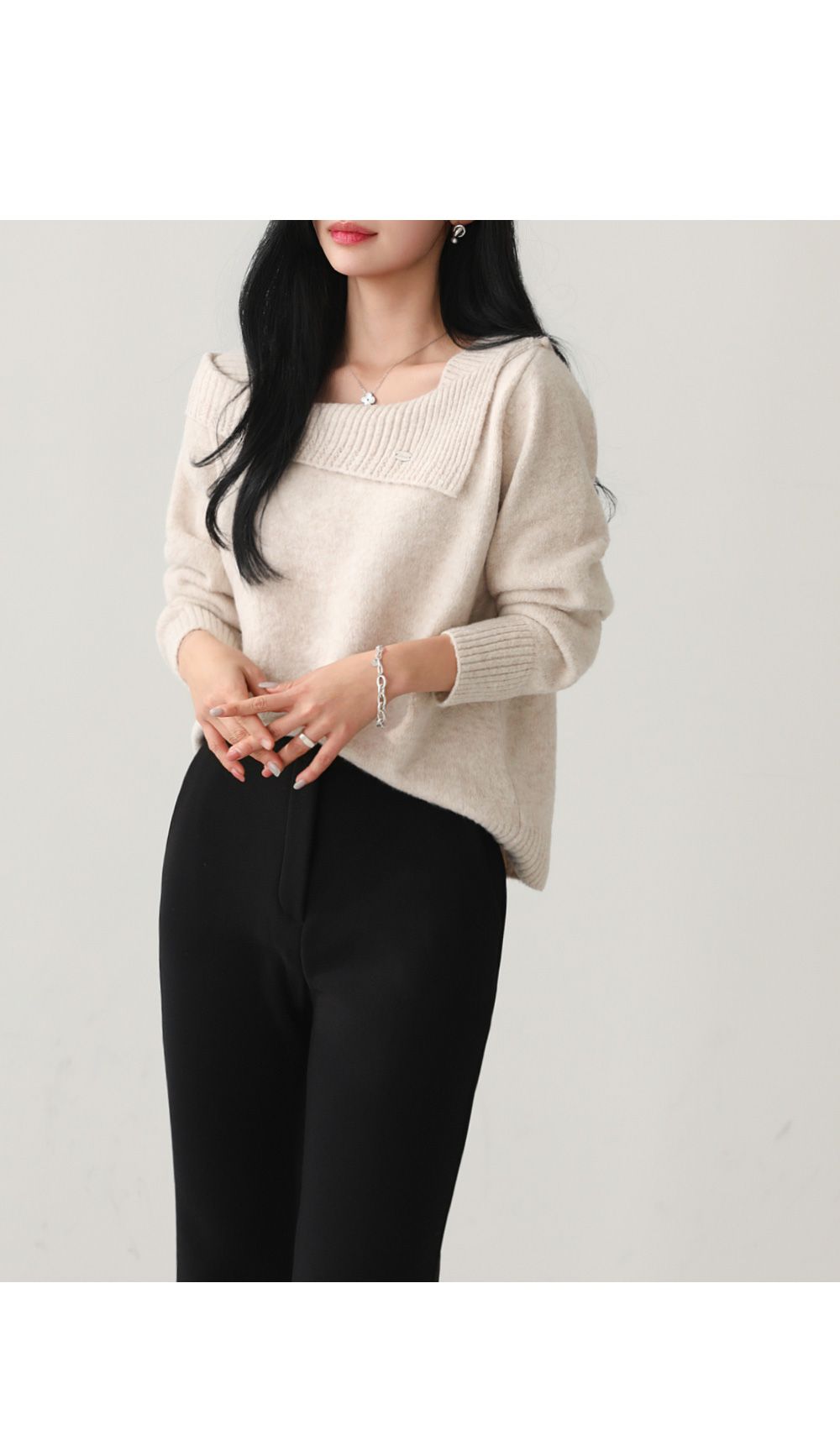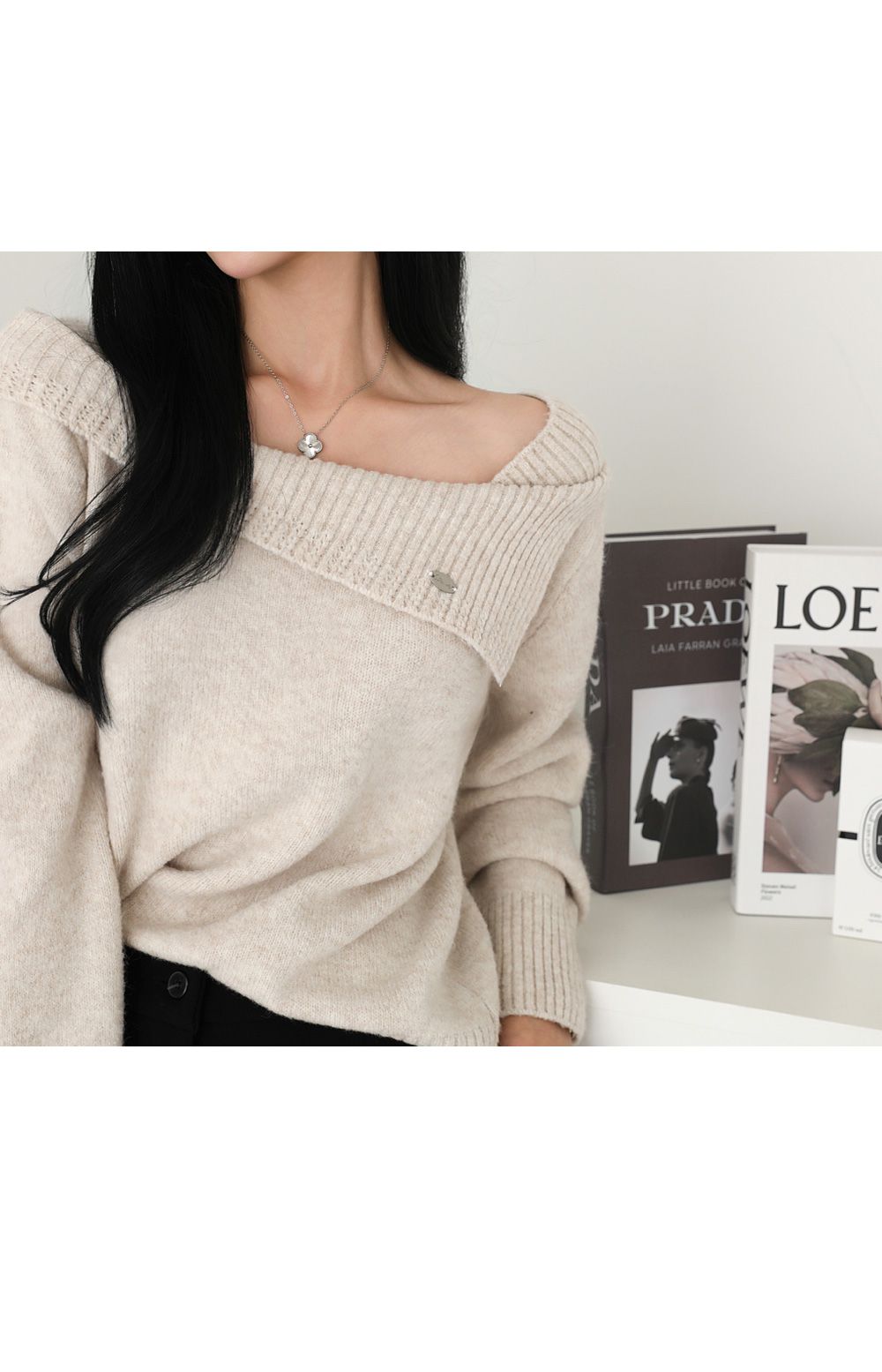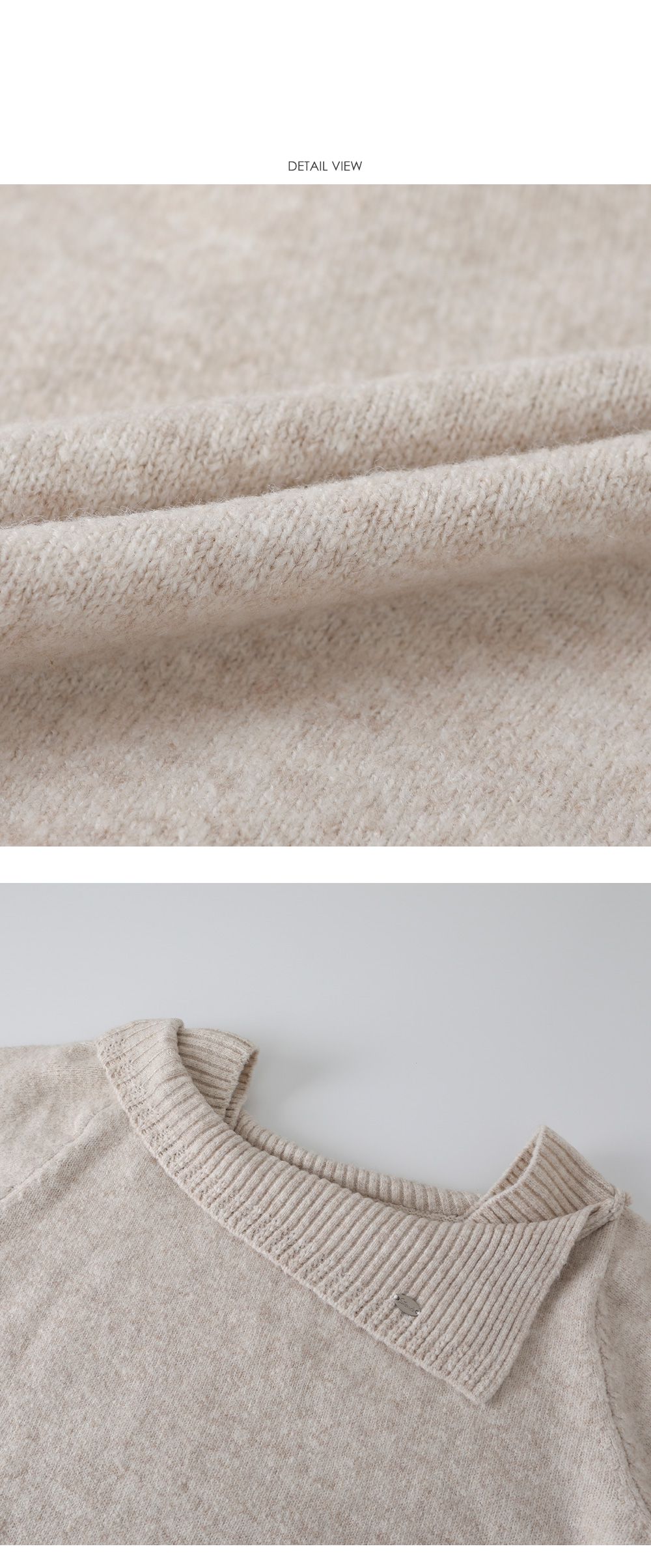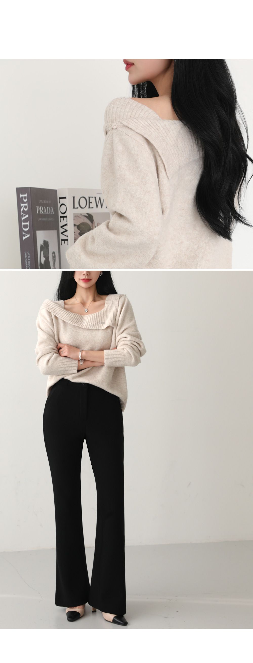 一字領.船領.斜肩.翻領/LOGO金屬標/斜切不規則 - 休閒居家婚禮簡約百搭素面斜肩翻領針織衫針織上衣長袖上衣燕麥色黑色