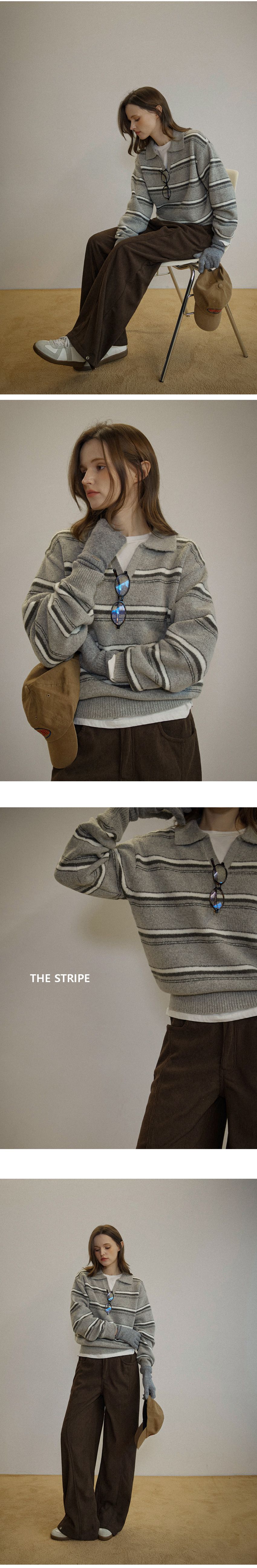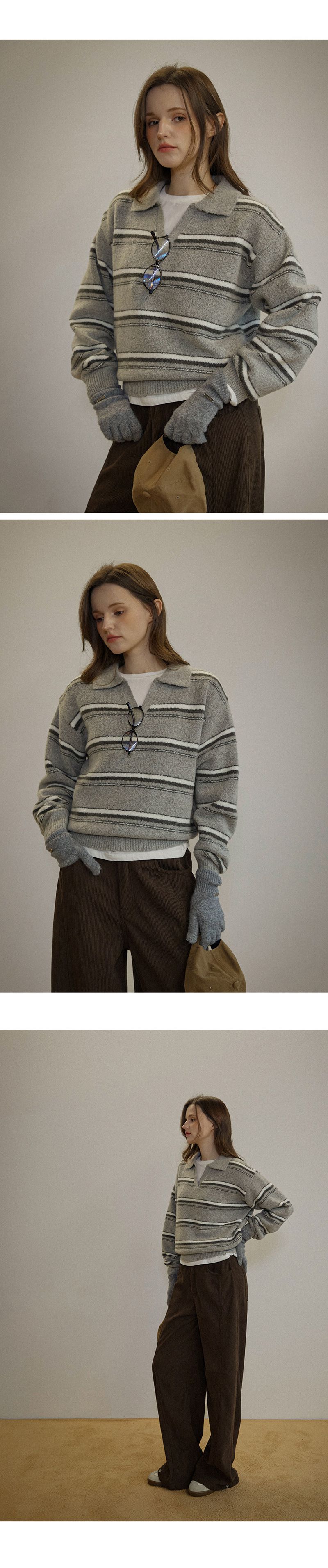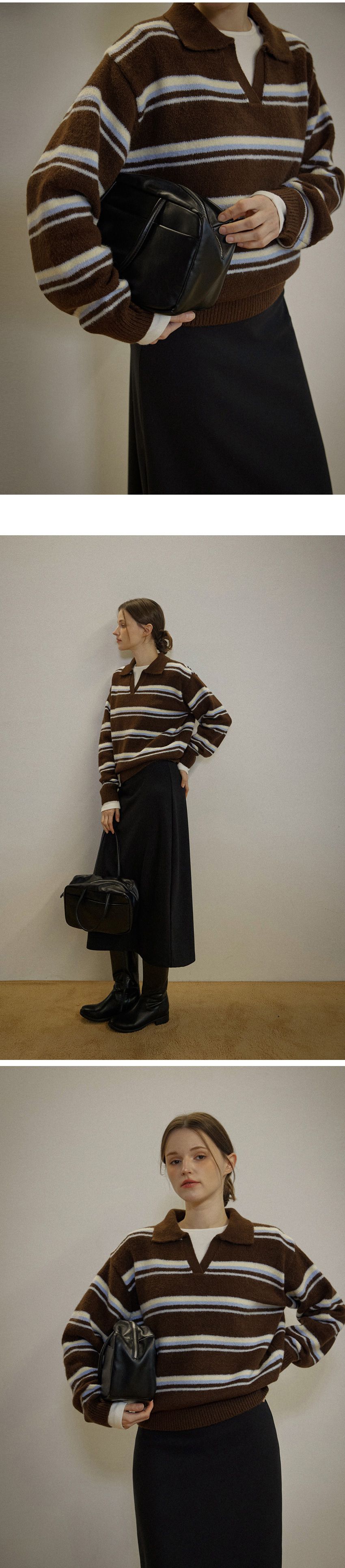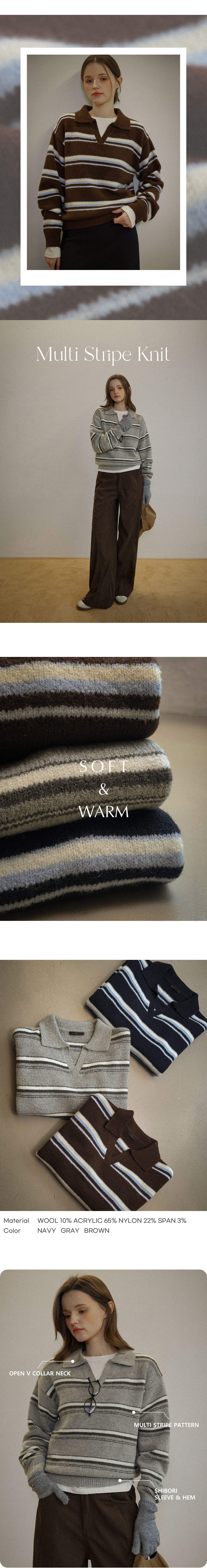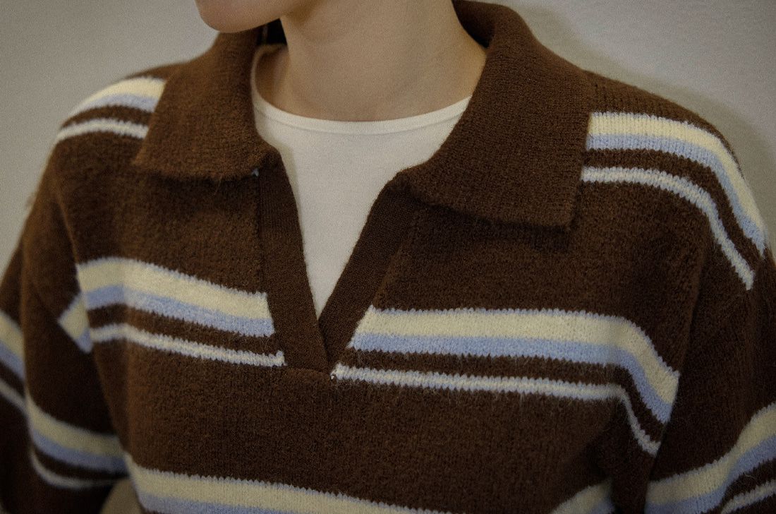 配色條紋/三色橫條紋/V領/俐落短版上衣/POLO衫 - 休閒居家渡假配色條紋上衣三色條紋針織衫針織上衣長袖上衣棕色灰色深藍色