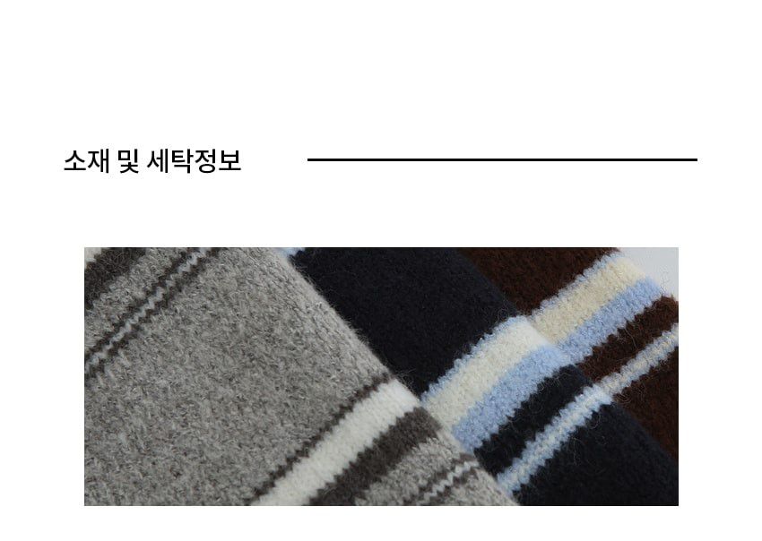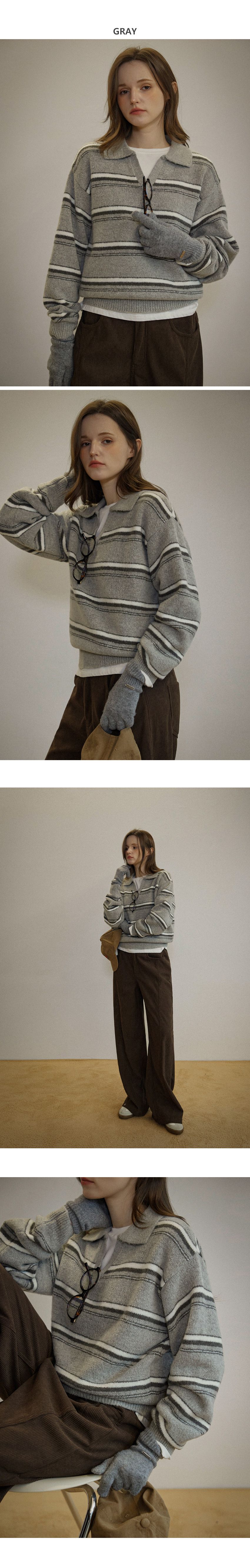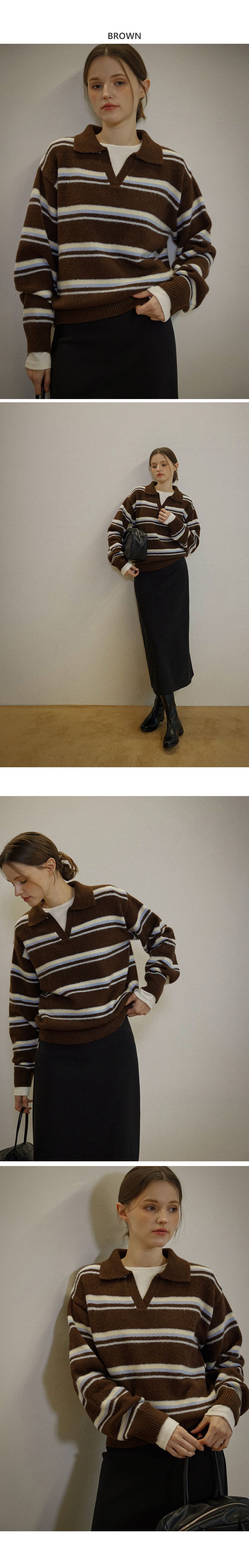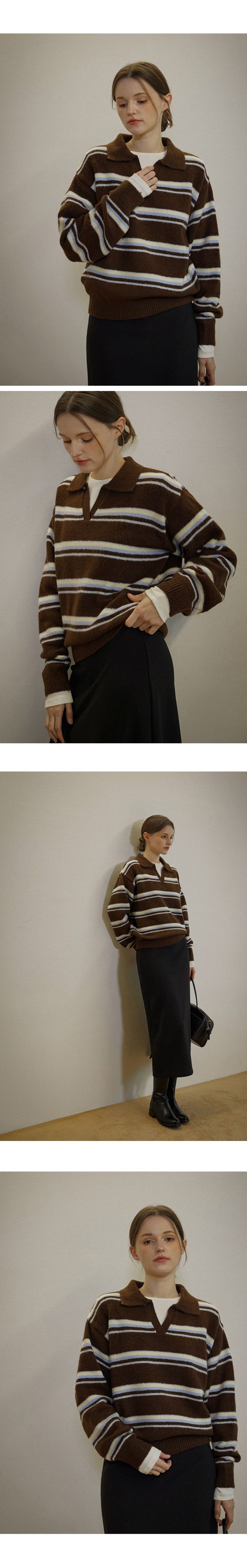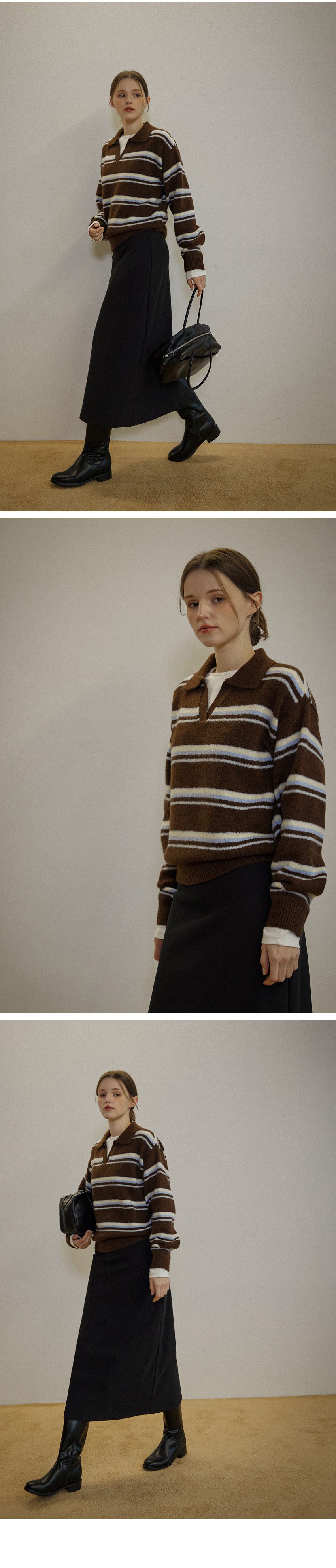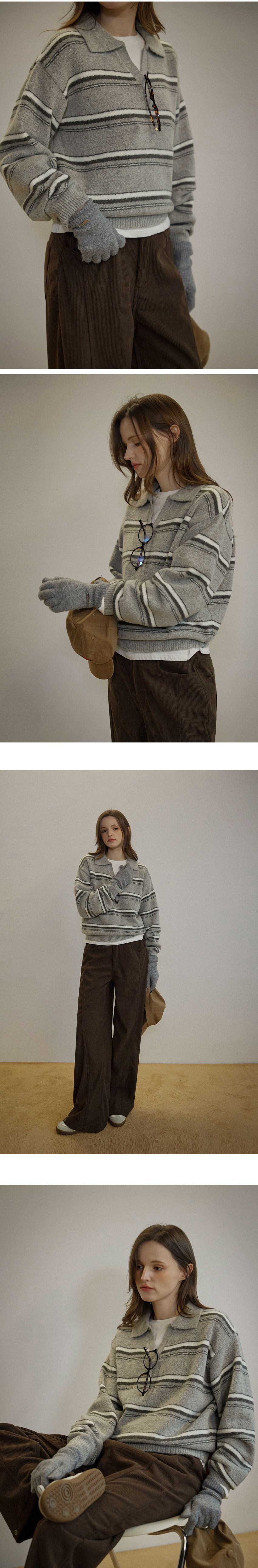 配色條紋/三色橫條紋/V領/俐落短版上衣/POLO衫 - 休閒居家渡假配色條紋上衣三色條紋針織衫針織上衣長袖上衣棕色灰色深藍色