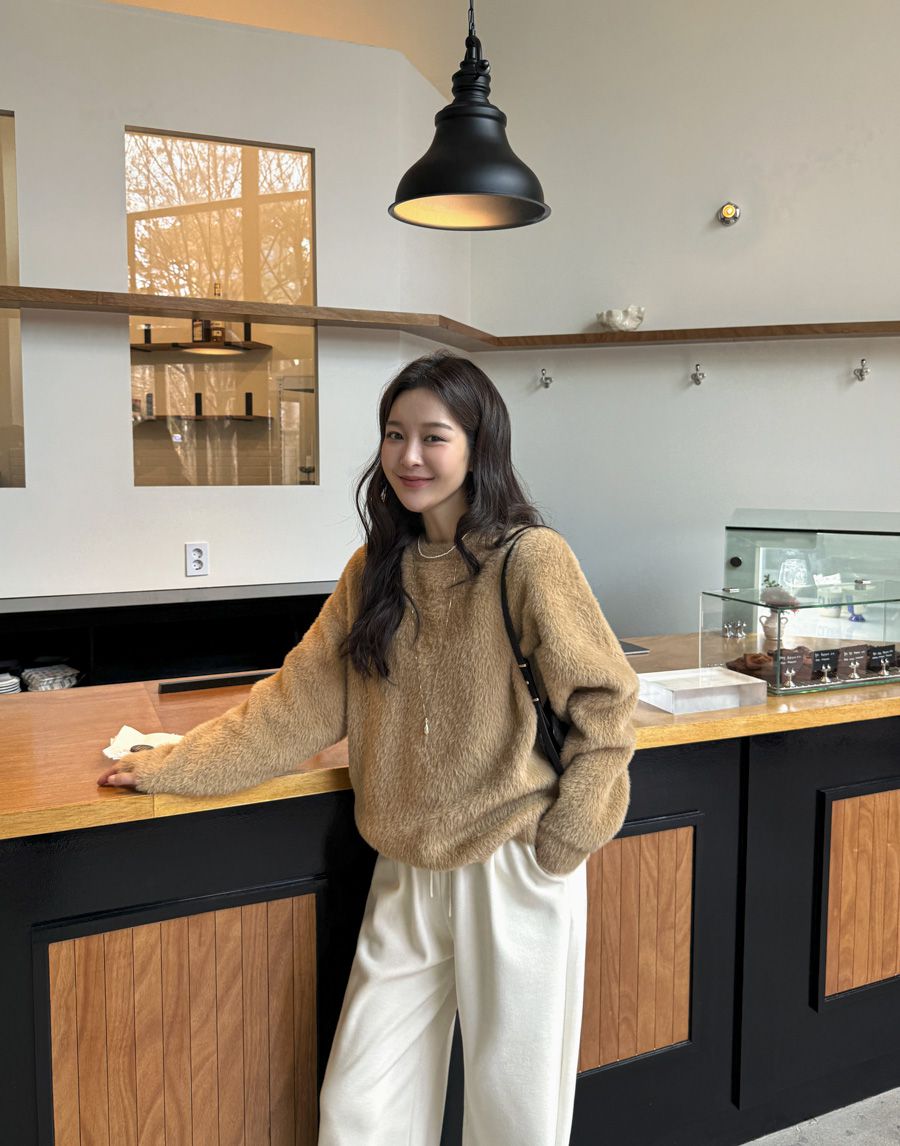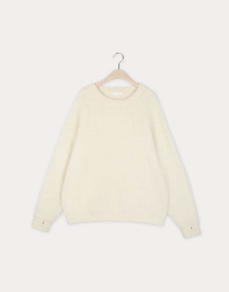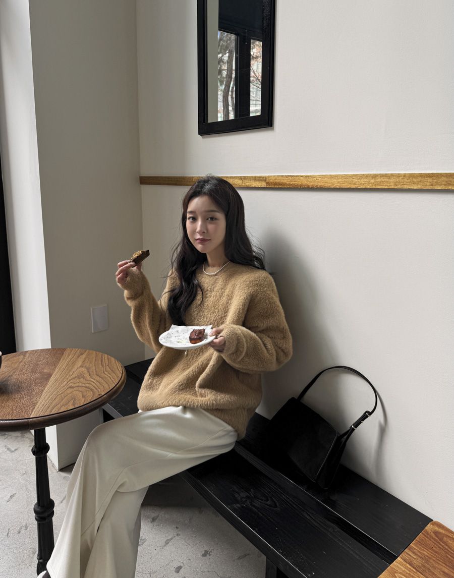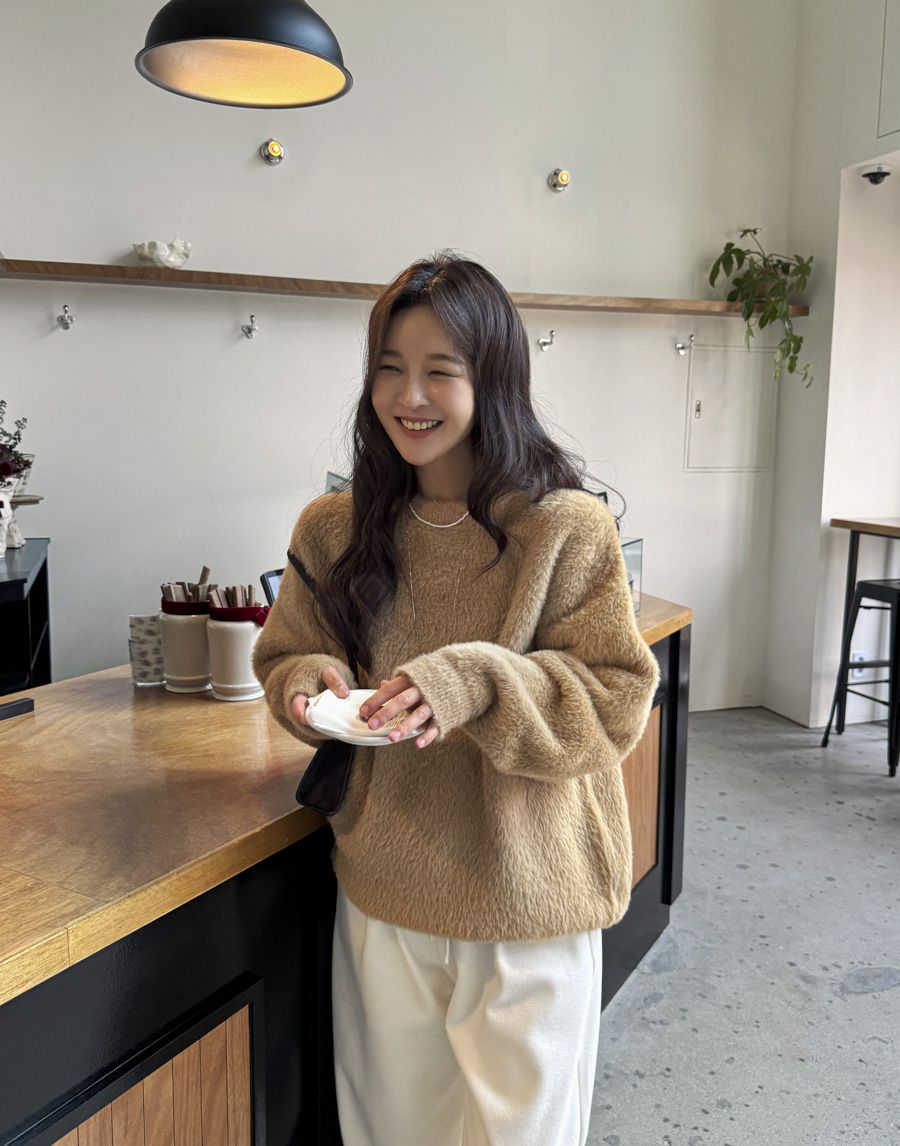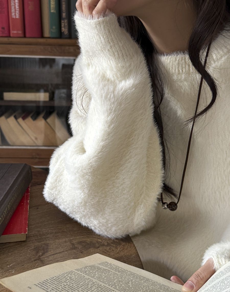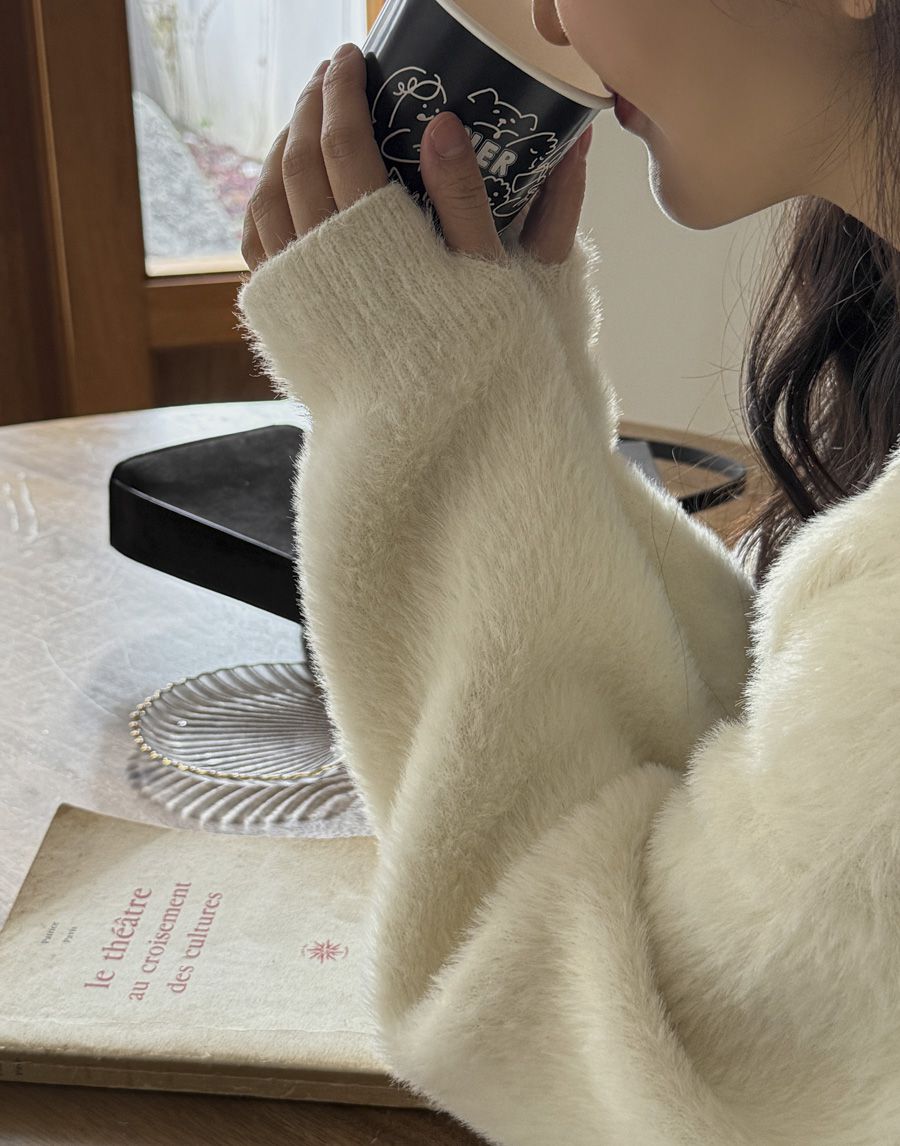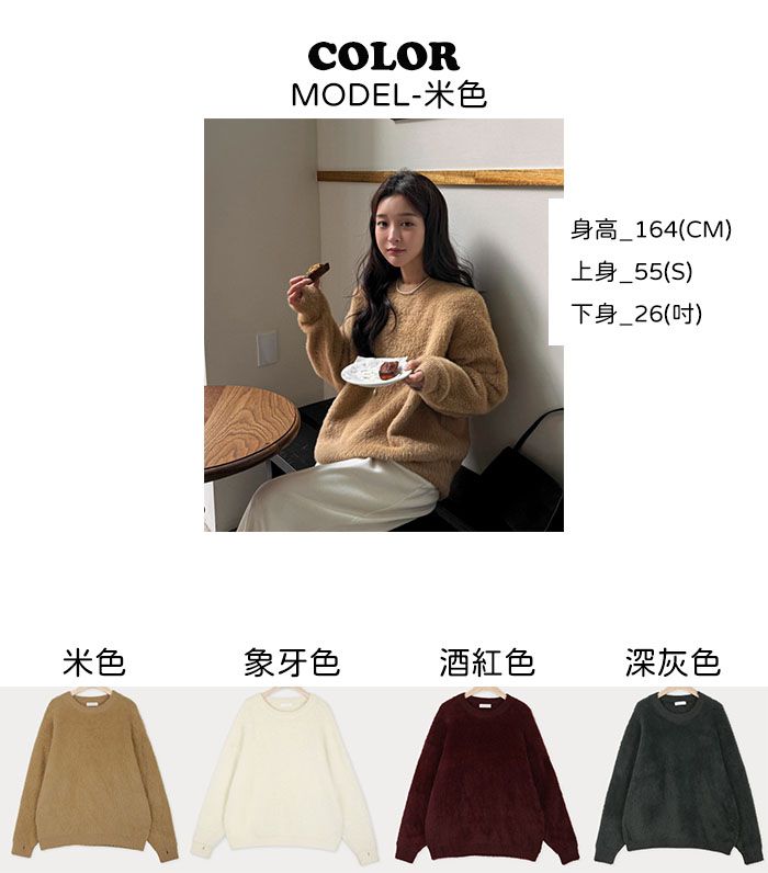 袖口挖洞抓袖設計/馬海毛針織衫/海馬毛針織衫/圓領/寬鬆版型 - 休閒居家婚禮簡約百搭素面抓袖針織衫針織上衣長袖上衣寬鬆大尺碼上衣米色象牙色酒紅色深灰色
