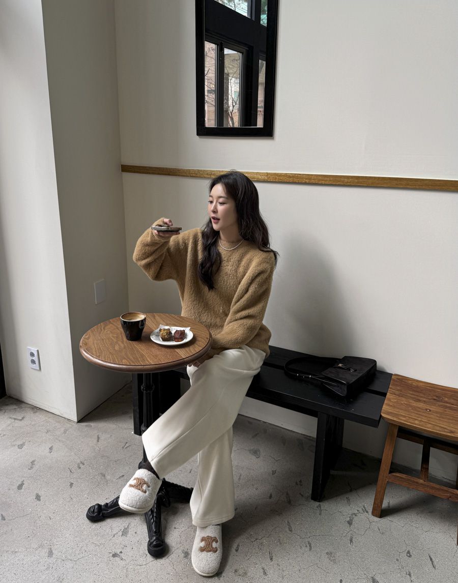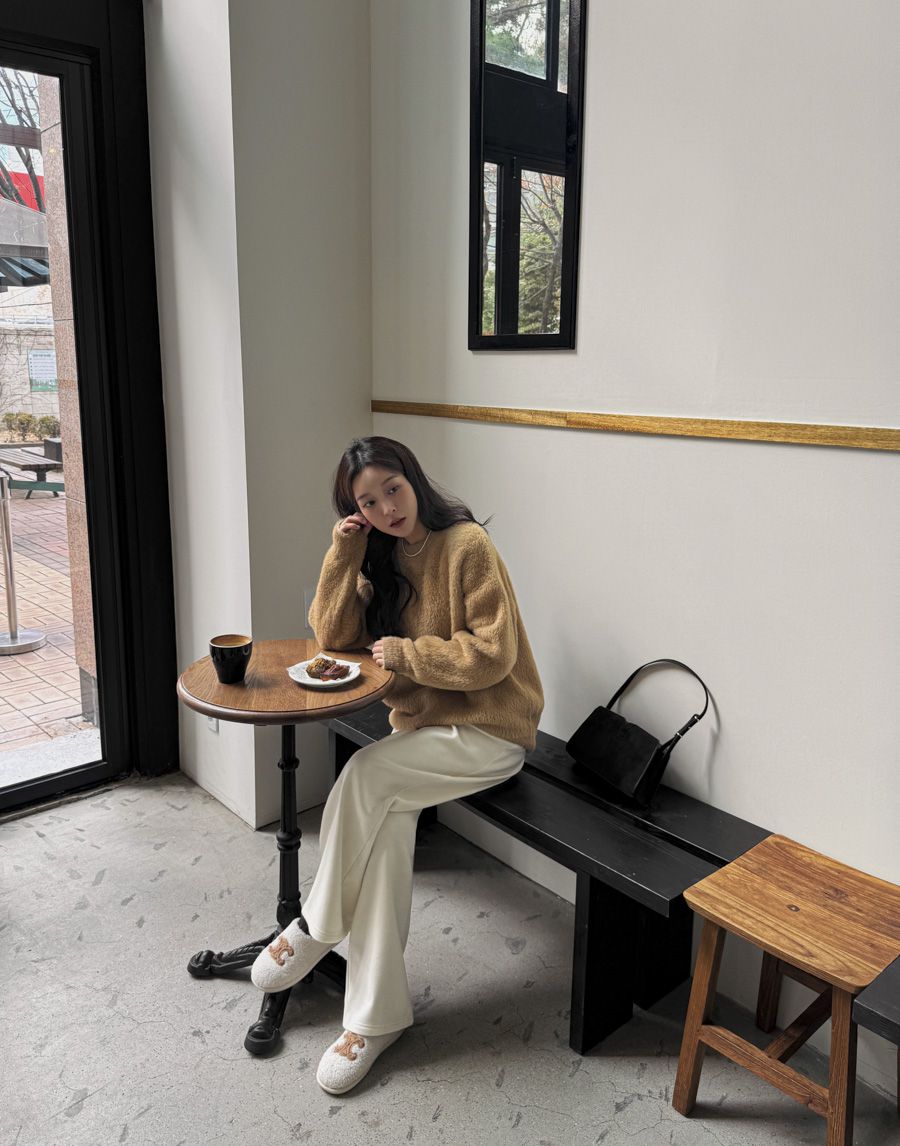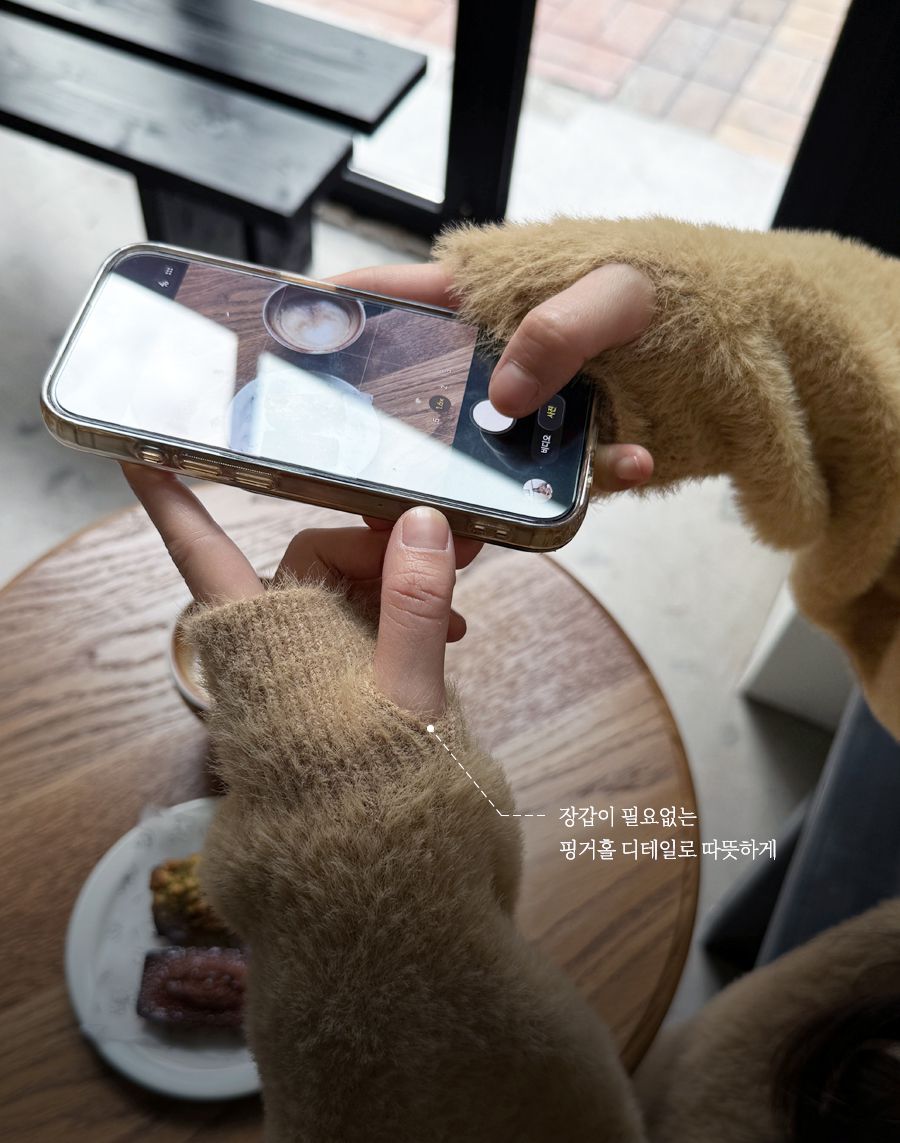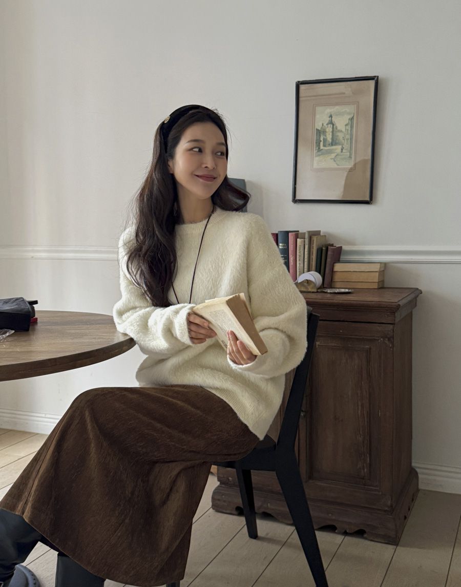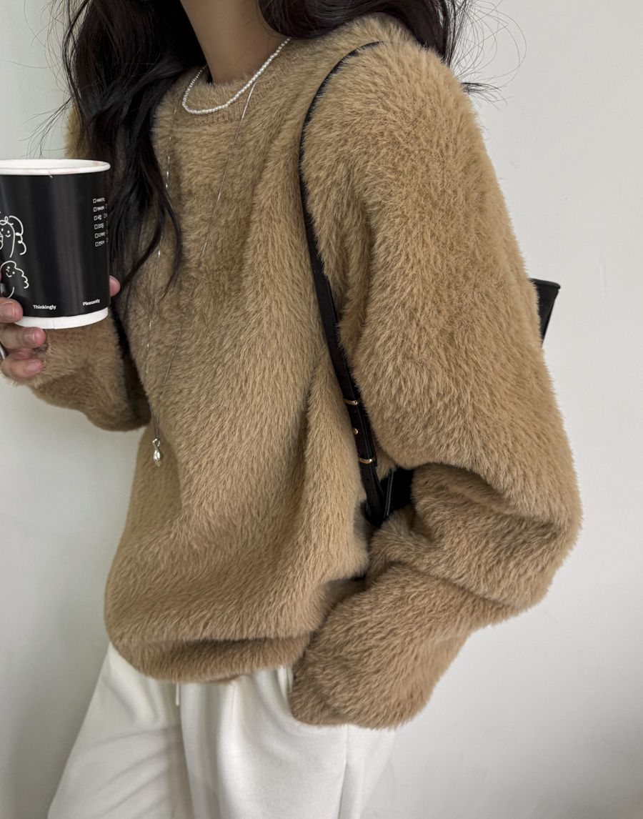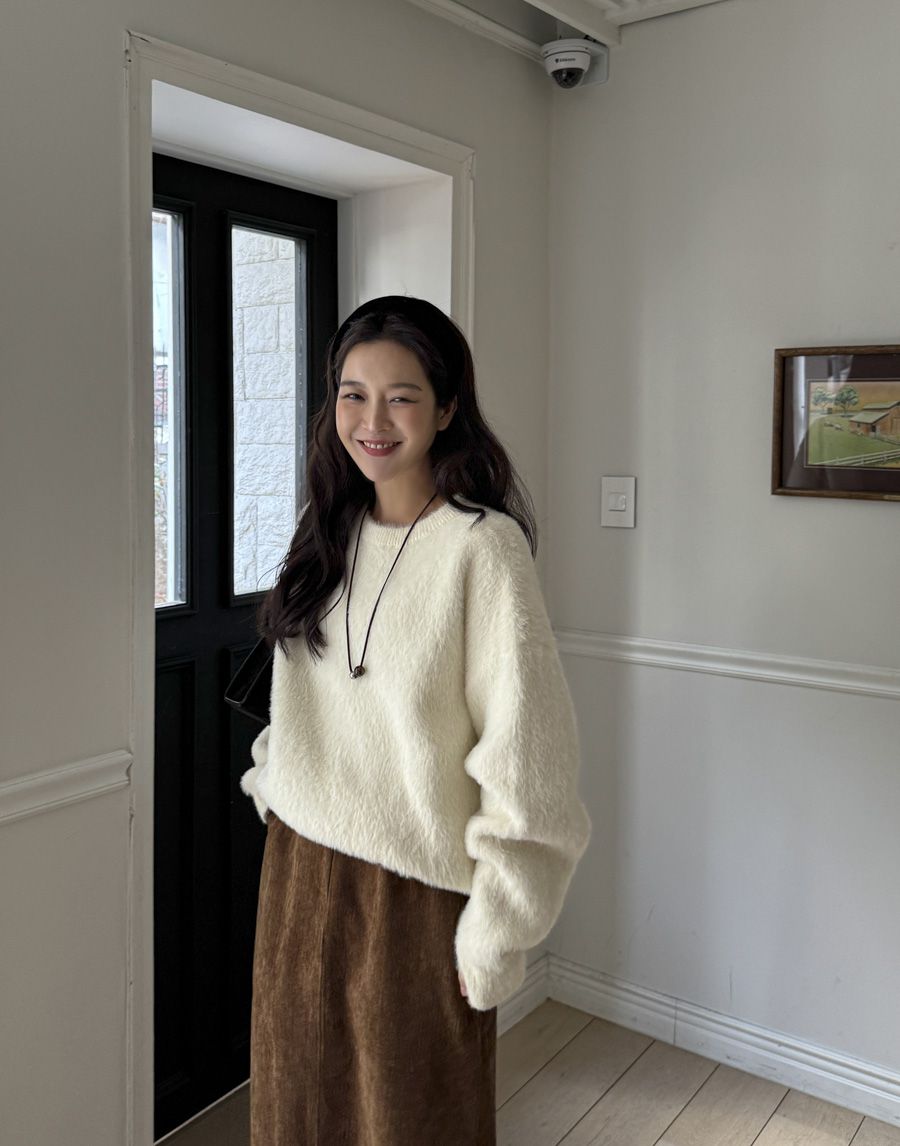 袖口挖洞抓袖設計/馬海毛針織衫/海馬毛針織衫/圓領/寬鬆版型 - 休閒居家婚禮簡約百搭素面抓袖針織衫針織上衣長袖上衣寬鬆大尺碼上衣米色象牙色酒紅色深灰色