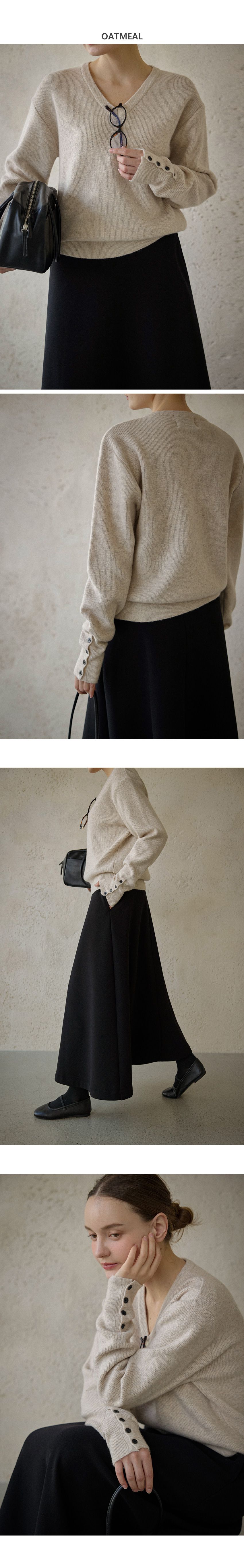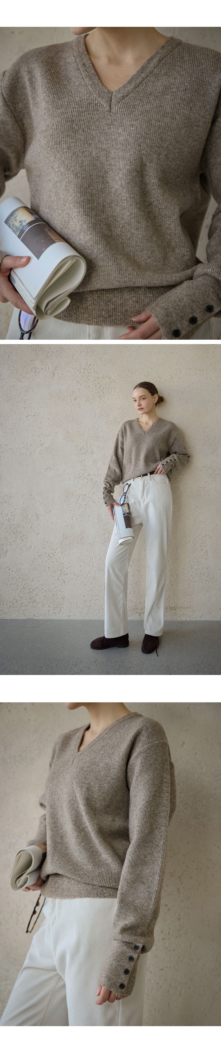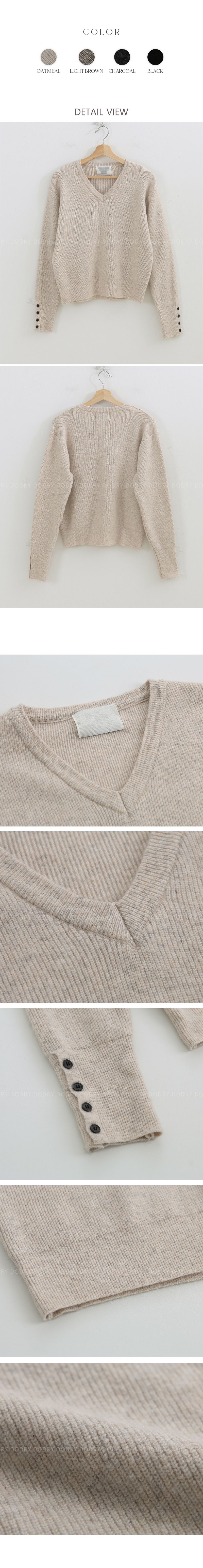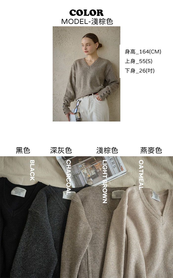 混羊毛針織衫/V領/袖口鈕釦造型(可開) - 休閒居家簡約百搭素面排釦袖針織衫針織上衣長袖上衣燕麥色淺棕色深灰色黑色
