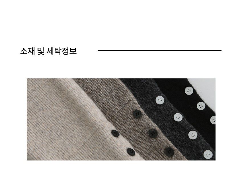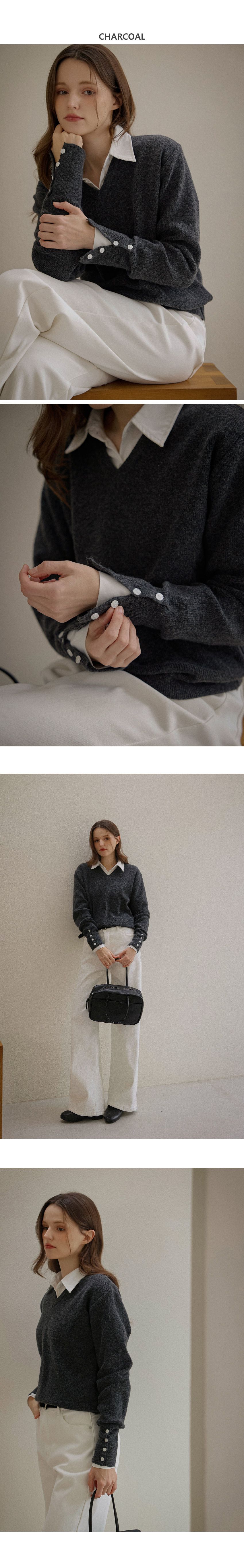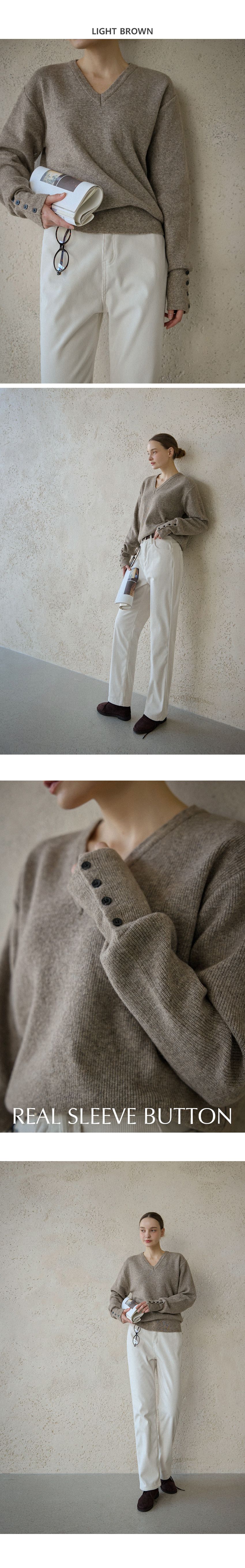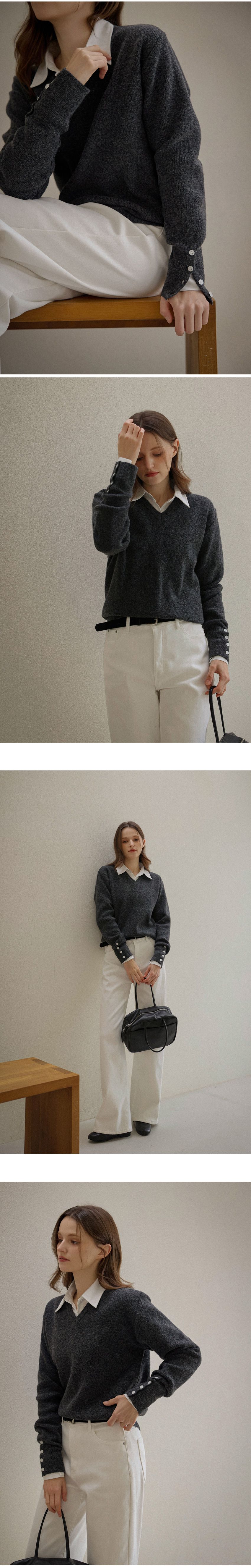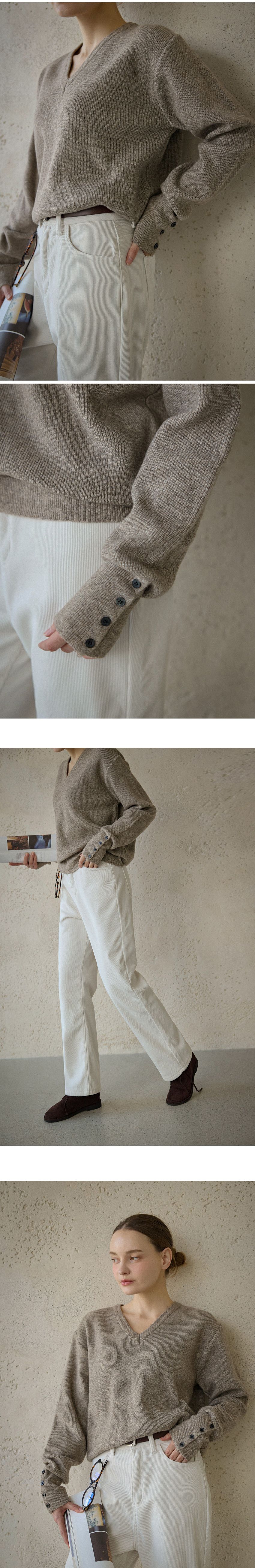 混羊毛針織衫/V領/袖口鈕釦造型(可開) - 休閒居家簡約百搭素面排釦袖針織衫針織上衣長袖上衣燕麥色淺棕色深灰色黑色