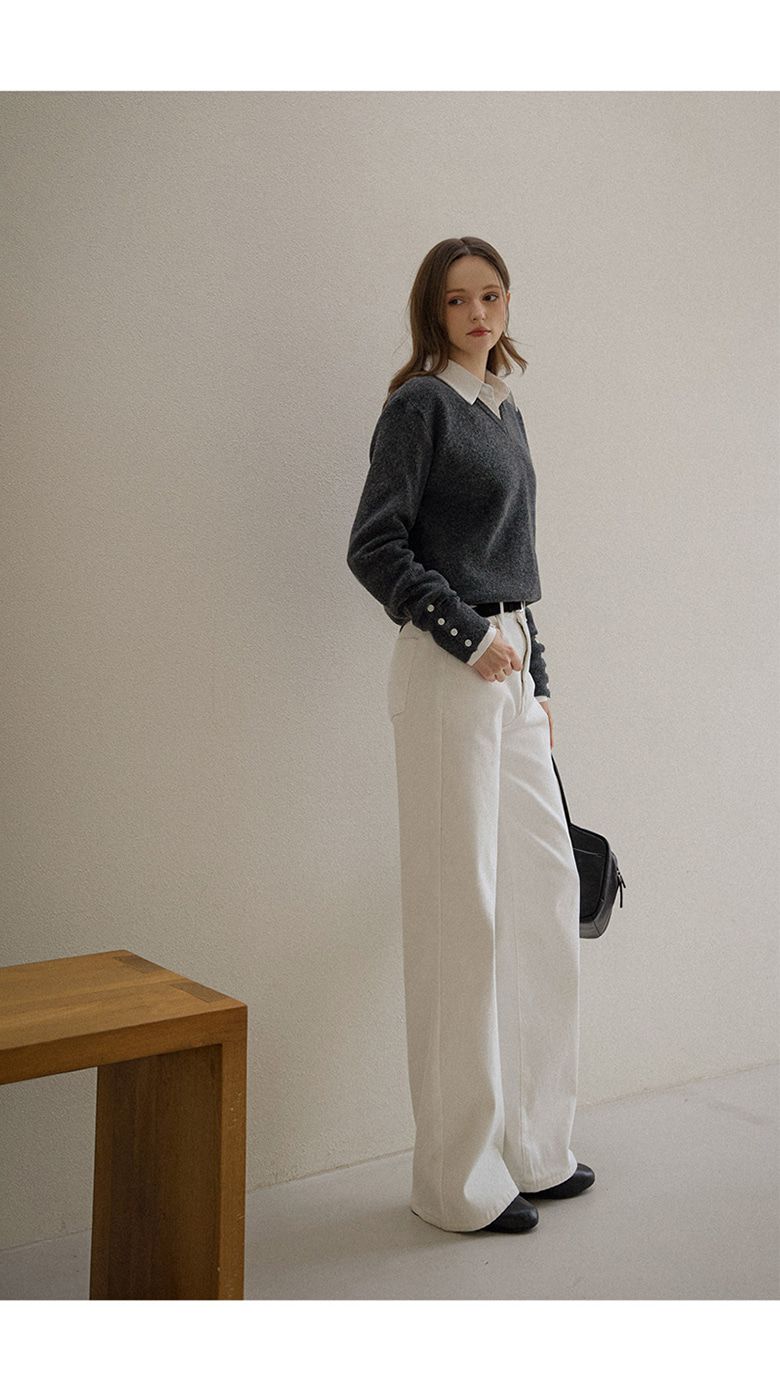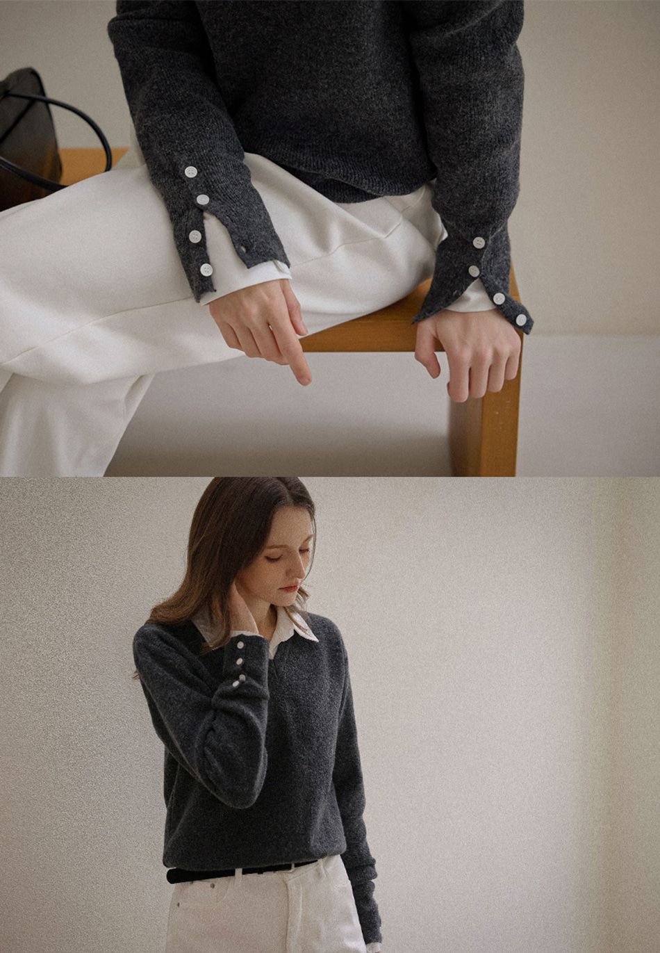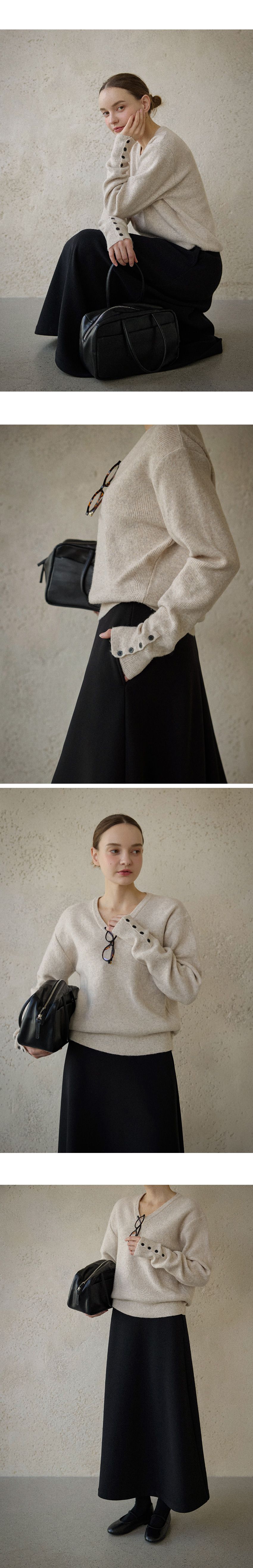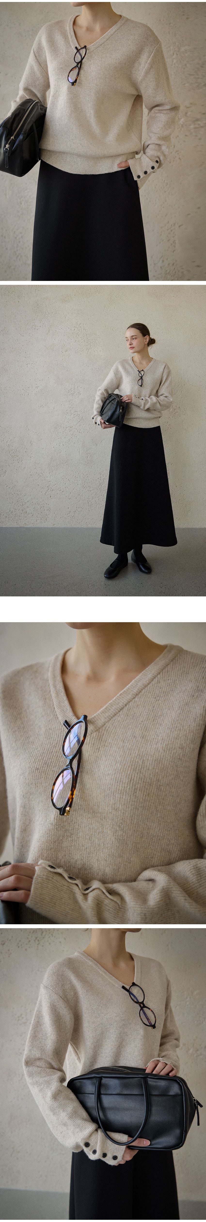 混羊毛針織衫/V領/袖口鈕釦造型(可開) - 休閒居家簡約百搭素面排釦袖針織衫針織上衣長袖上衣燕麥色淺棕色深灰色黑色