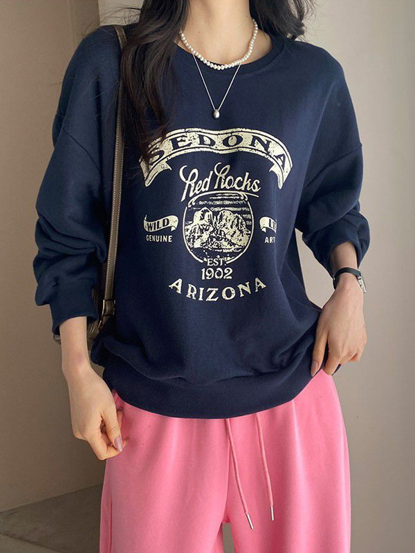 兩種尺寸/寬鬆大尺碼上衣/圓領/個性字母/斑駁感膠印英文字母/內裏毛圈棉 - 休閒居家英文字母上衣字母T恤斑駁感字母大學T長袖上衣多尺寸LXL深藍色燕麥色