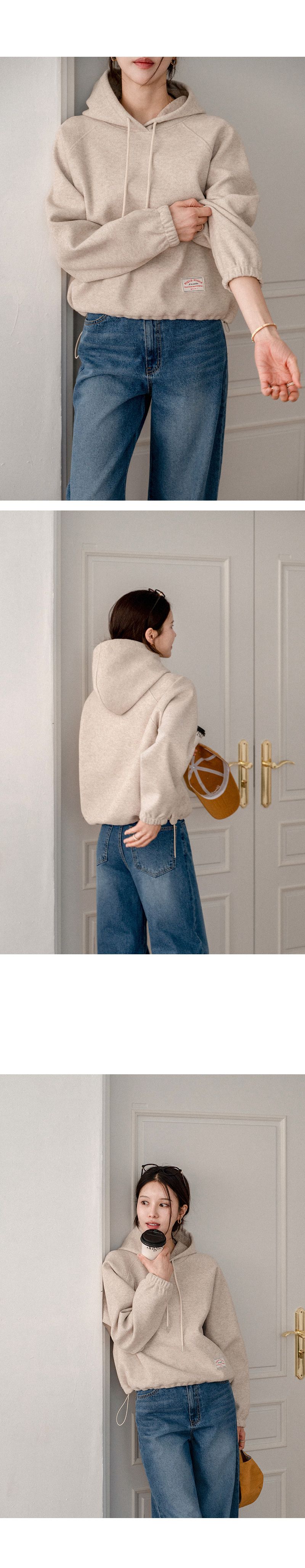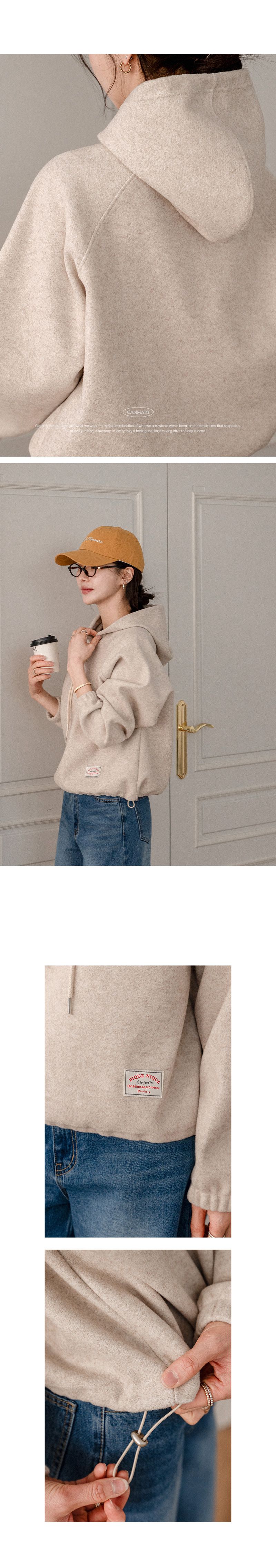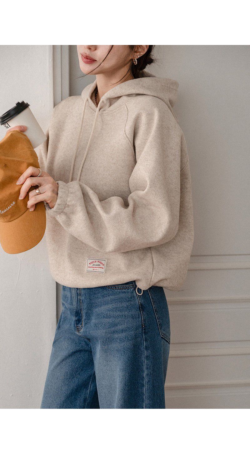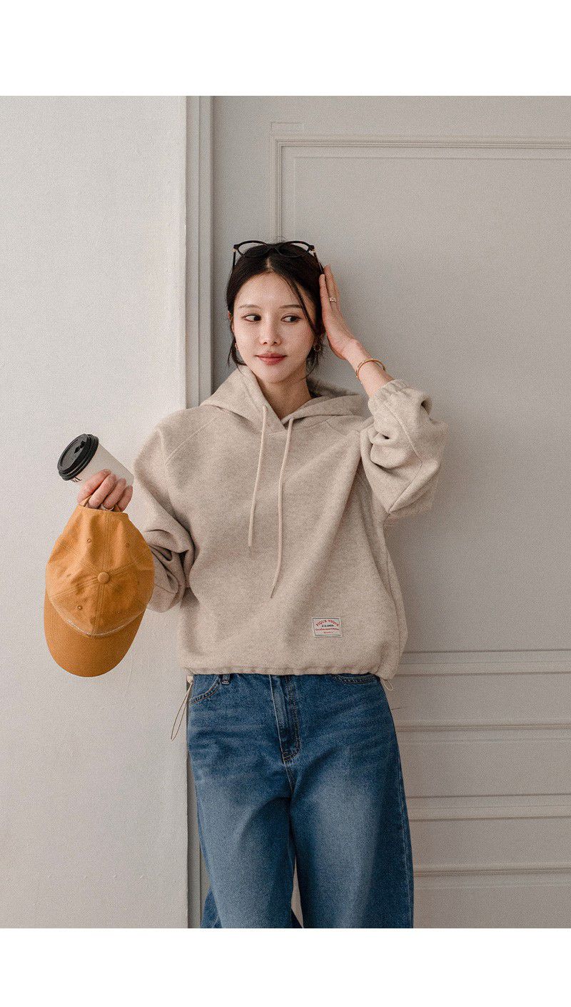 厚實毛呢面料/抽繩連帽/下襬抽繩收腰/個性布標/連肩袖/束口袖 - 素面休閒居家簡約百搭素面毛呢連帽上衣長袖上衣帽T米色黑色