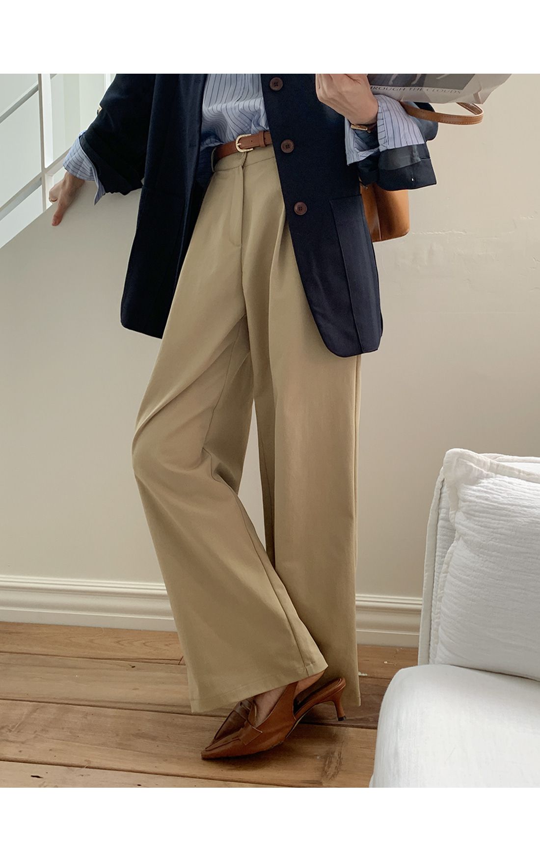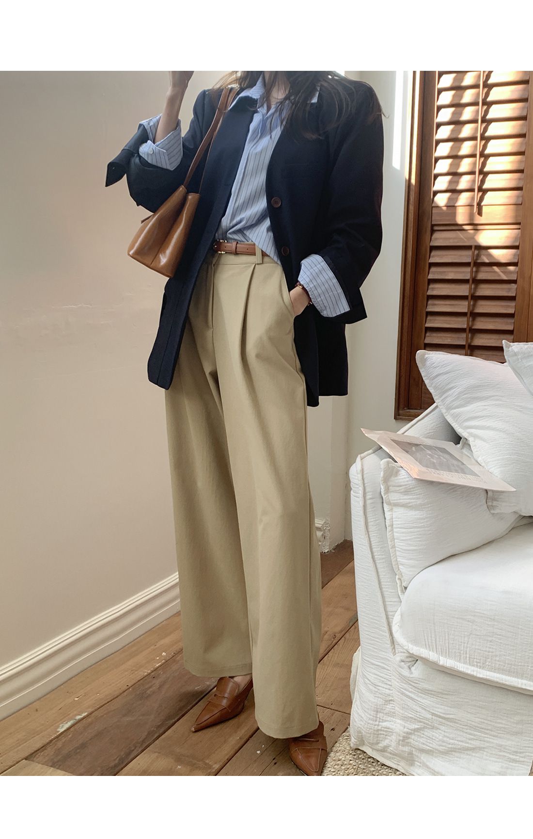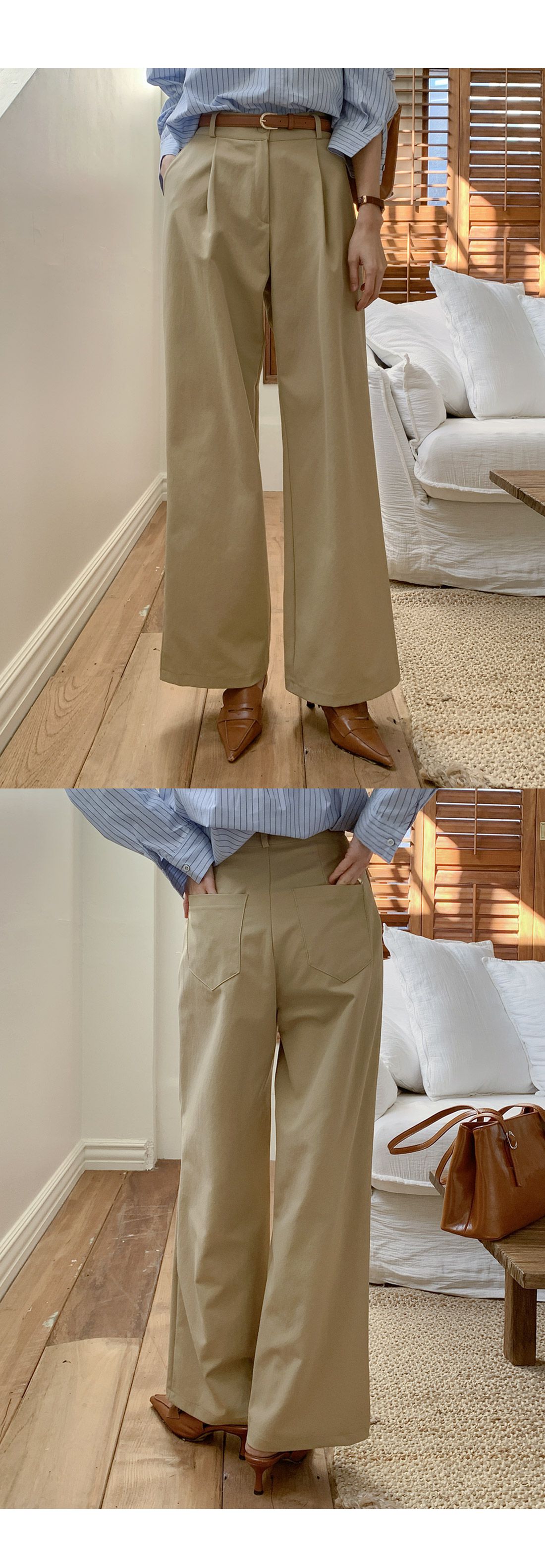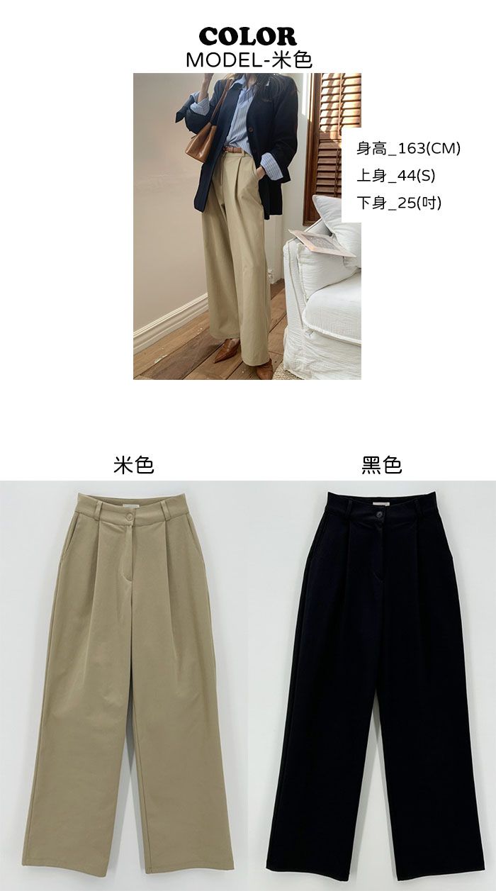 【C55992】韓國TMO 抓褶腰西裝褲-OL寬褲素面挺版高腰直筒褲長褲★★
