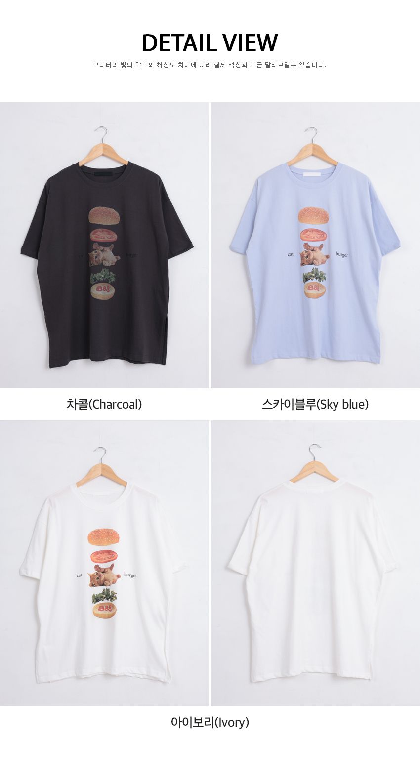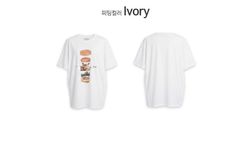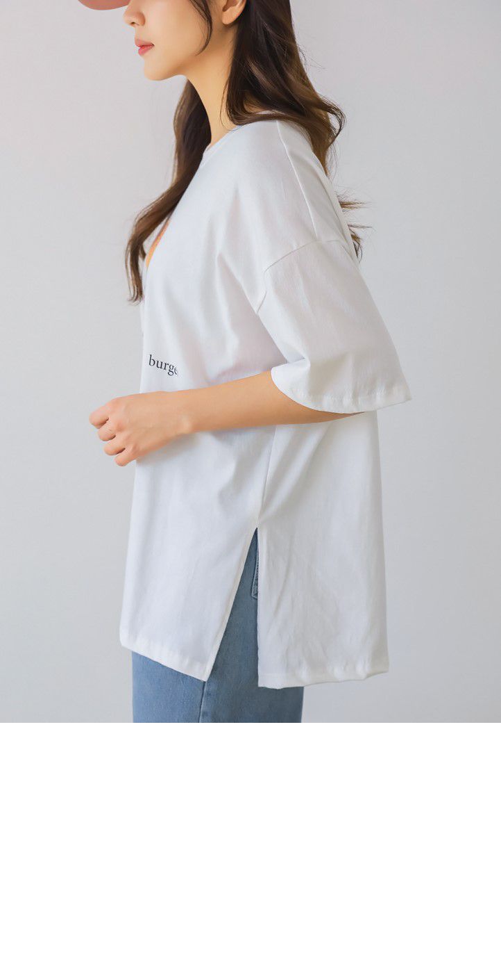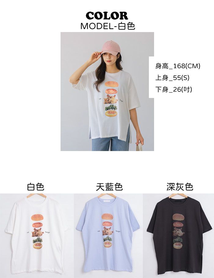 純棉/膠印漢堡印花/貓咪印花/寬鬆長版/側開衩/圓領 - 休閒居家貓貓漢堡T恤七分袖上衣寬鬆大尺碼上衣長版上衣白色天藍色深灰色