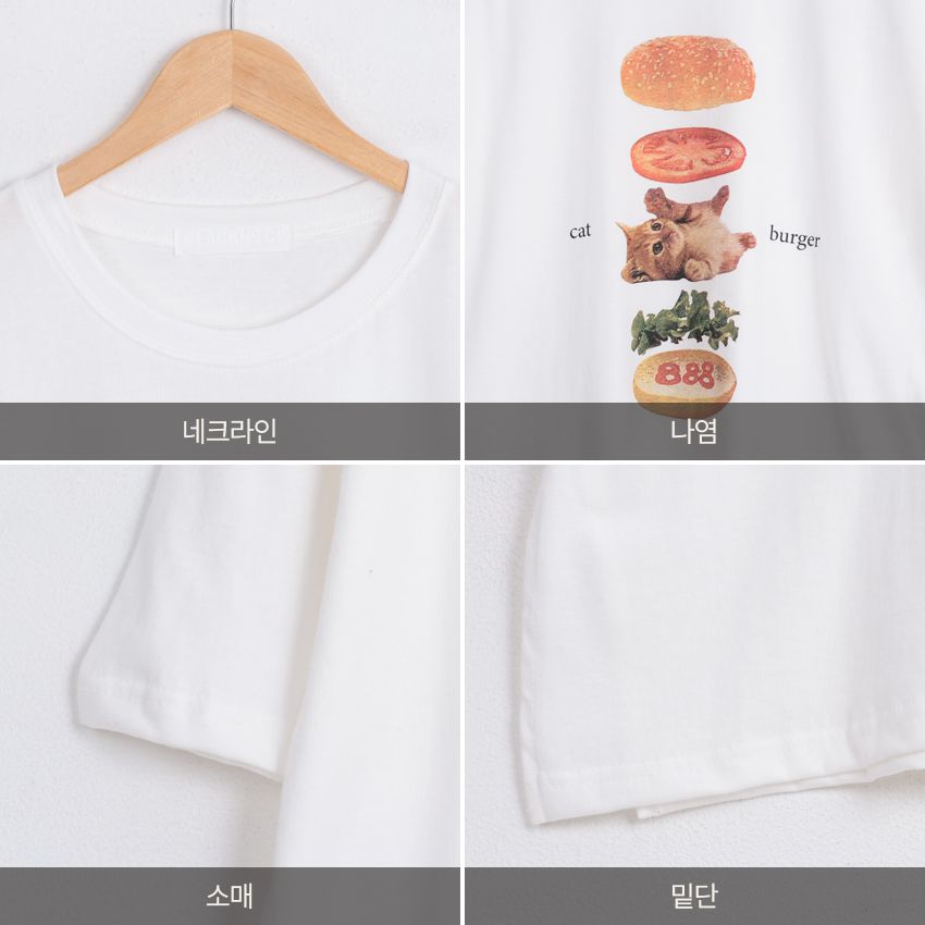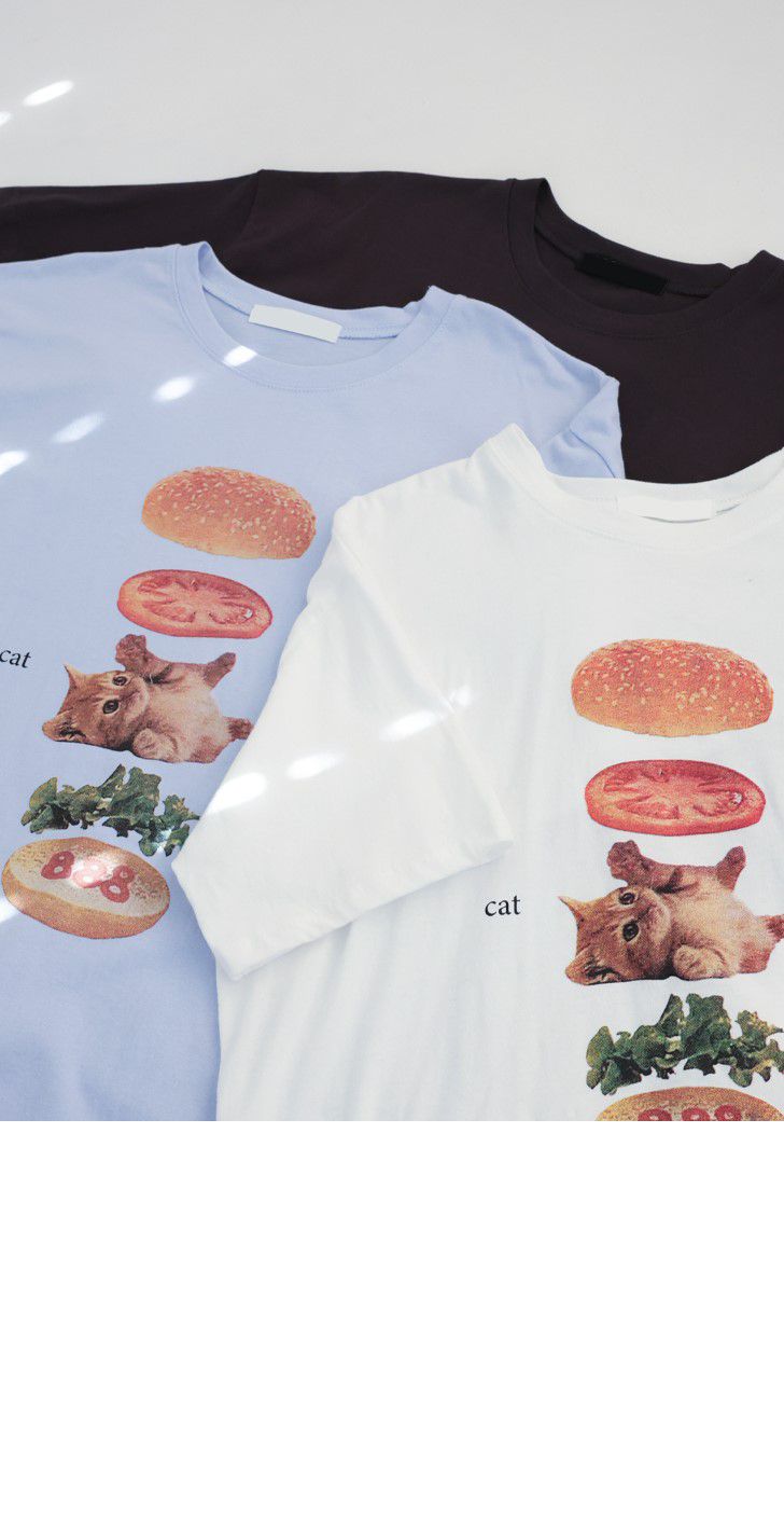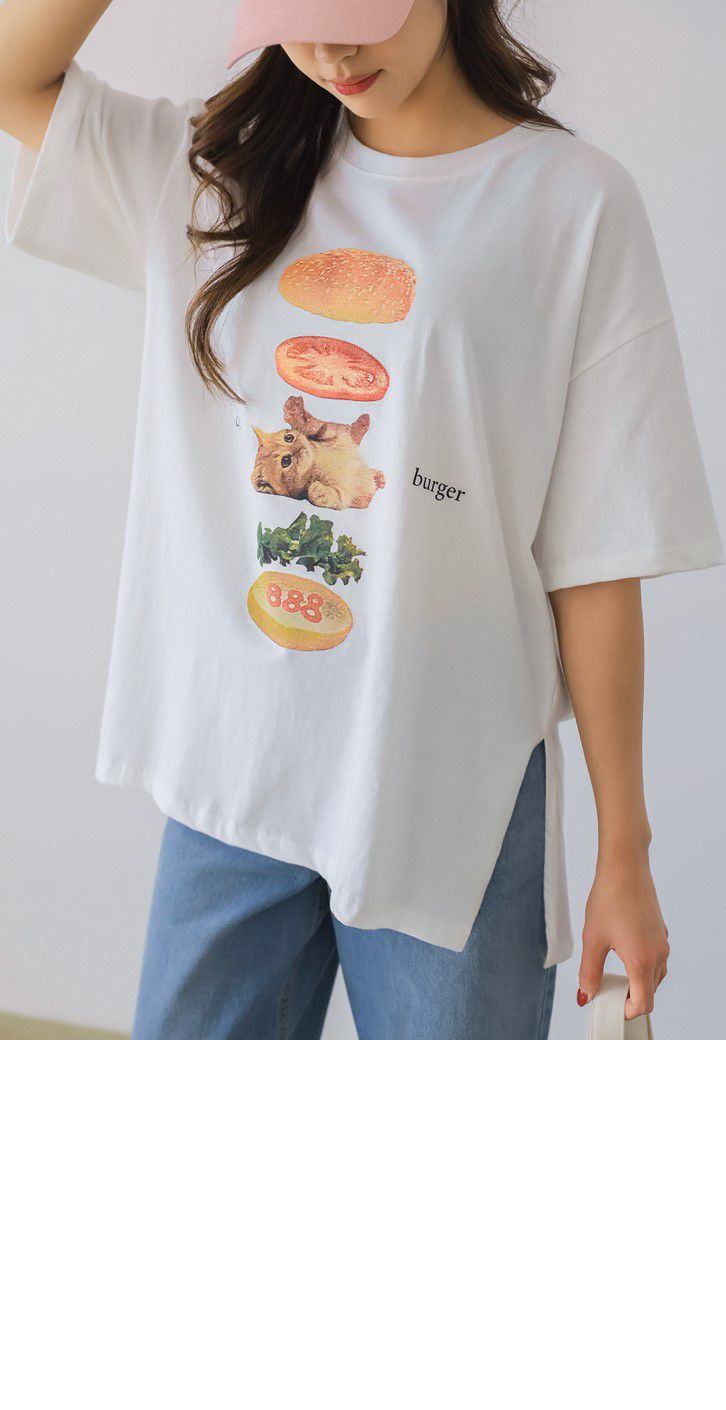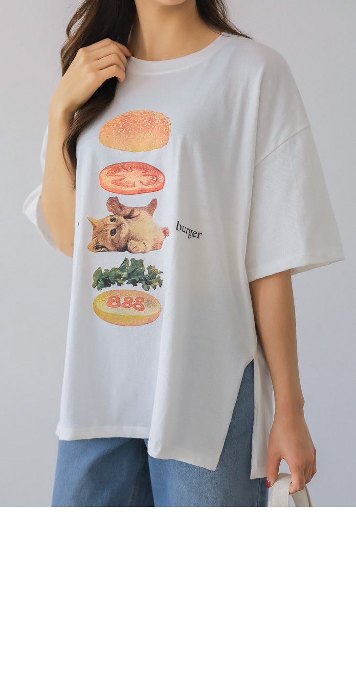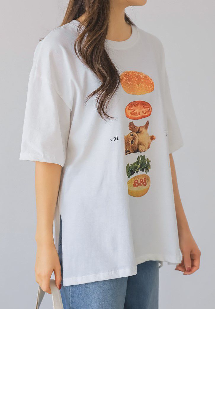 【C56007】韓國PSS 貓貓漢堡T恤-貓咪印花寬鬆長版側開衩七分袖上衣★★