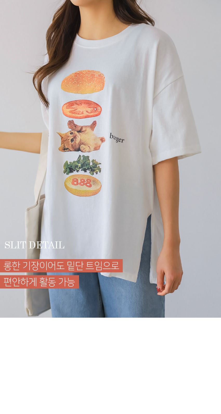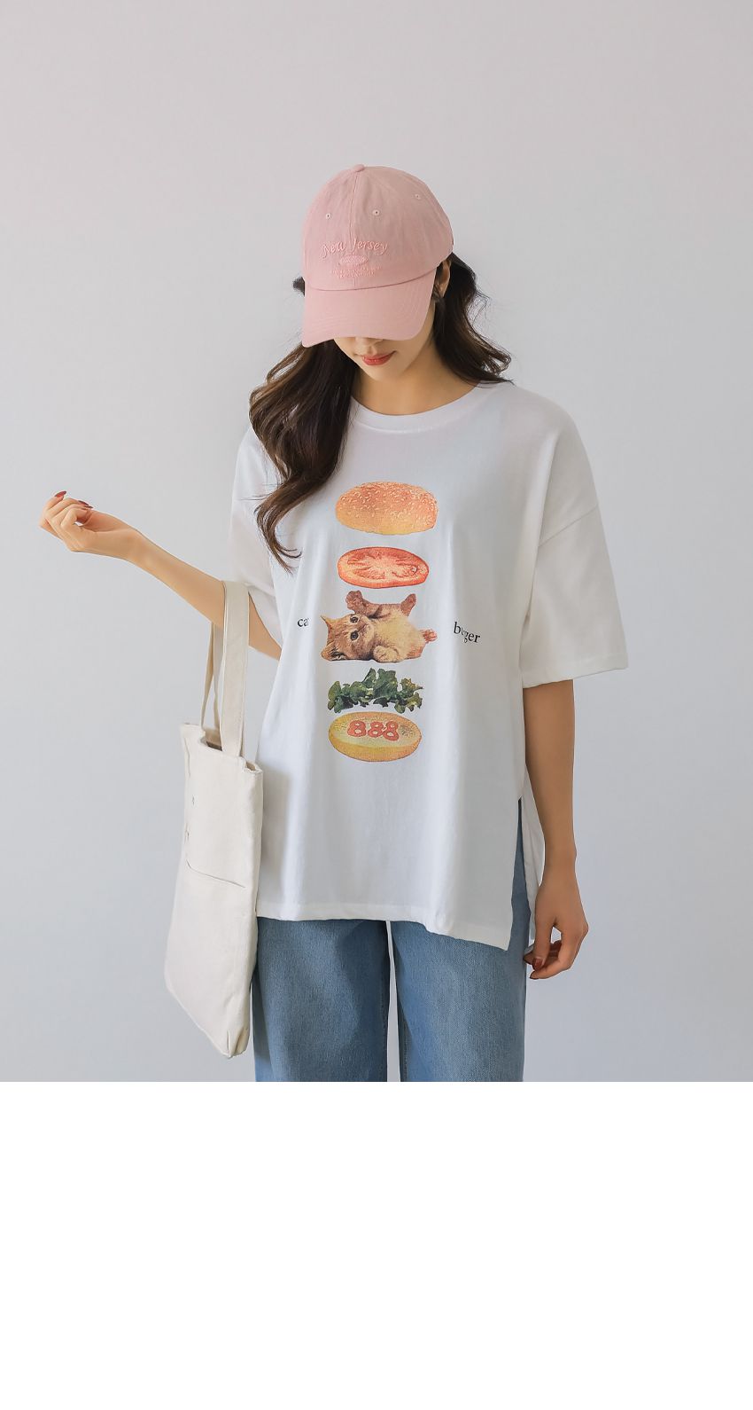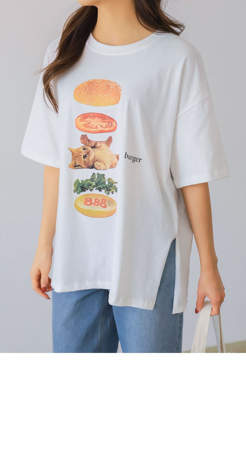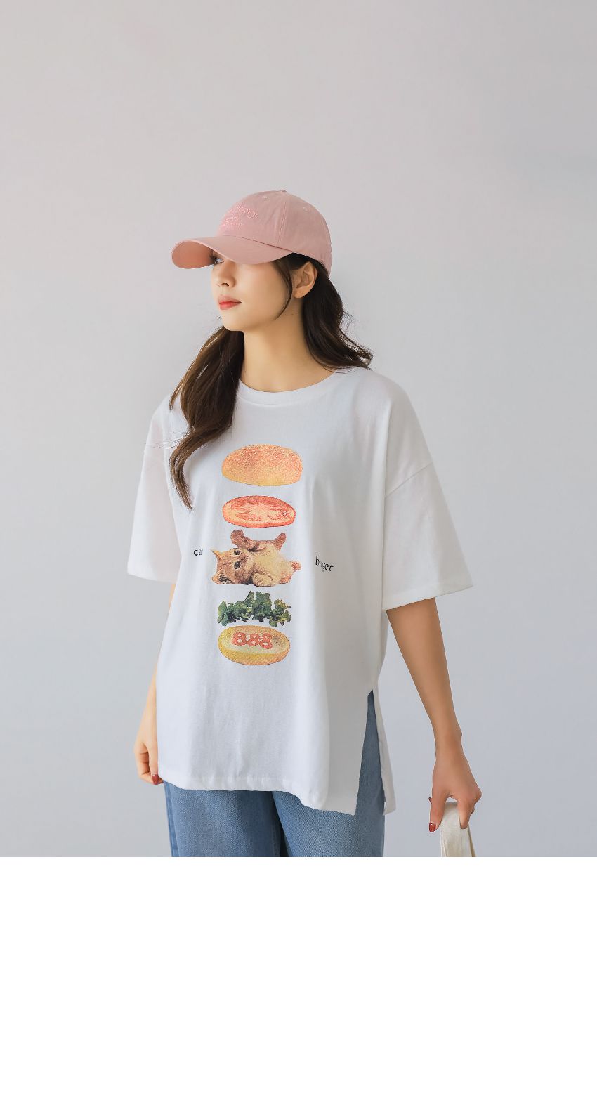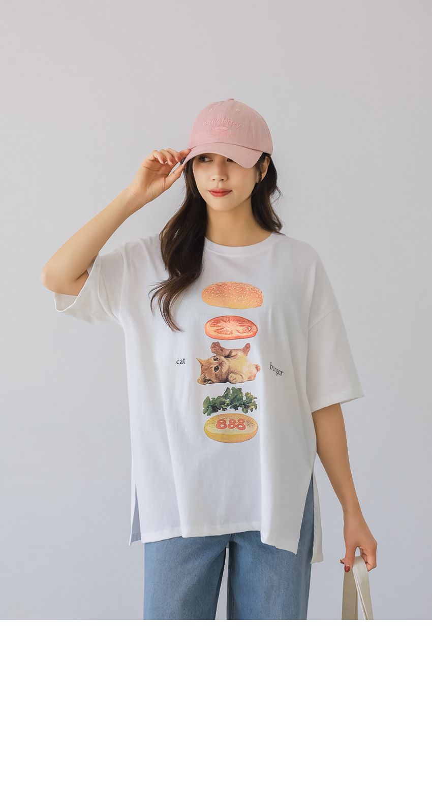 【C56007】韓國PSS 貓貓漢堡T恤-貓咪印花寬鬆長版側開衩七分袖上衣★★