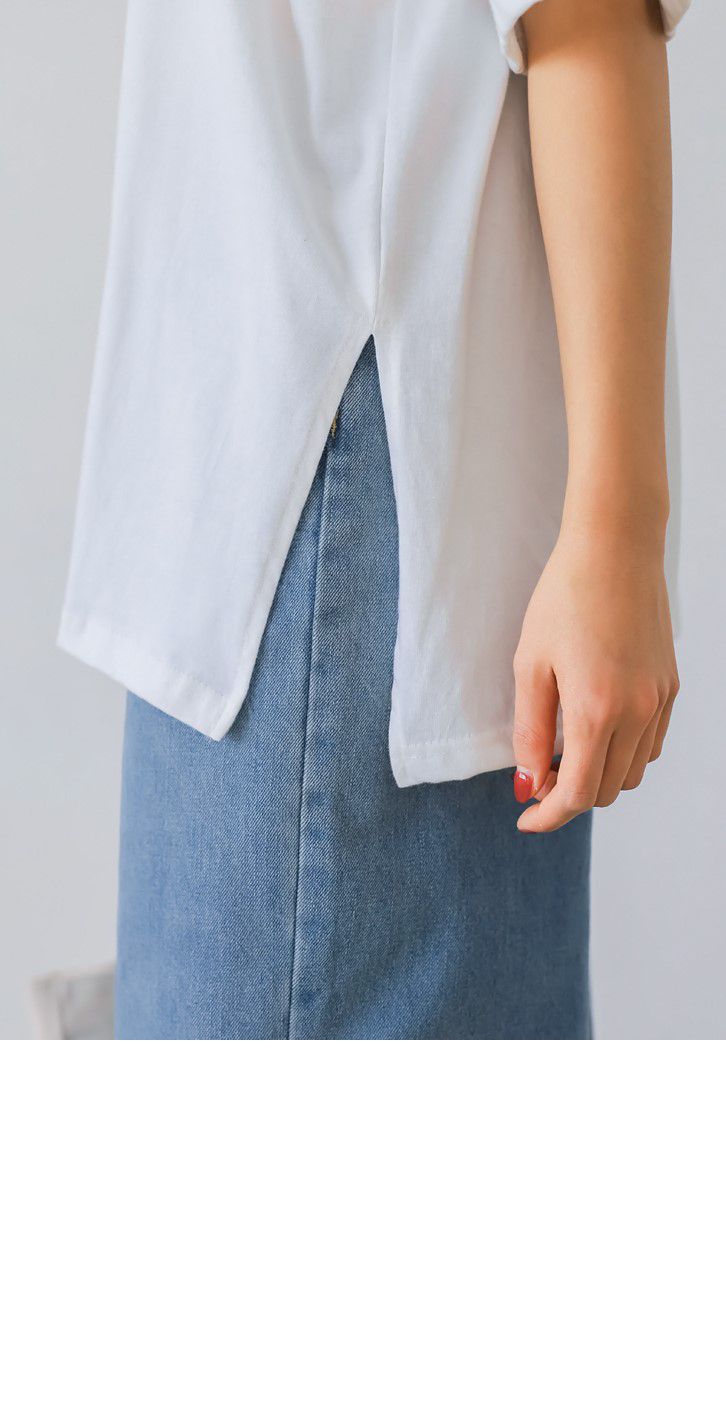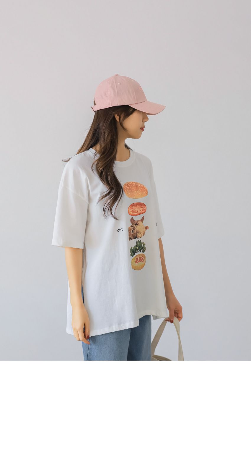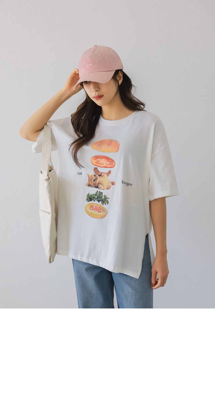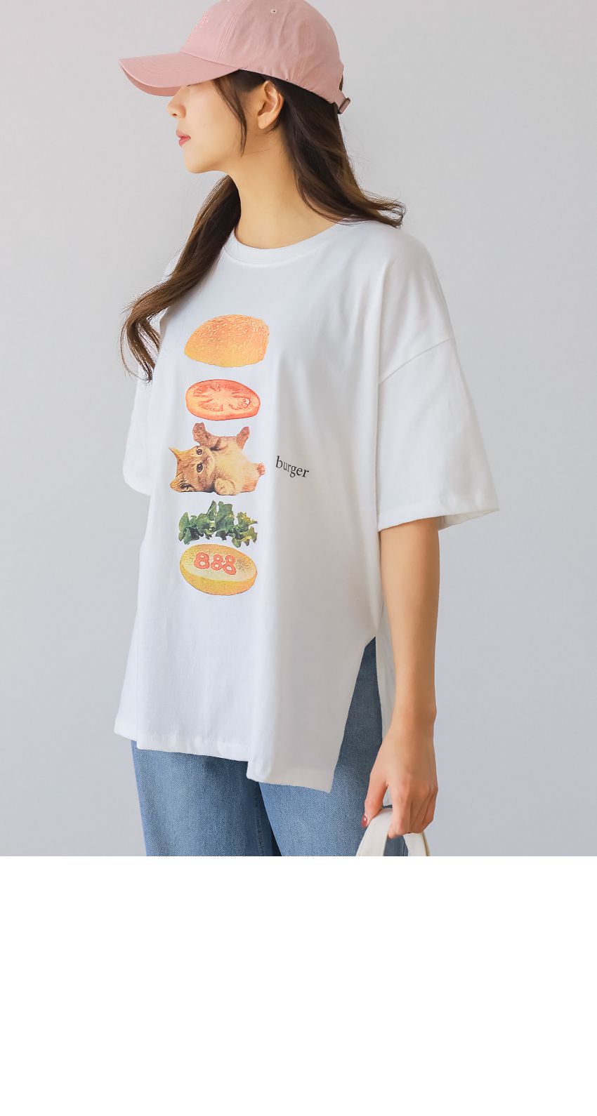 【C56007】韓國PSS 貓貓漢堡T恤-貓咪印花寬鬆長版側開衩七分袖上衣★★