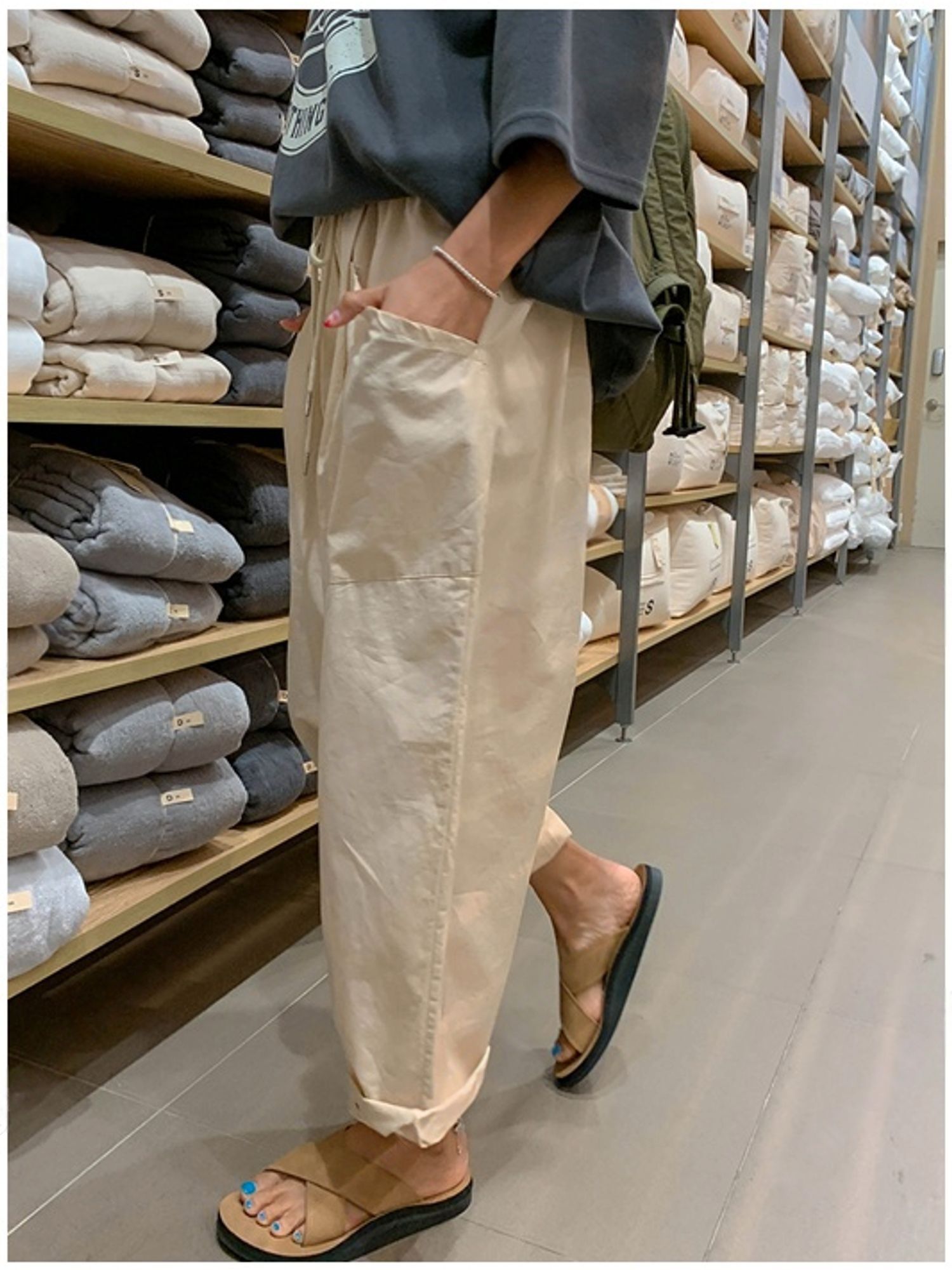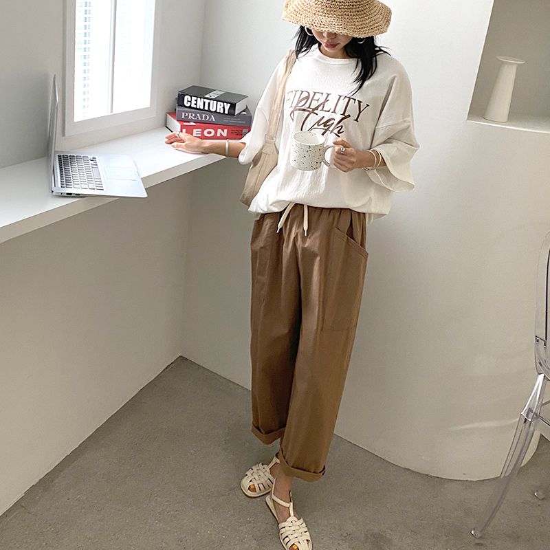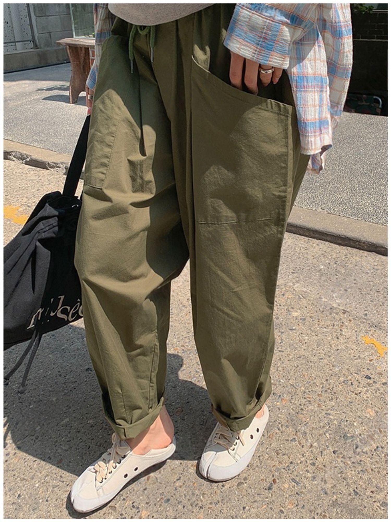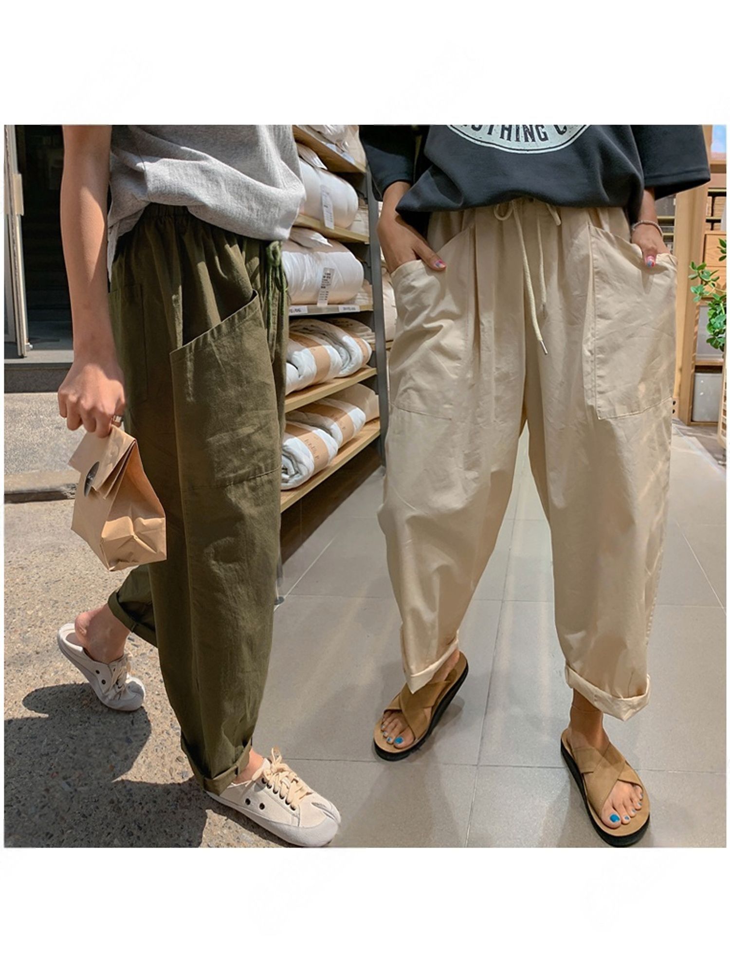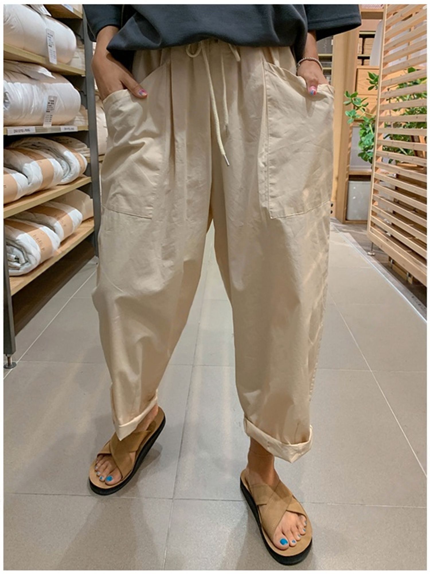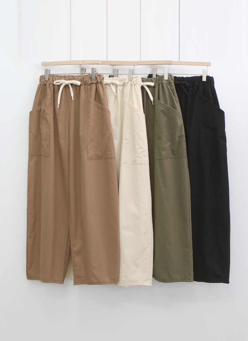 【C56064】韓國BHN 切線大口袋寬褲-素面抽繩鬆緊腰透氣休閒長褲