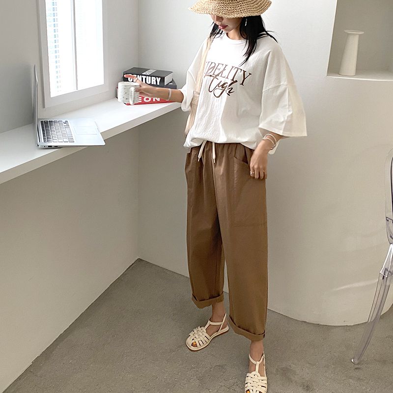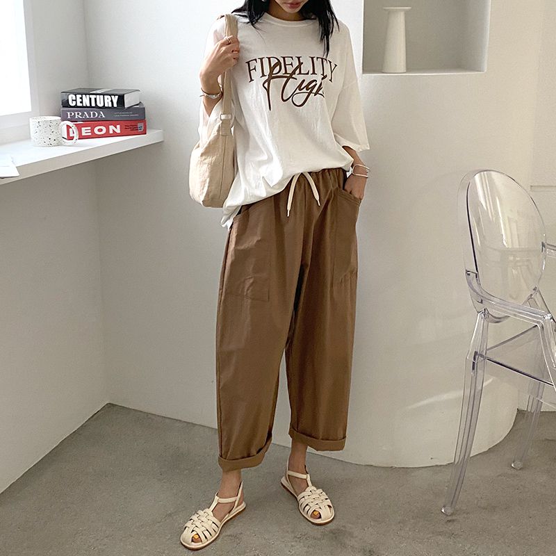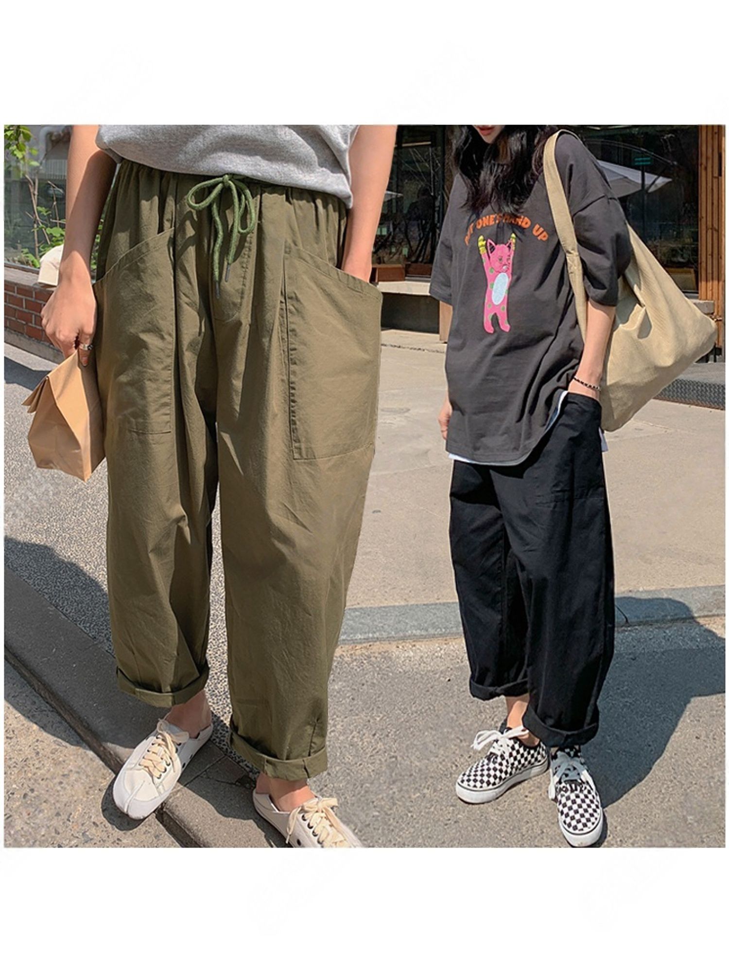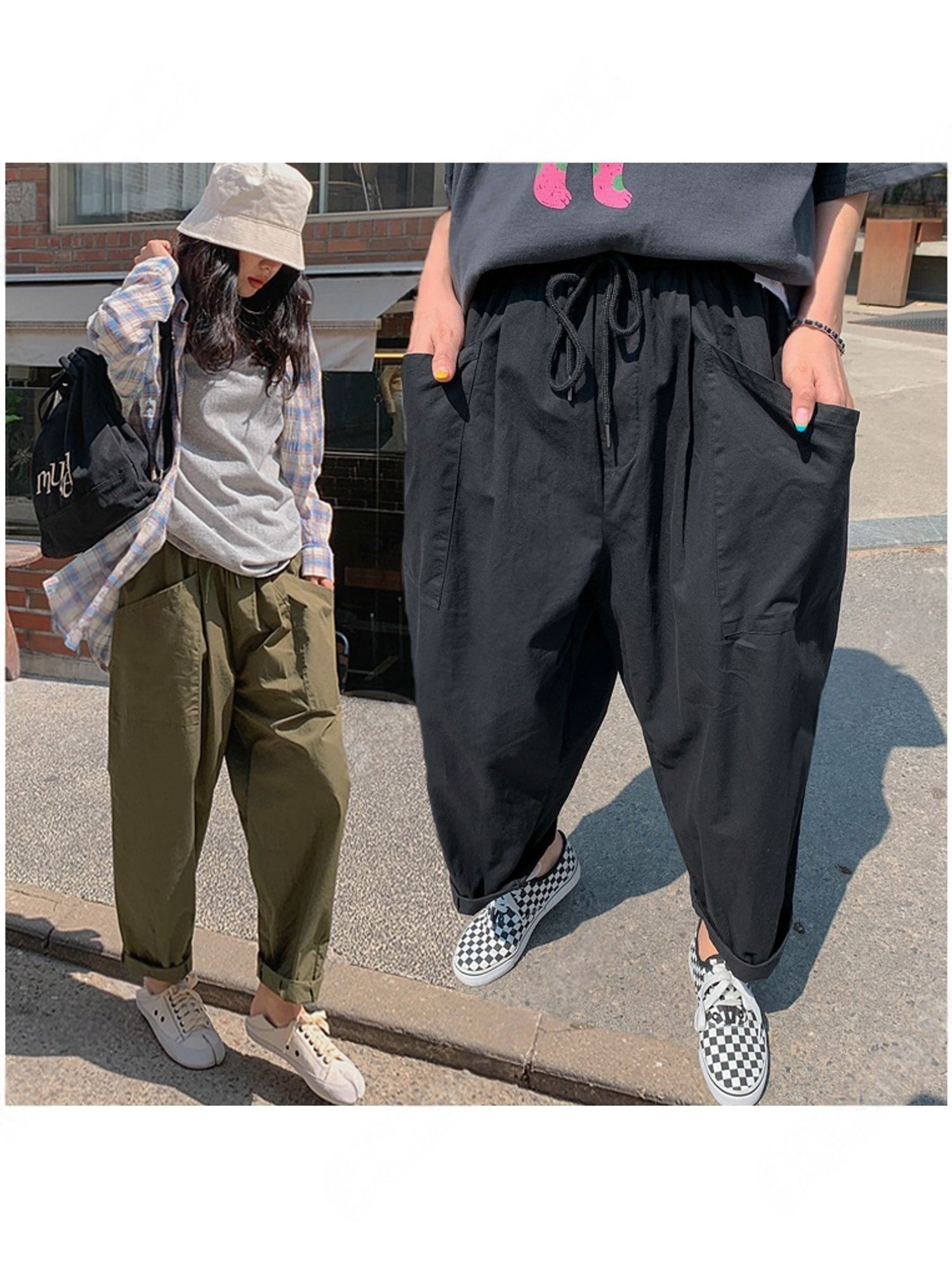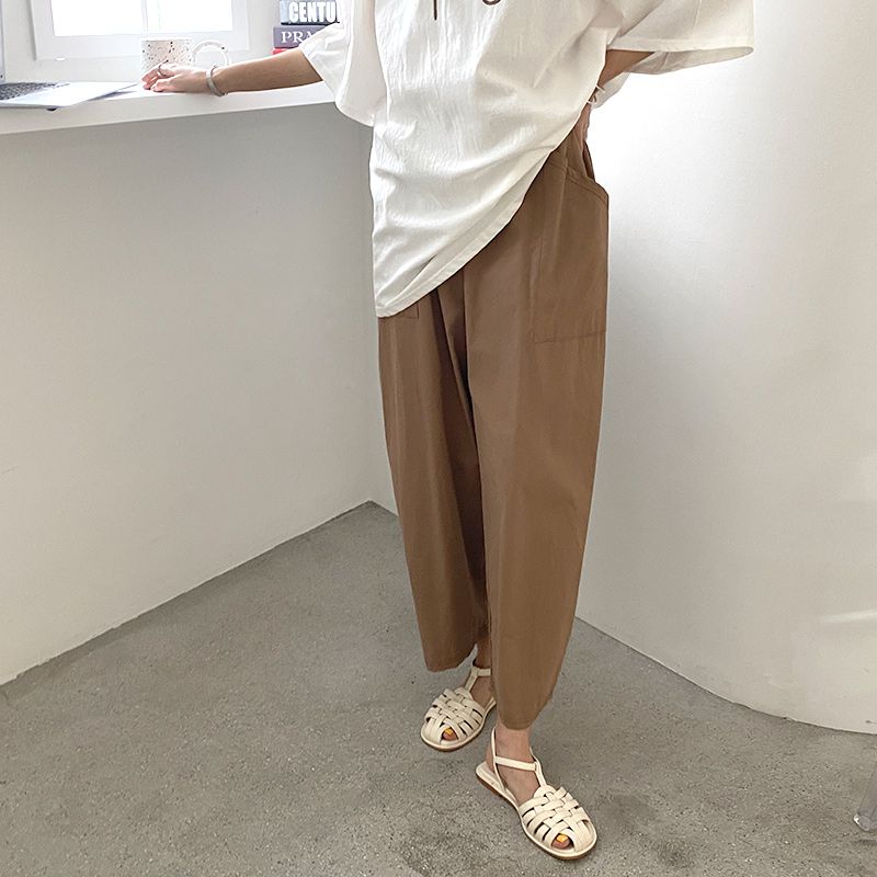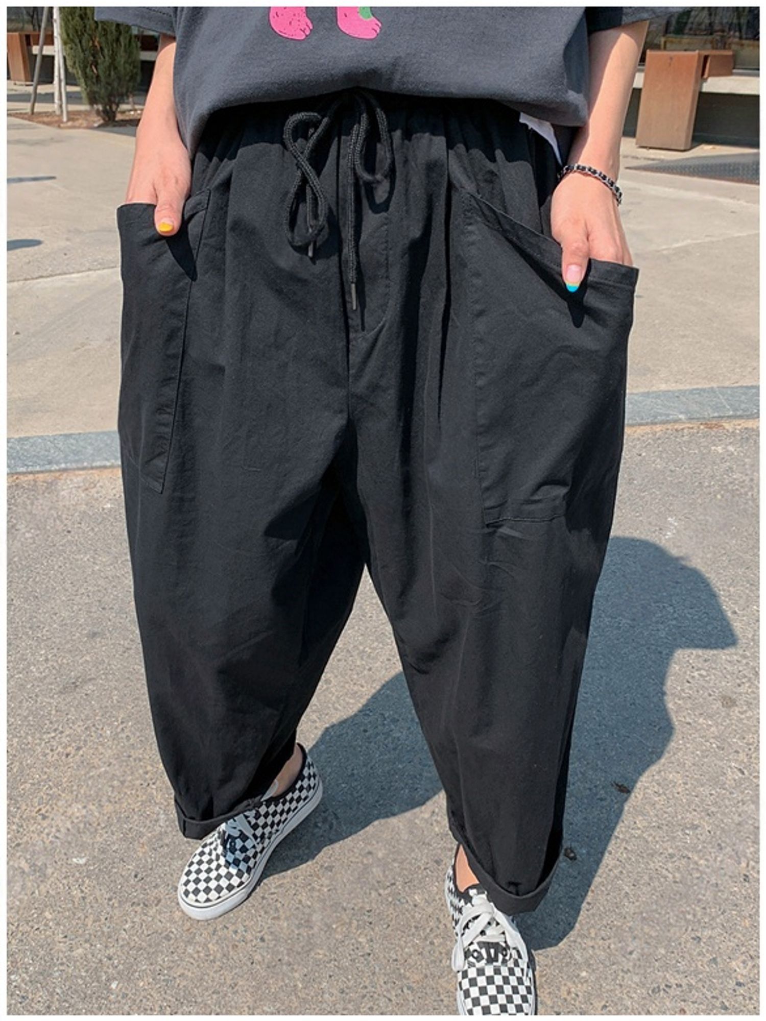 【C56064】韓國BHN 切線大口袋寬褲-素面抽繩鬆緊腰透氣休閒長褲