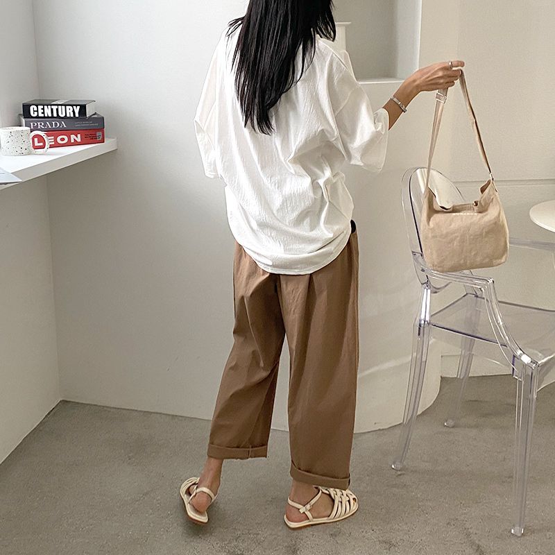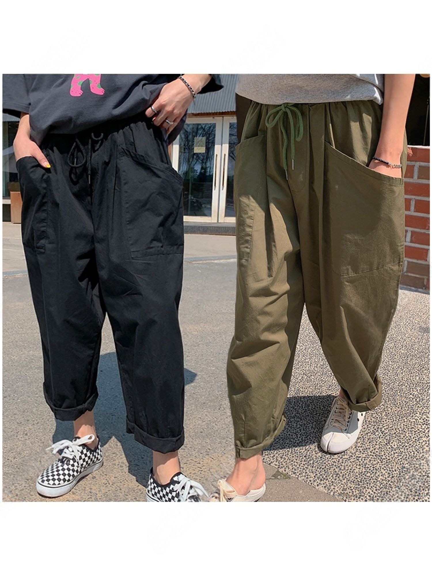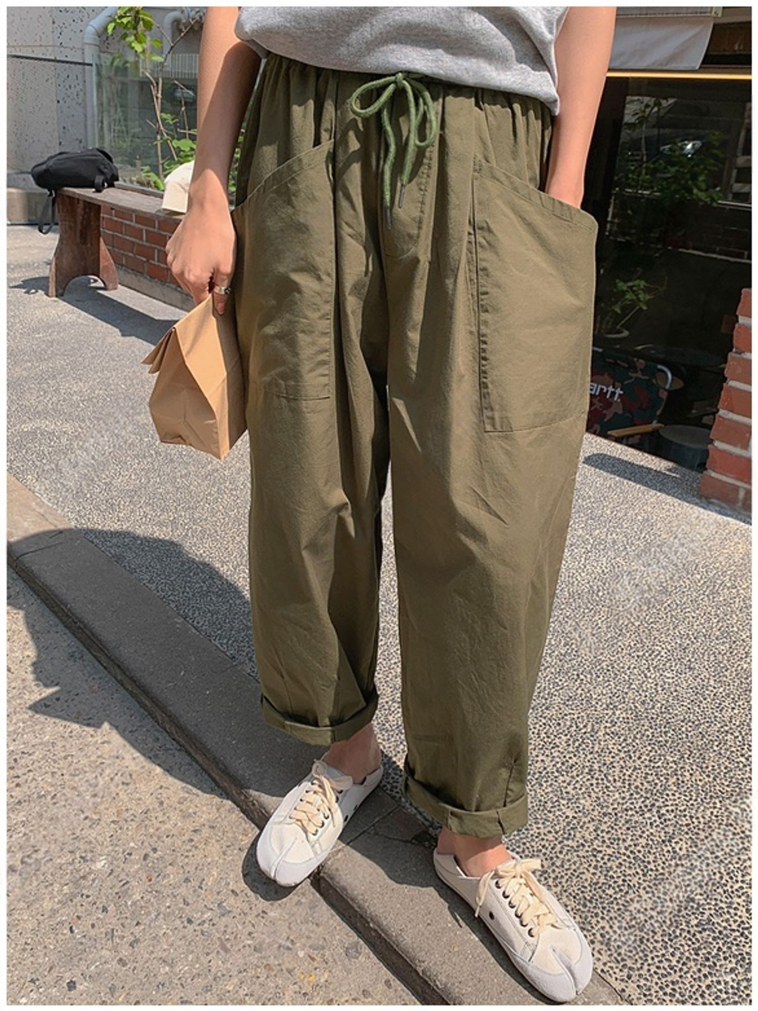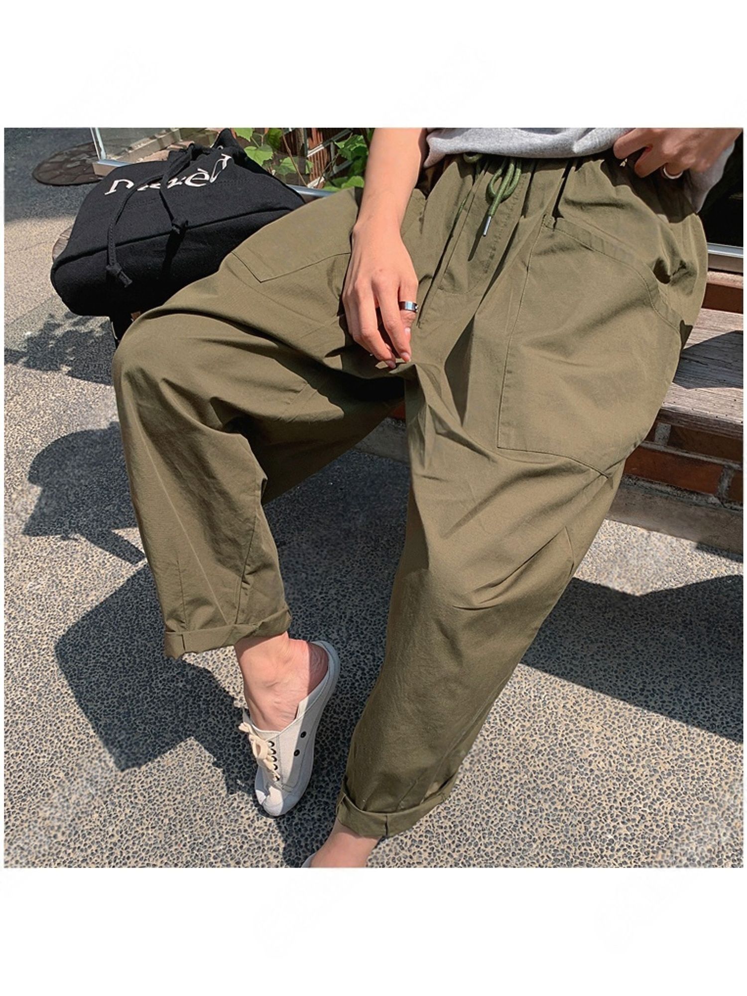 寬大褲管/氣球褲/寬褲/抽繩鬆緊腰/切線大口袋/雙口袋/ - 休閒居家渡假簡約百搭素面切線大口袋寬褲休閒長褲卡其綠色米色黑色棕色