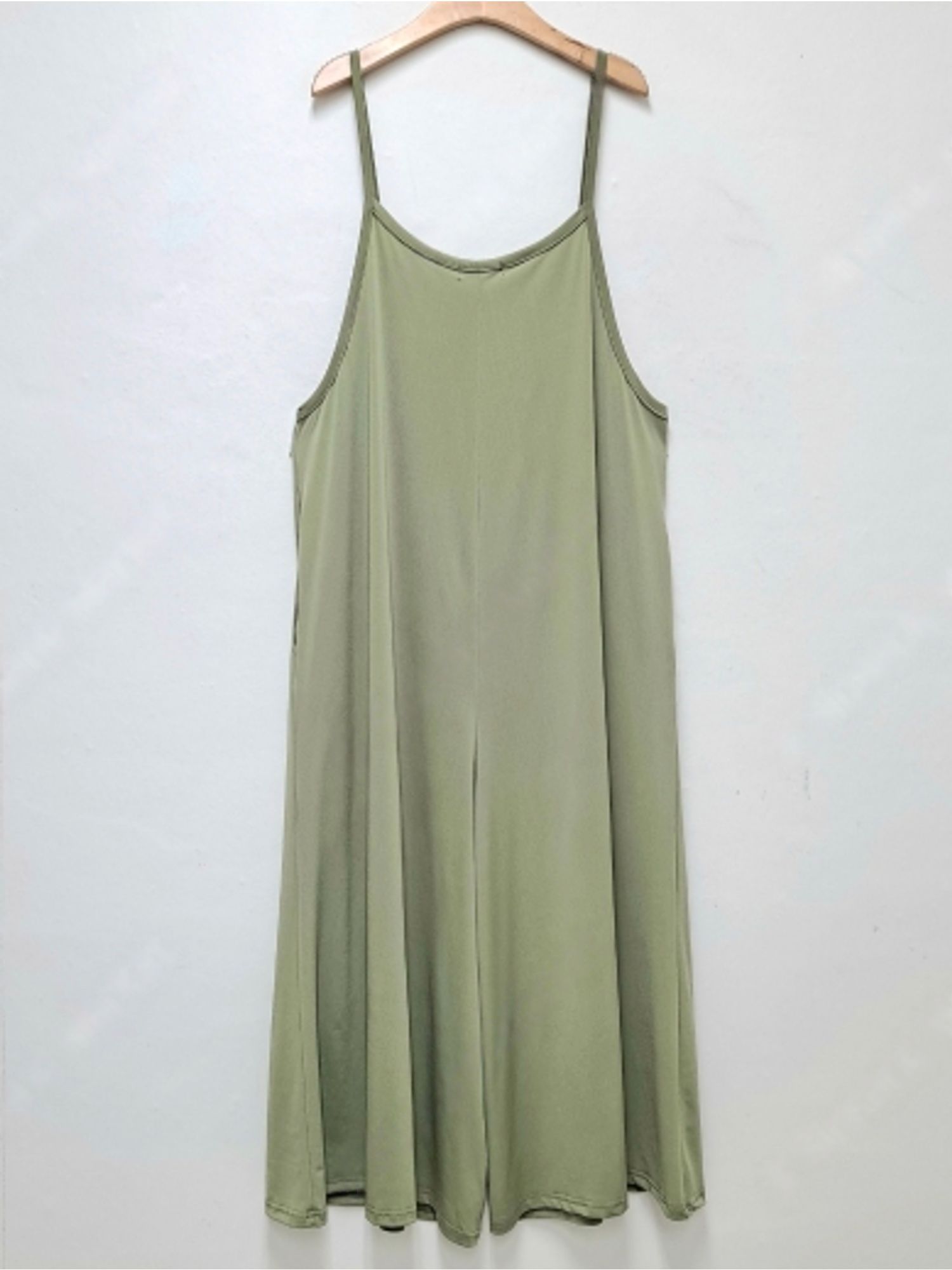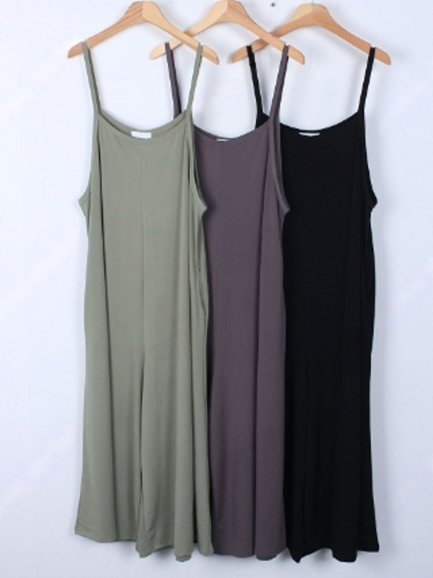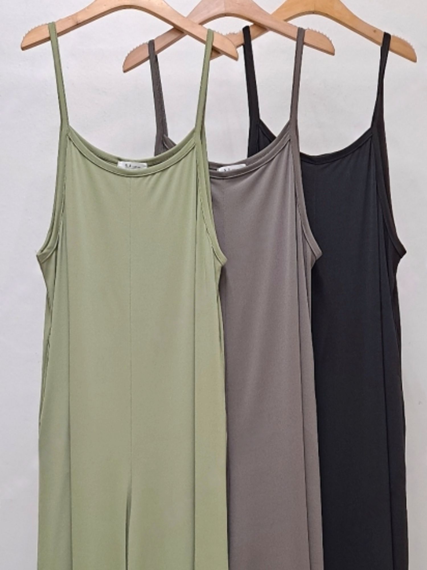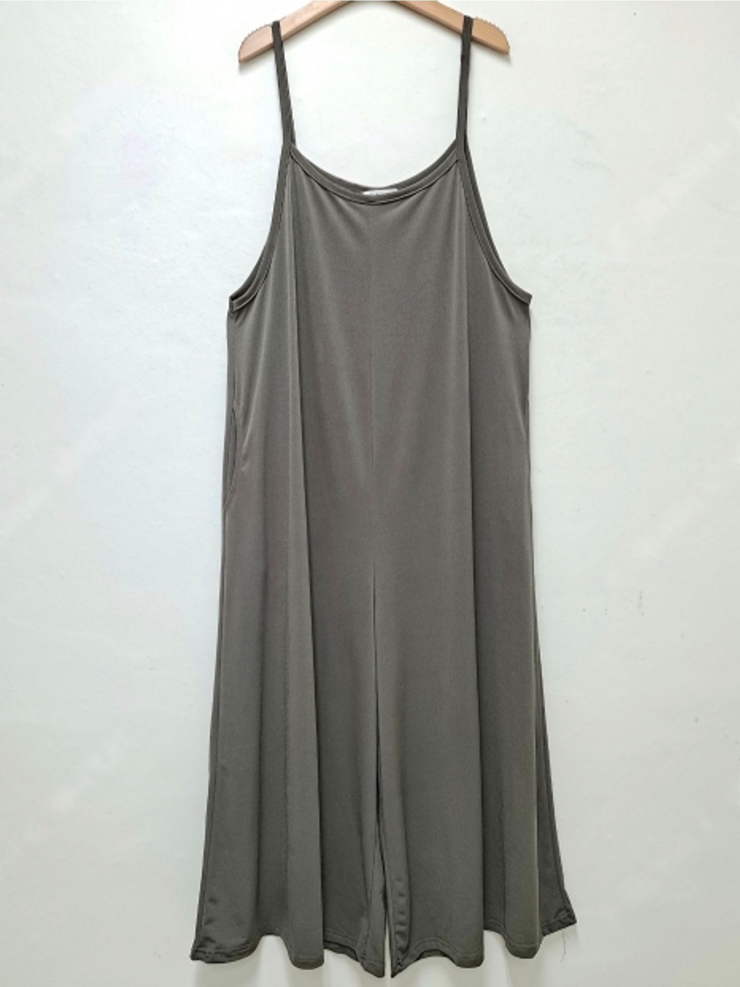 輕薄彈性/涼感吊帶褲/平口/細肩帶(不可調)/背心無袖/雙口袋 - 休閒居家渡假簡約百搭素面彈性吊帶褲七分連身褲深灰色卡其綠色黑色