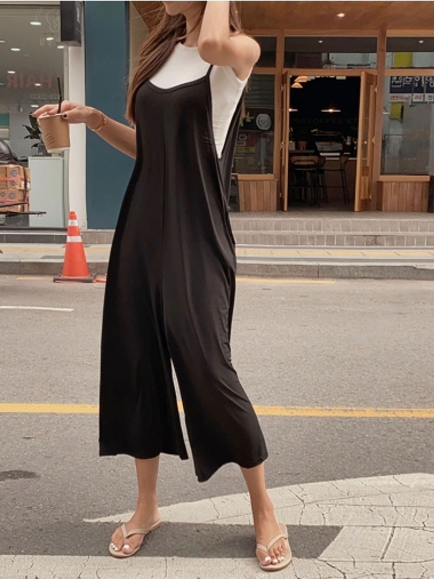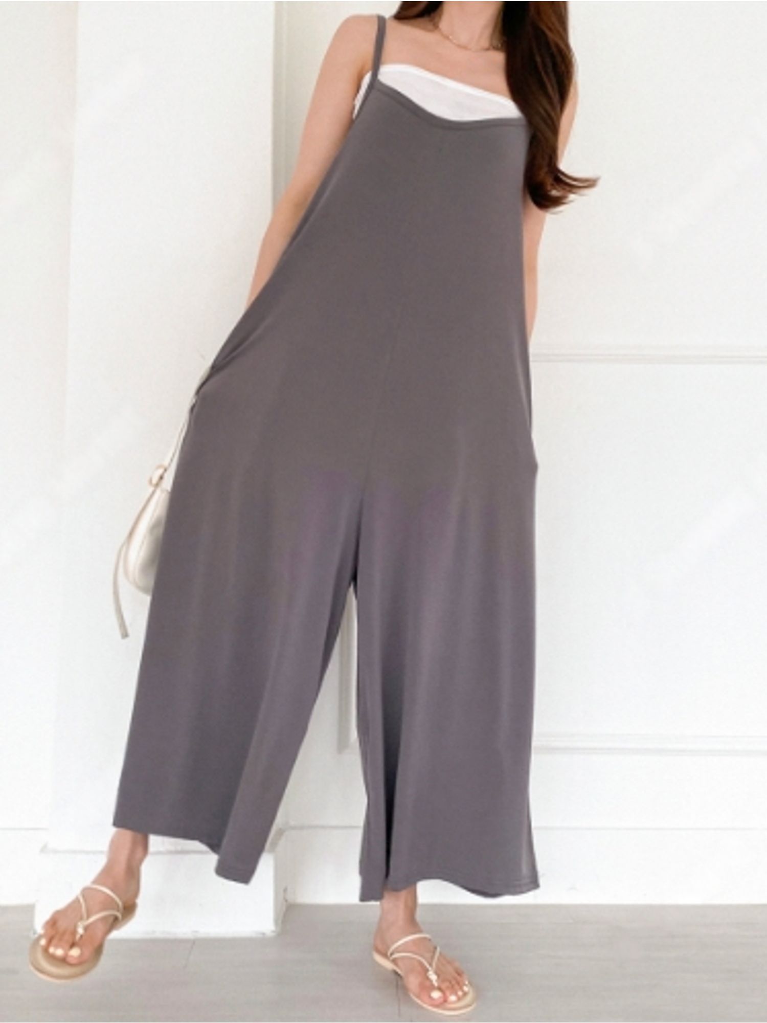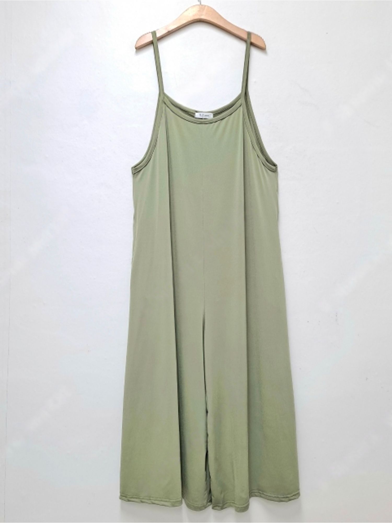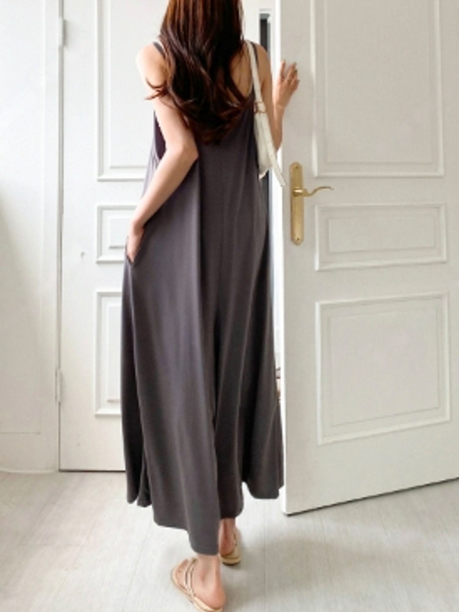 輕薄彈性/涼感吊帶褲/平口/細肩帶(不可調)/背心無袖/雙口袋 - 休閒居家渡假簡約百搭素面彈性吊帶褲七分連身褲深灰色卡其綠色黑色