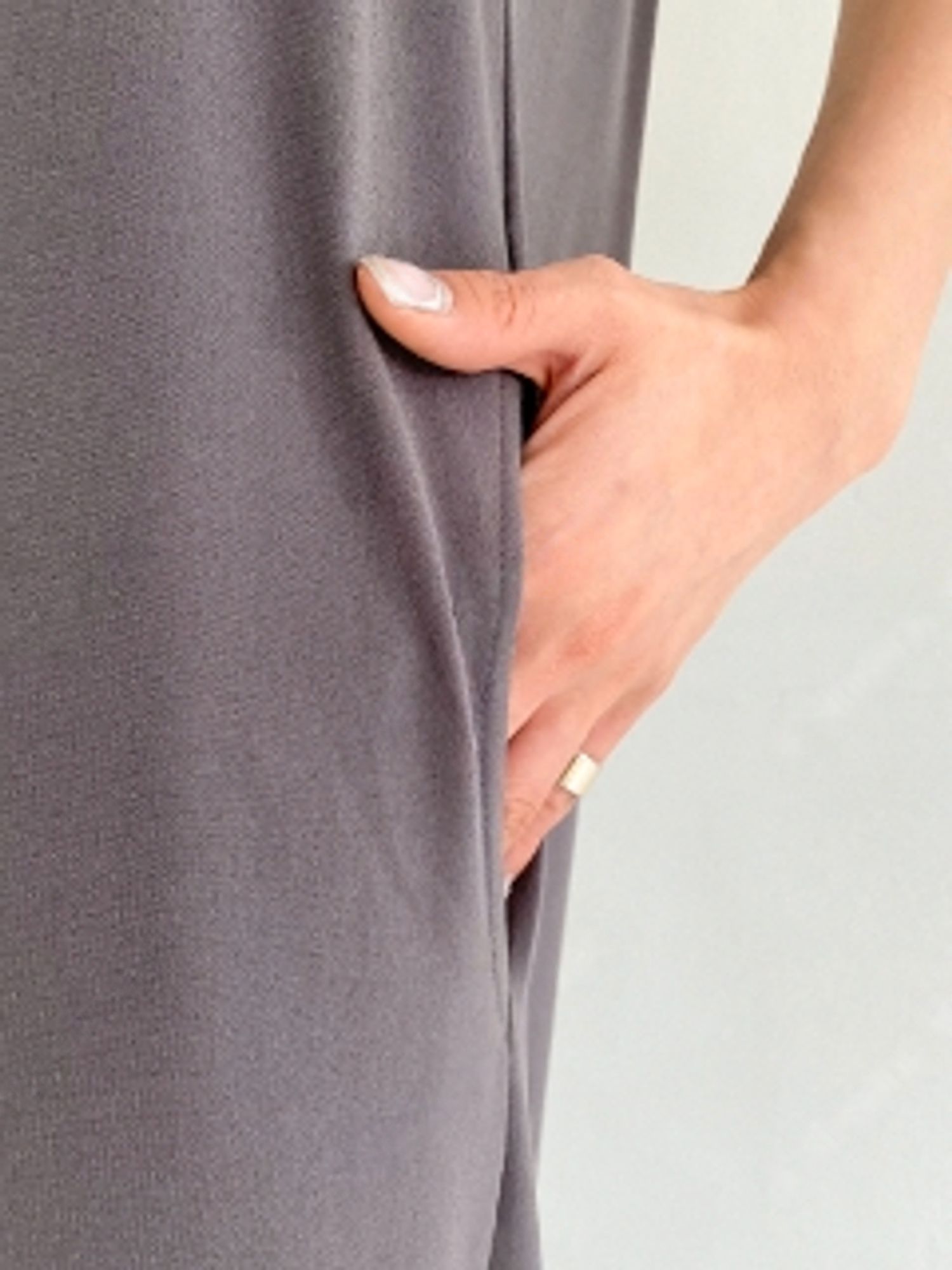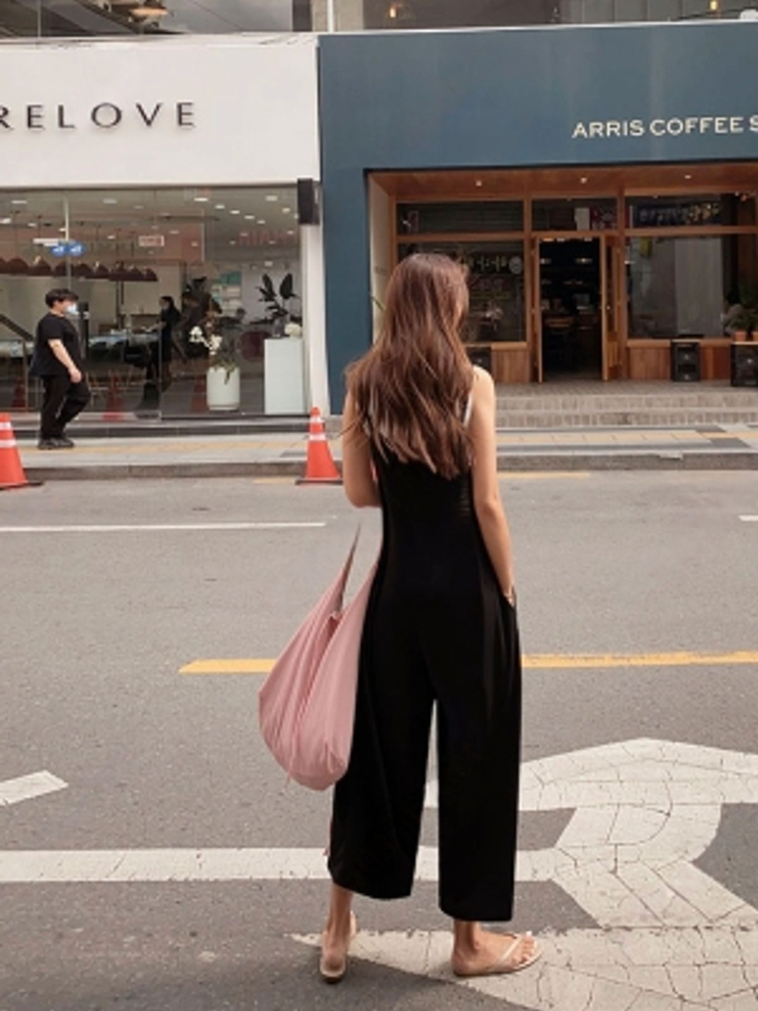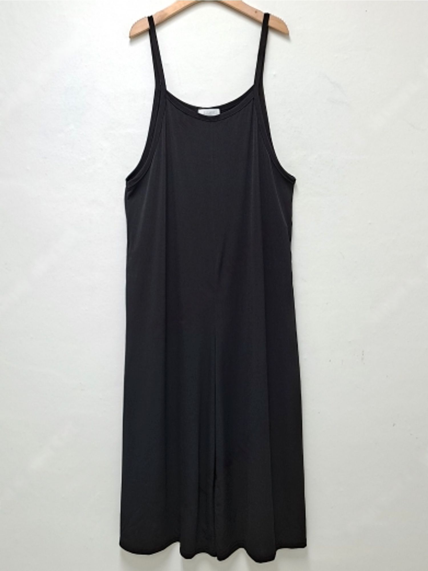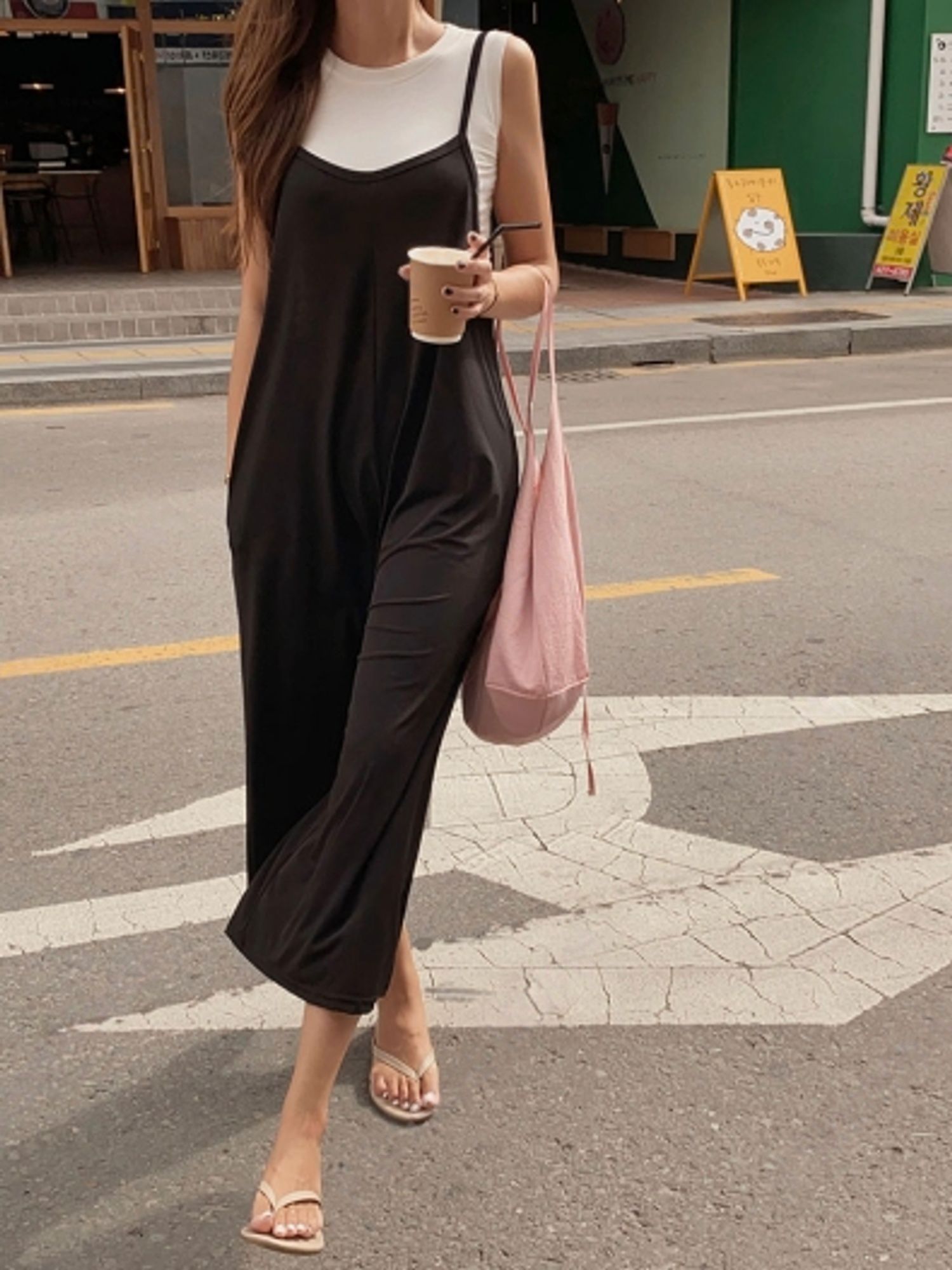 輕薄彈性/涼感吊帶褲/平口/細肩帶(不可調)/背心無袖/雙口袋 - 休閒居家渡假簡約百搭素面彈性吊帶褲七分連身褲深灰色卡其綠色黑色